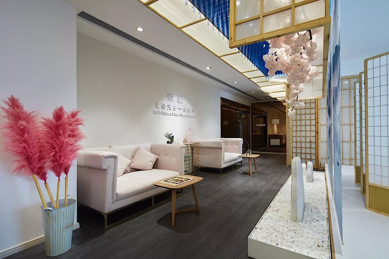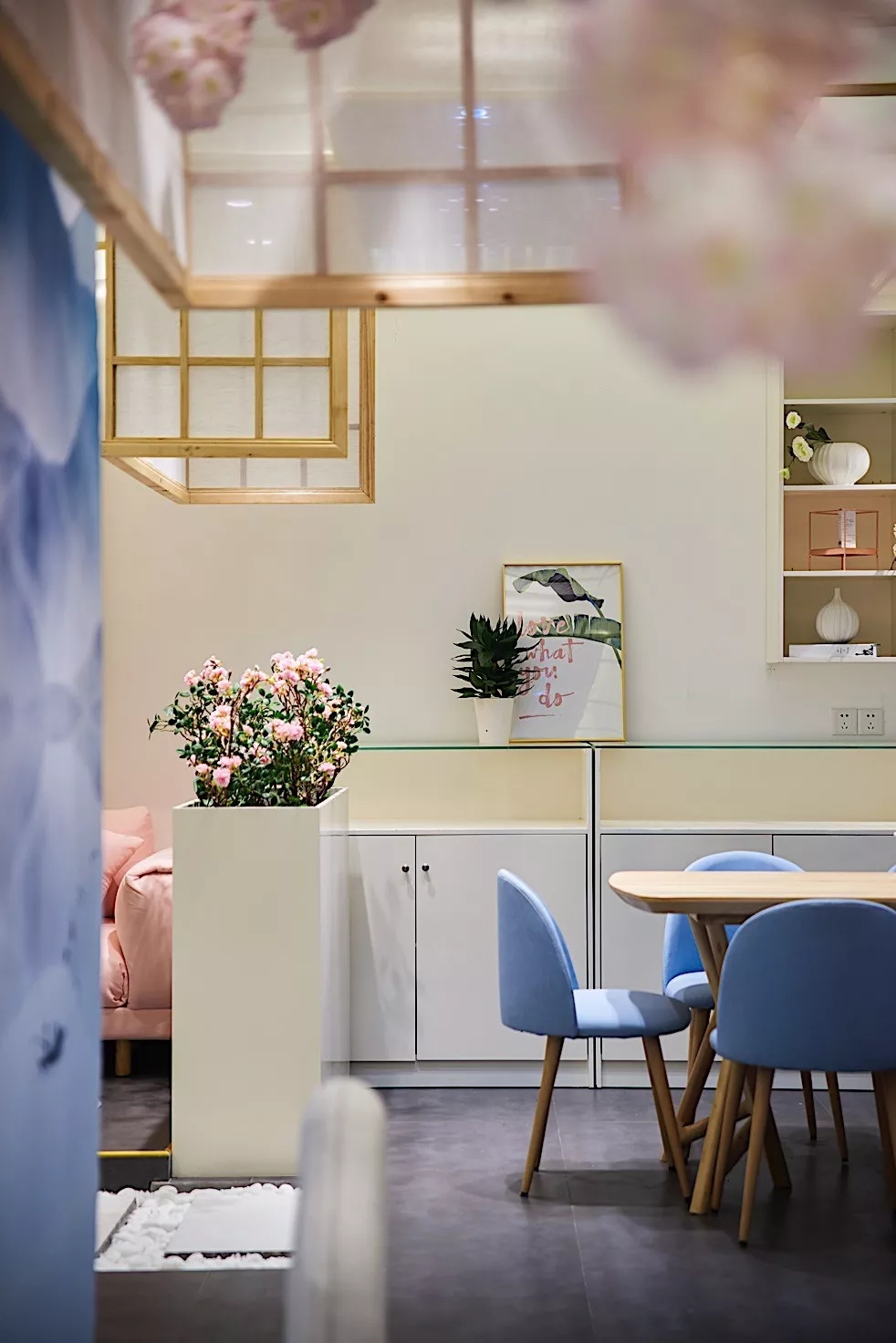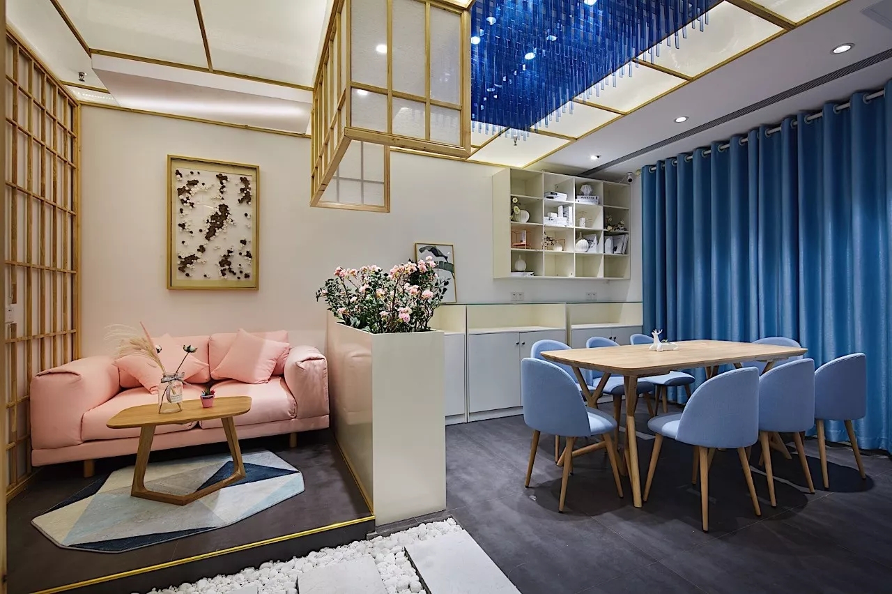 入门休息区造景以代表日系的樱花,白色鹅卵石、淡蓝的纱帘元素结合,使空间散发出文艺清新的气息。软装搭配以粉色的沙发、蓝色桌椅、精致的定制挂画体现出现代女性的柔美,顶部蓝色亚克力吊顶点缀营造出一个舒适,安逸的休闲氛围。在这个专属于女人的空间,放松与惬意都以在这里实现。
