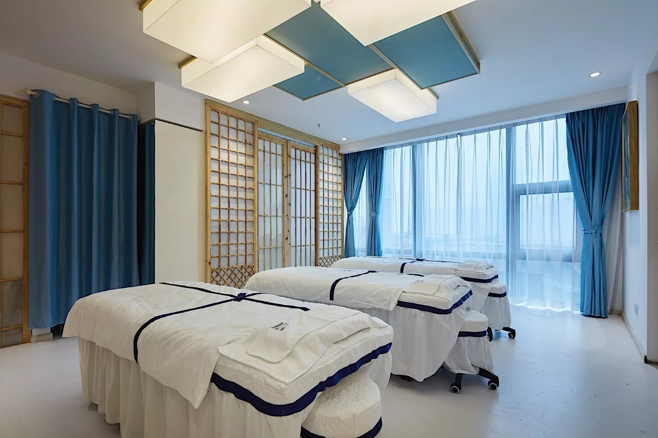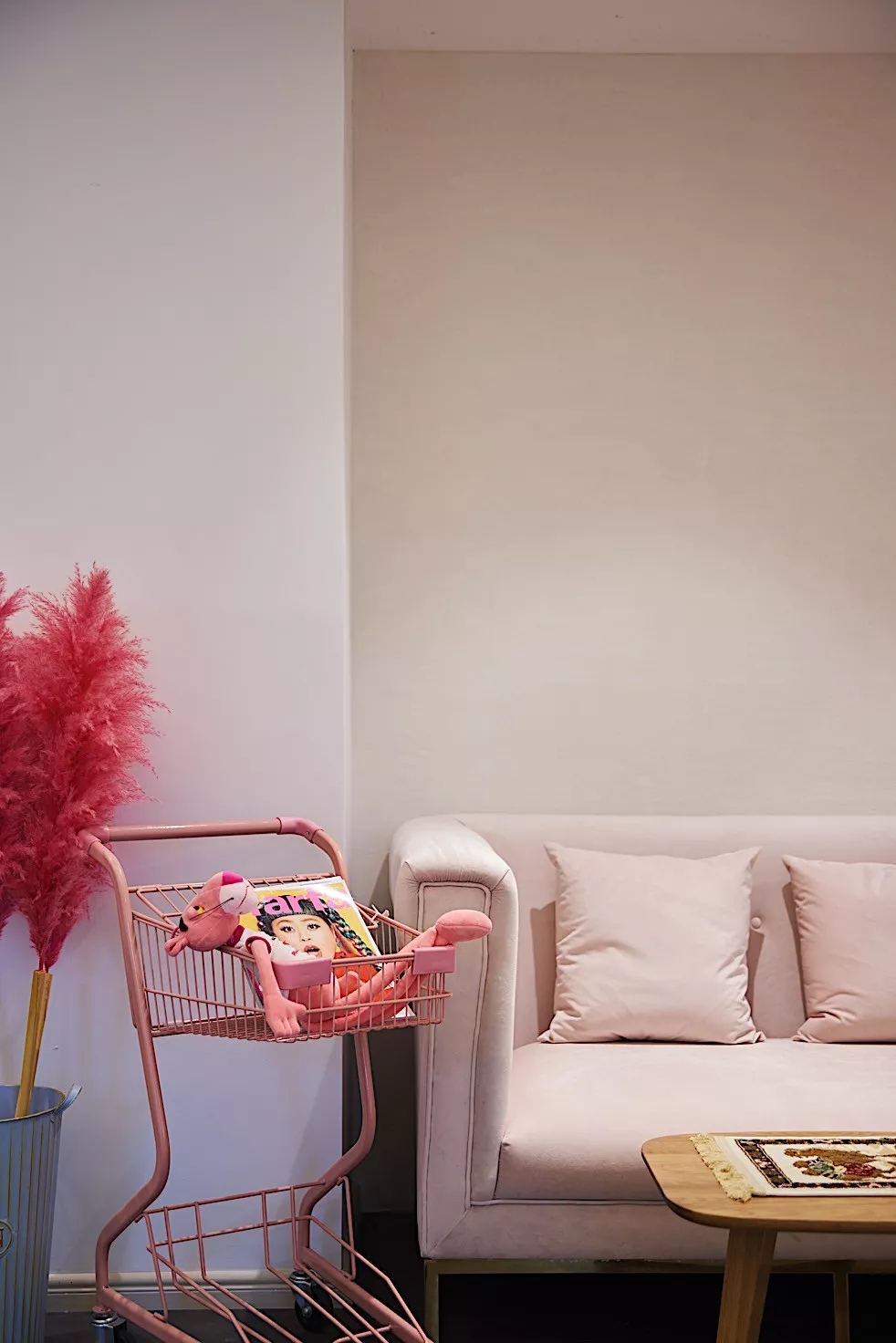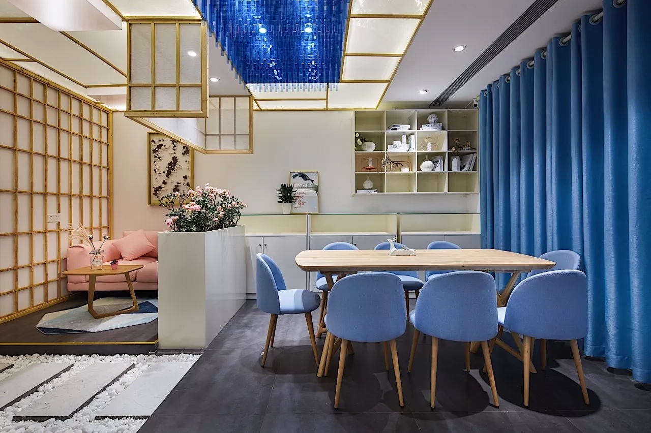 入门休息区造景以代表日系的樱花,白色鹅卵石、淡蓝的纱帘元素结合,使空间散发出文艺清新的气息。软装搭配以粉色的沙发、蓝色桌椅、精致的定制挂画体现出现代女性的柔美,顶部蓝色亚克力吊顶点缀营造出一个舒适,安逸的休闲氛围。在这个专属于女人的空间,放松与惬意都以在这里实现。