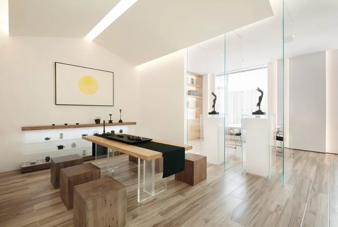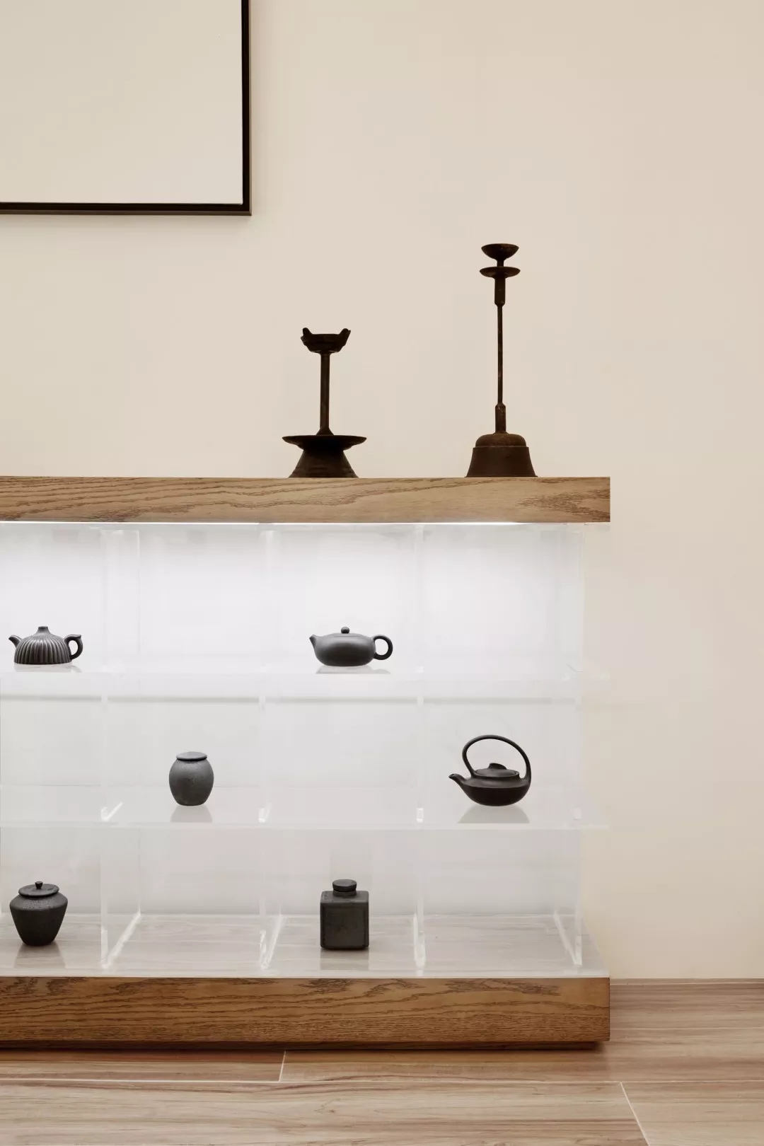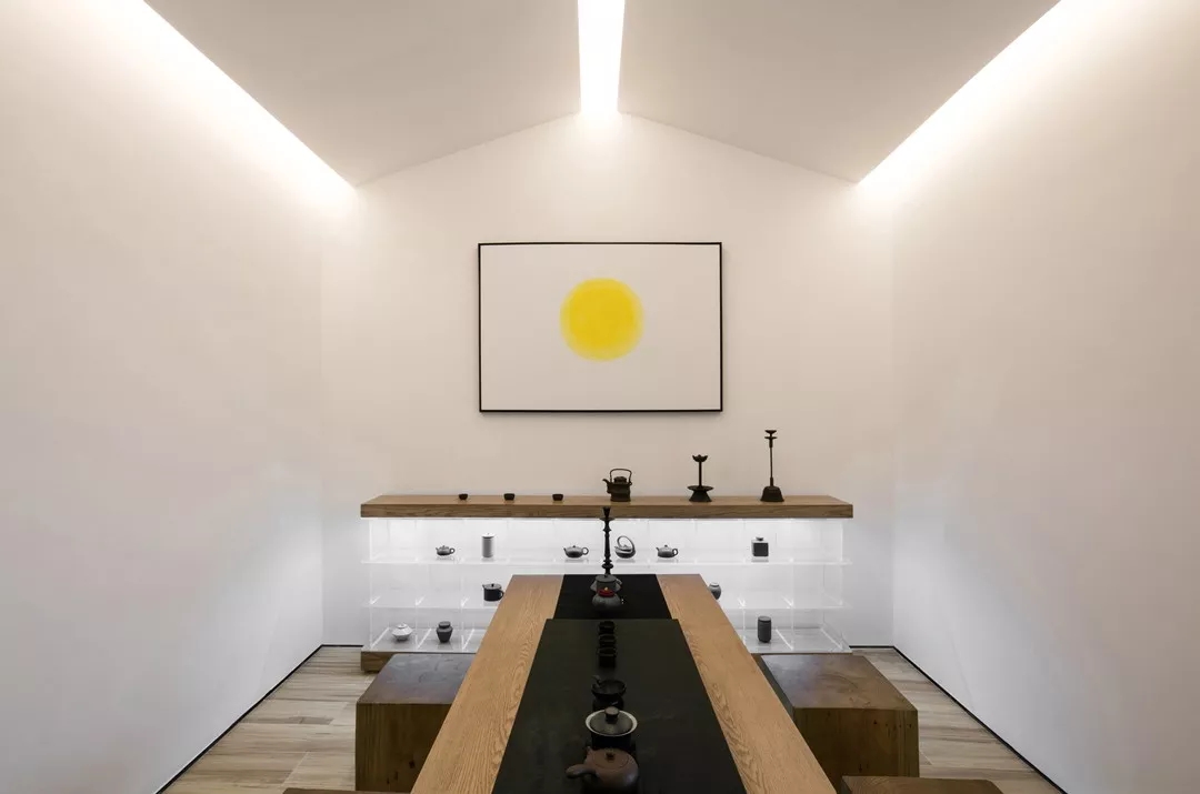 陈列柜是设计师为打造空间造型艺术所创作的原创作品,利用陈列艺术的感染力结合时尚文化的的运用,在空间里有了一些互动。陈列的物品为紫砂壶,紫砂壶不仅能带给人视觉上的享受,更因为其制作原料的极度缺乏,成品的唯一性能所带来的升值和投资的空间。从明代开始,紫砂壶就已经成为追索求藏的对象。