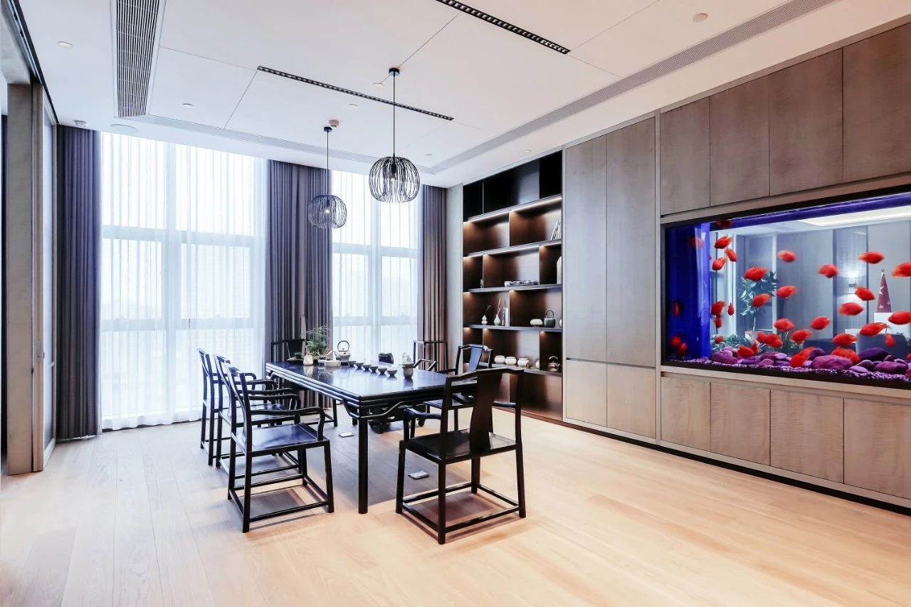 三层各有不同的面貌又有内在关联,再用一部很有未来科技感的电梯将三个层面串联起来,也是空间中的点睛之笔。