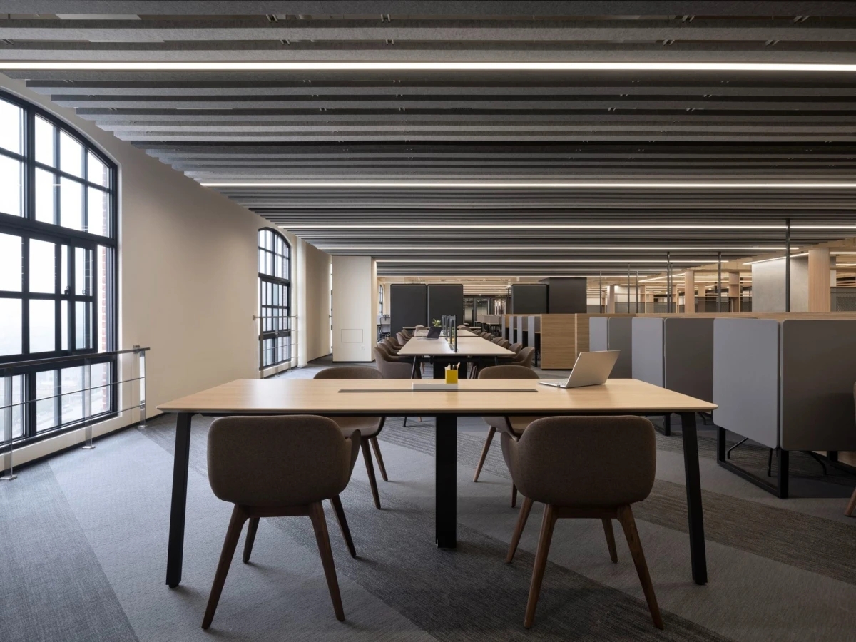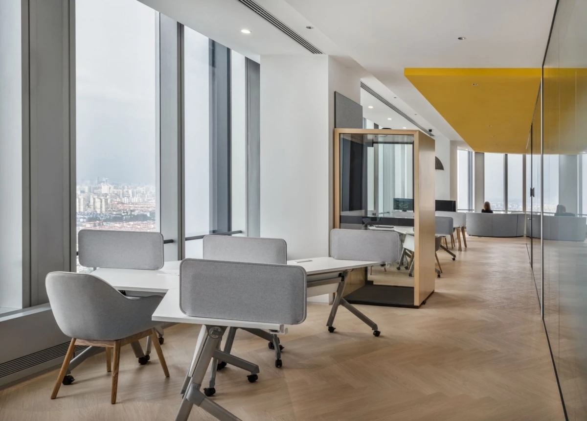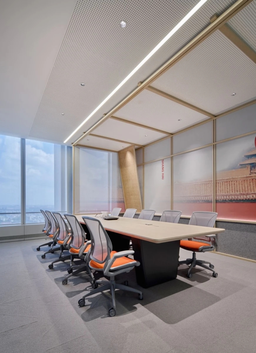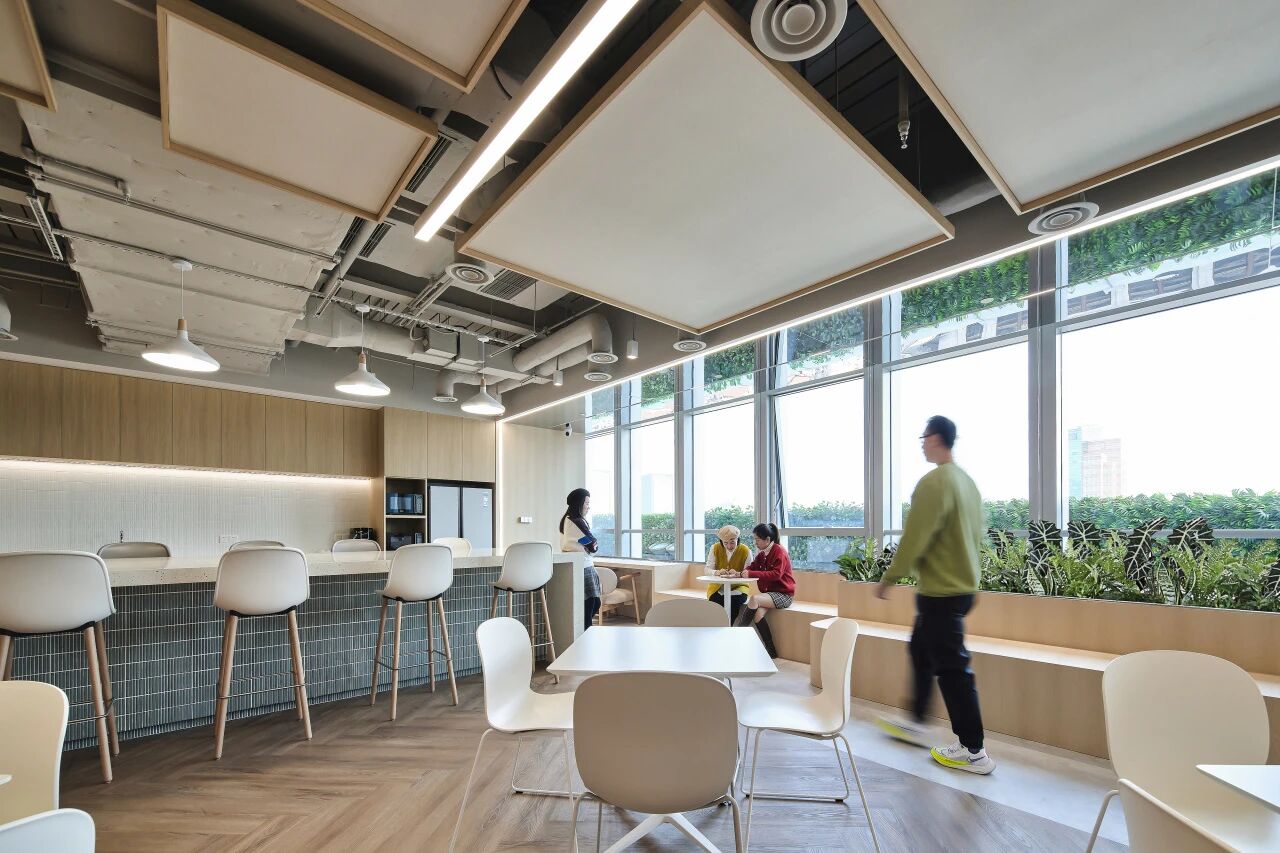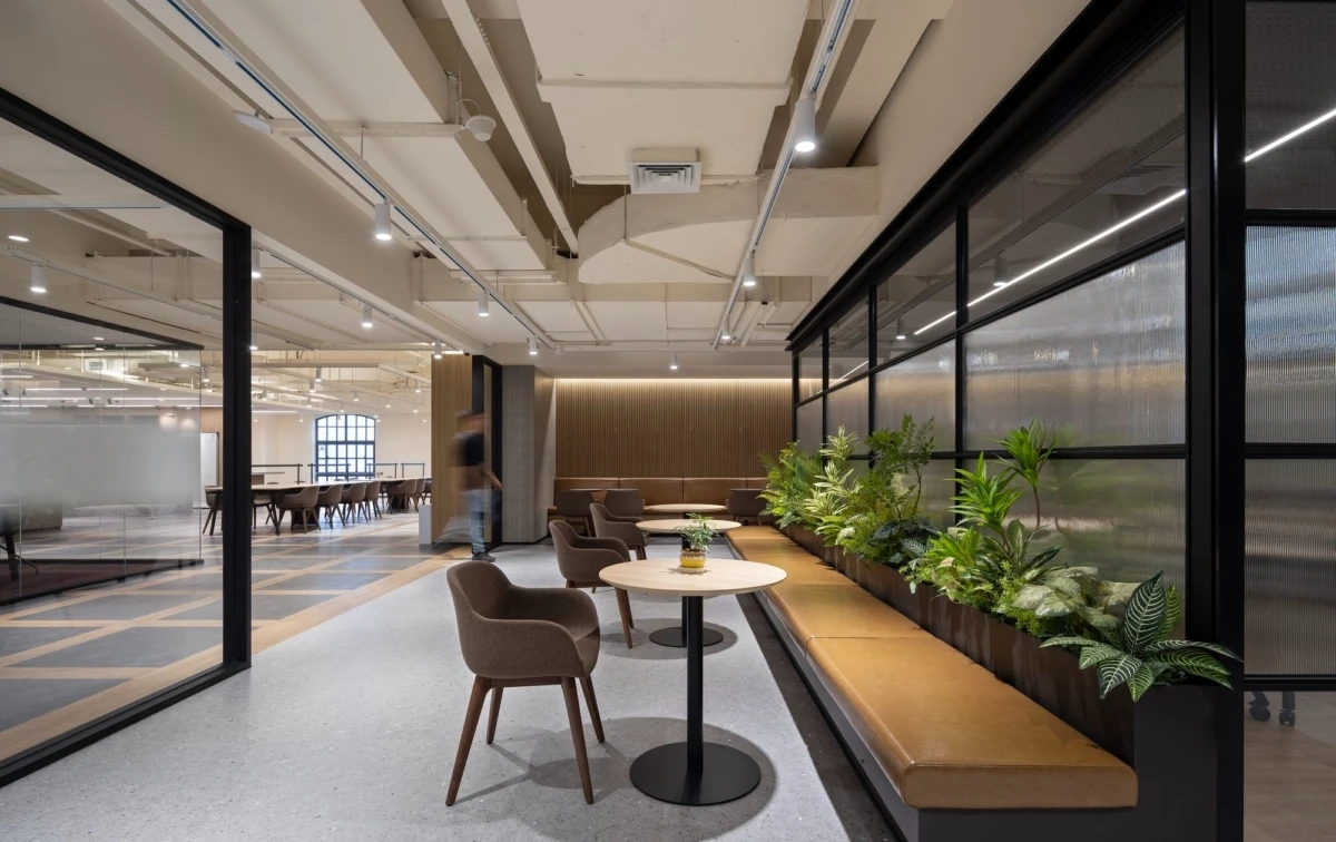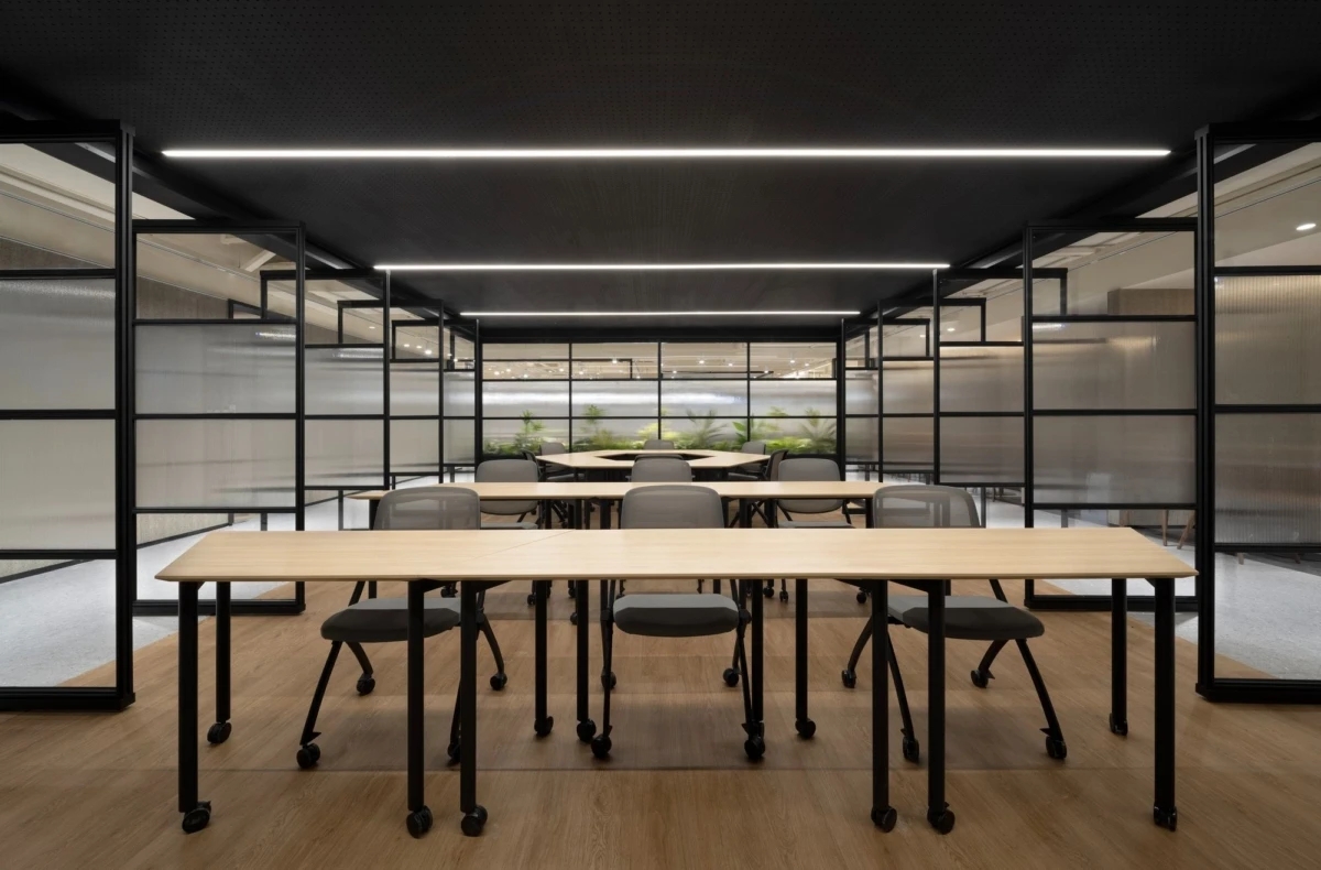 办公室的布局采用开放式的圆形设计,作为一个动态的连接点,巧妙地将不同功能区域连接在一起。无论是办公室、非正式协作空间,还是培训室,都被设计成能够无缝过渡的空间。开放的圆形布局打破了空间的隔阂,让整个办公室充满活力和流动性。通过使用磨砂玻璃和开放式隔墙,每个区域得以区分,但又不会造成封闭或压抑的感觉,保持了空间的通透感和舒适性。