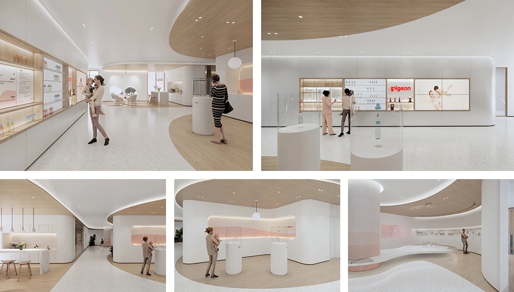 不同材料的质感对比,在统一的设计语言中又相互融合。空间以白色与木色构成了利落的体块关系,整体空间明亮开阔且简约自然。在统一的白色体块中,石材、发泡陶瓷与圆柱形白瓷砖的组合又形成丰富的层次感。