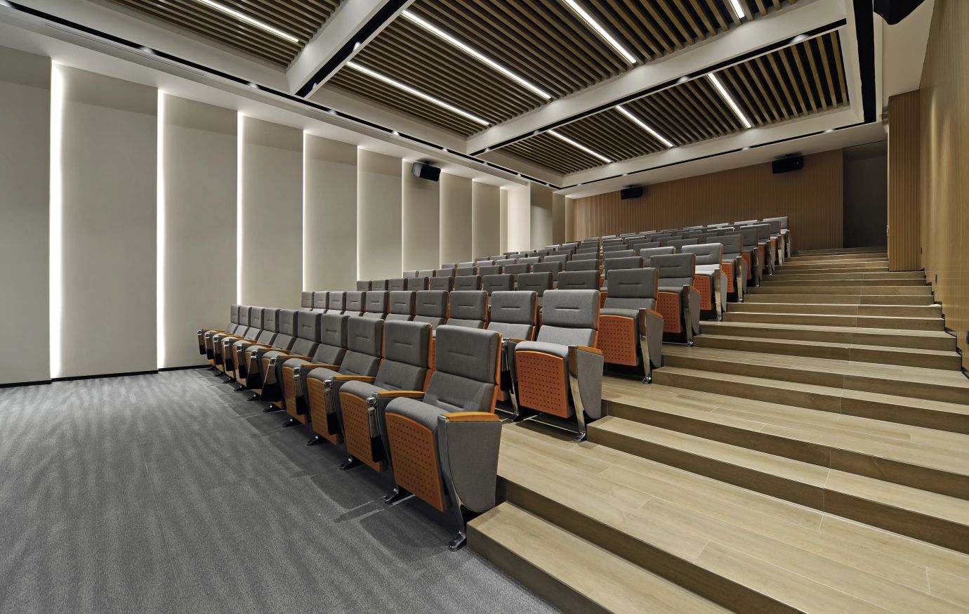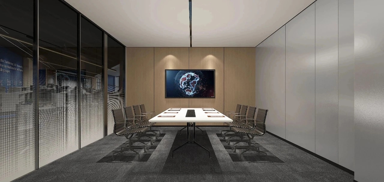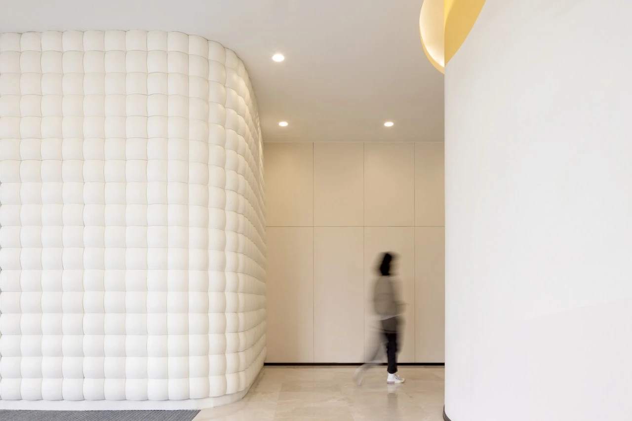 建筑空间被核心筒贯穿形成环形动线,根据空间机能演变为接待、办公两个内部环线,提供了最便捷的空间体验。建筑层高东高西低,且东侧拥有开阔视野。于是,由一个造型新颖的天花结构将人向东侧大堂引导,开放创新的国际化品牌印象随之呈现。内部空间融合了精湛的工艺及高雅的陈设布置,营造出稳重大气的企业专业形象。