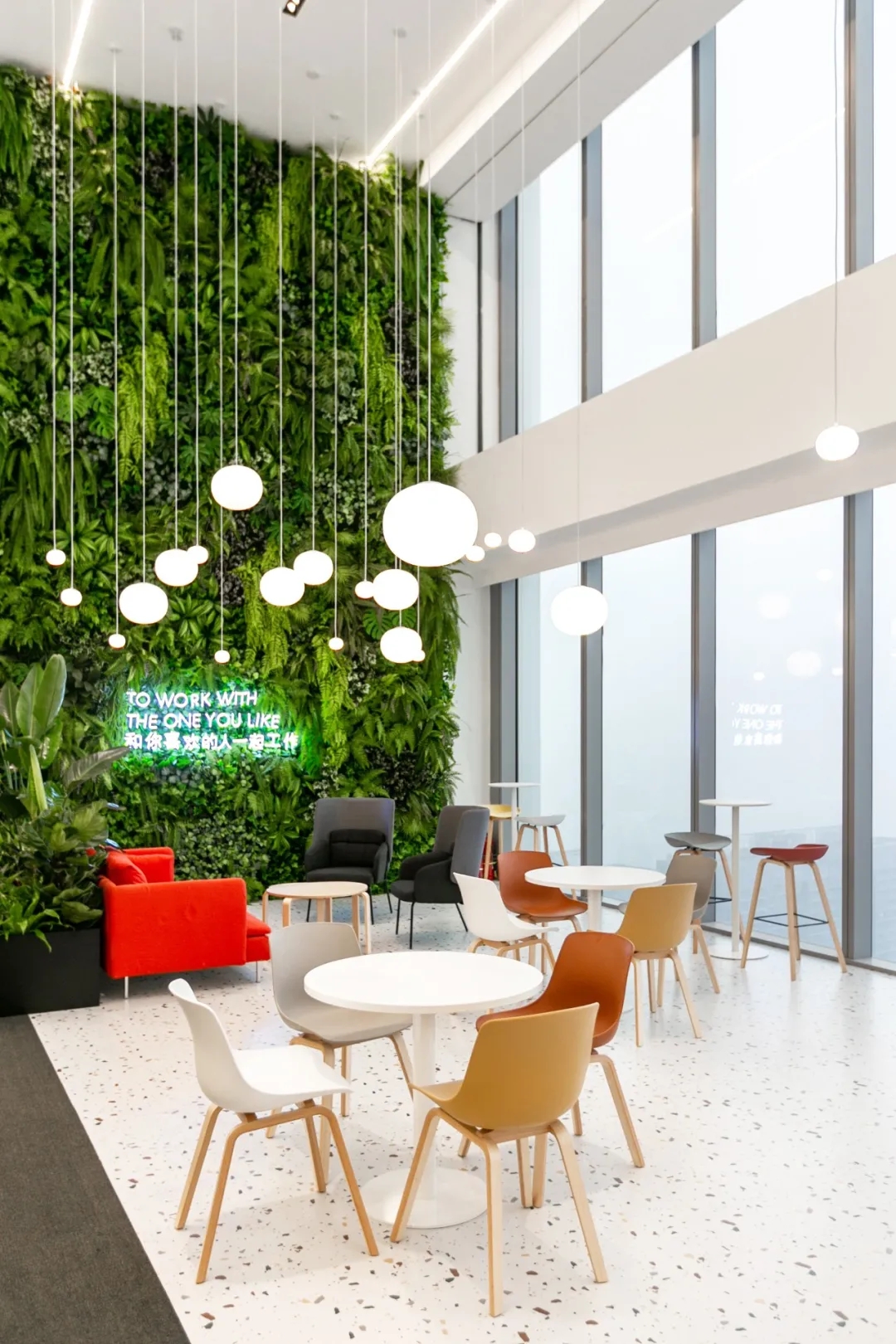 我们希望能将建筑外的绿色延伸至办公场所内,内外呼应,为大家带来一种更加贴近自然的感受,即使在钢筋水泥的城市生活中也能与自然共呼吸。在办公区域两端,我们设置两个植物池作为隔断和小型休息区域,实现分割功能的同时也丰富了室内空间的色彩,打破了枯燥的办公氛围。