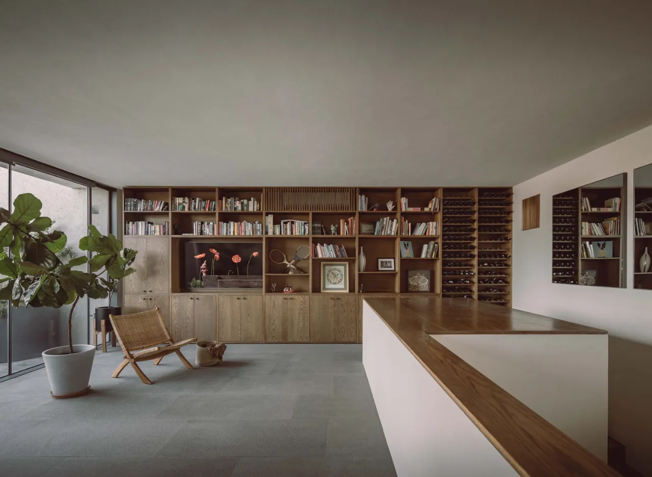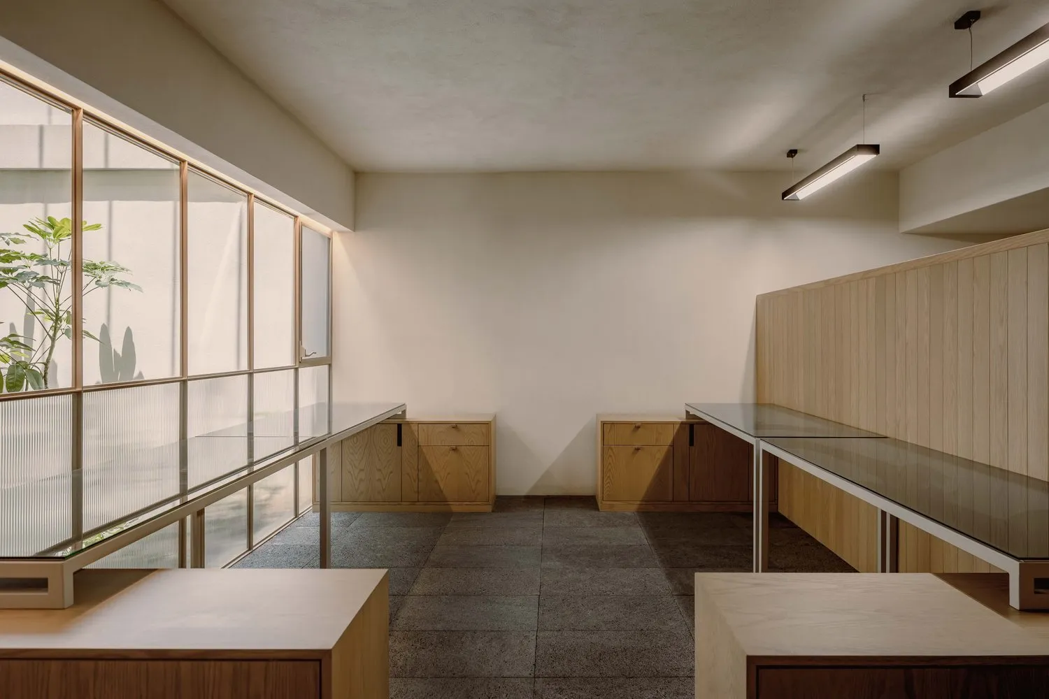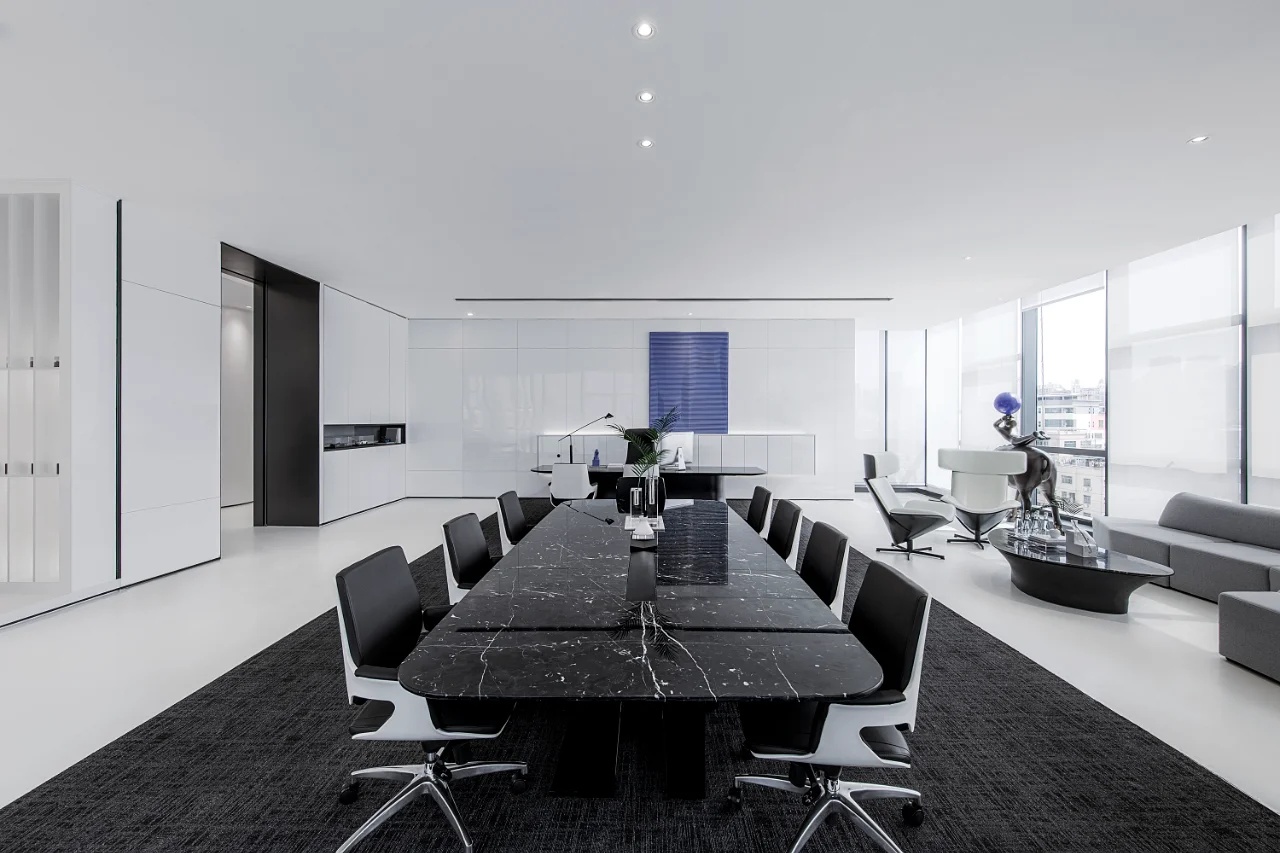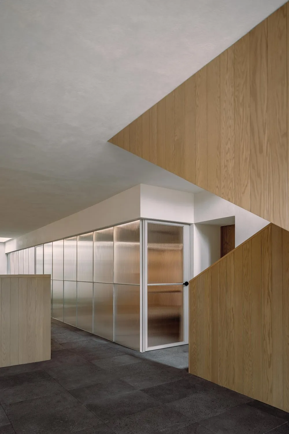 该委托项目包括将现有房屋改建成一家律师事务所的办公室。原有的唯一庭院被用作等候和接待室的半开放空间。从街道上可以通过一个铺有火山石地面的坡道直接进入办公室,坡道覆盖了底层和上层的地面,将整个空间统一起来,并作为家具和其他元素的基座,将不同的空间限定在一起。前厅是优先考虑的地方,在现有的墙壁、不透明的玻璃隔断、家具和楼梯之间划定了界限。将会议室、工作场所和衣帽间设在底层,解决了方案问题。玻璃隔断将主会议室和一个开放式工作空间隔开,并将庭院的景色尽收眼底。
