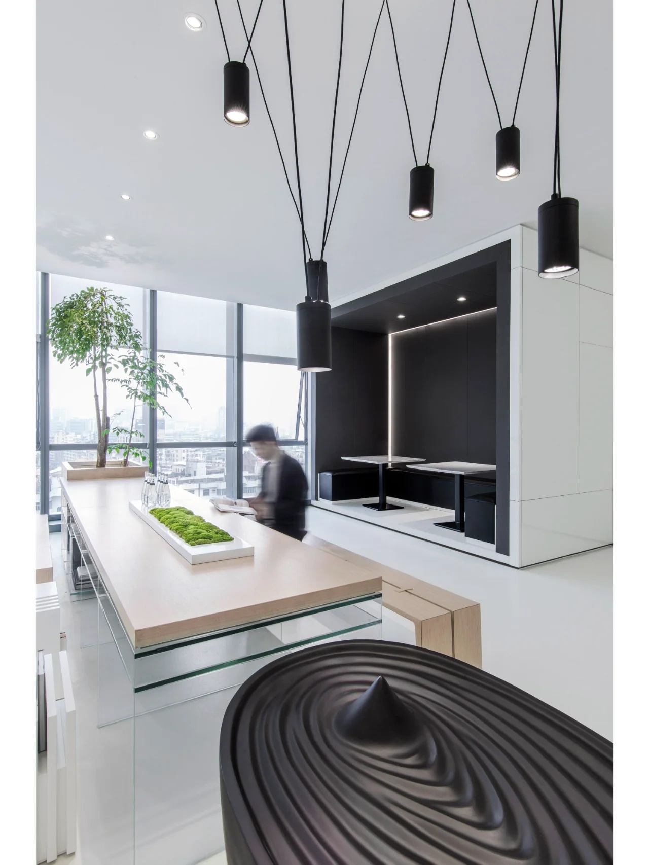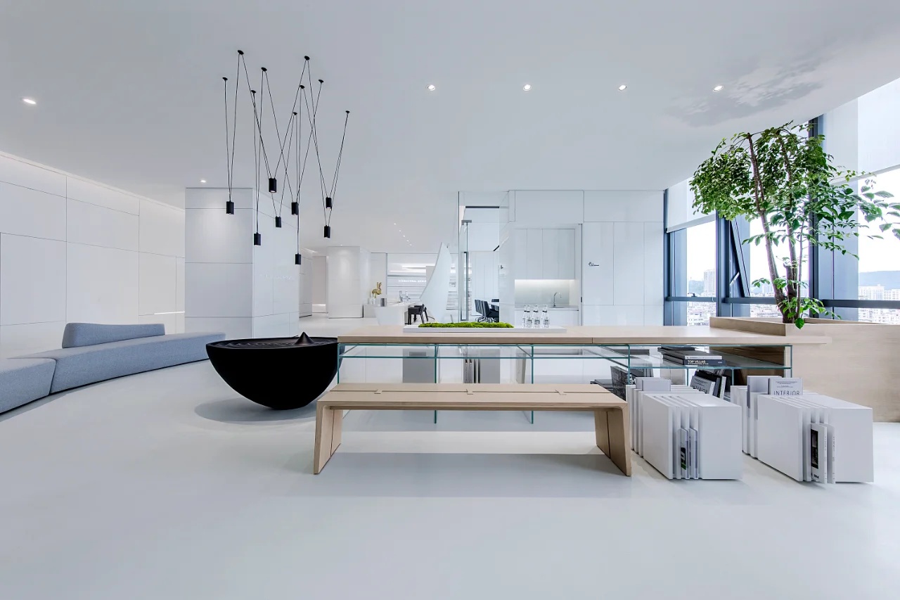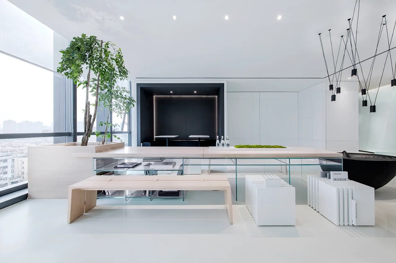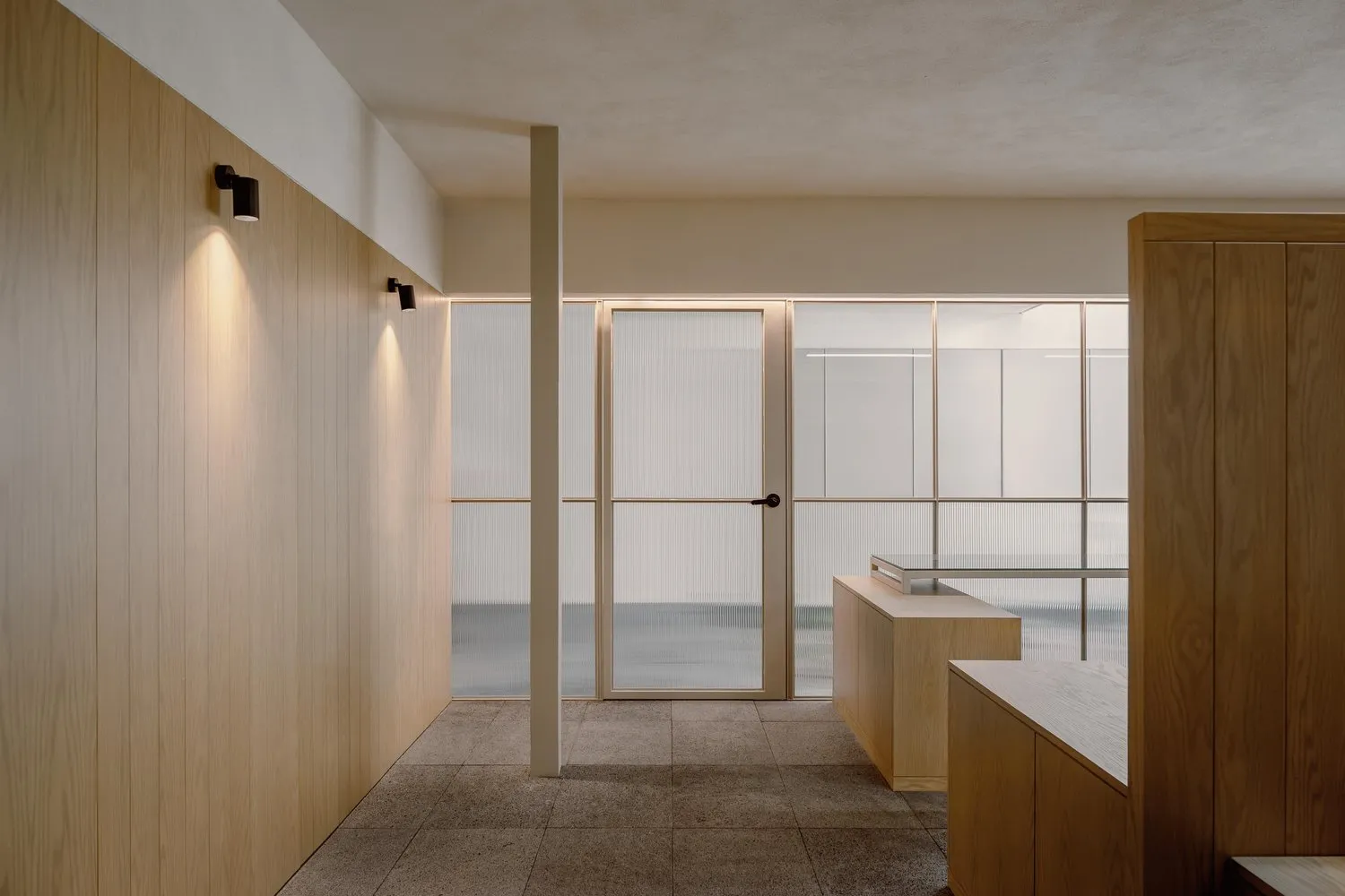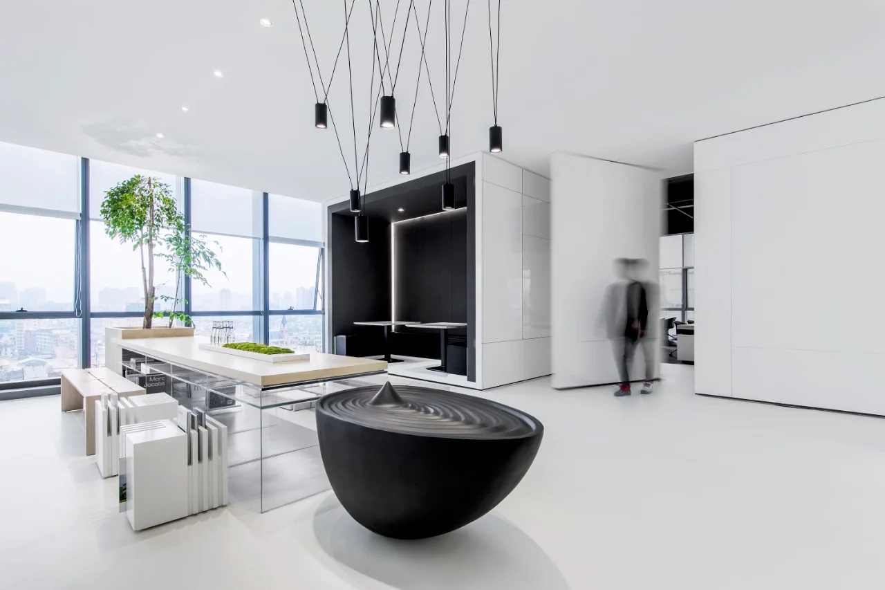 该委托项目包括将现有房屋改建成一家律师事务所的办公室。原有的唯一庭院被用作等候和接待室的半开放空间。从街道上可以通过一个铺有火山石地面的坡道直接进入办公室,坡道覆盖了底层和上层的地面,将整个空间统一起来,并作为家具和其他元素的基座,将不同的空间限定在一起。前厅是优先考虑的地方,在现有的墙壁、不透明的玻璃隔断、家具和楼梯之间划定了界限。将会议室、工作场所和衣帽间设在底层,解决了方案问题。玻璃隔断将主会议室和一个开放式工作空间隔开,并将庭院的景色尽收眼底。