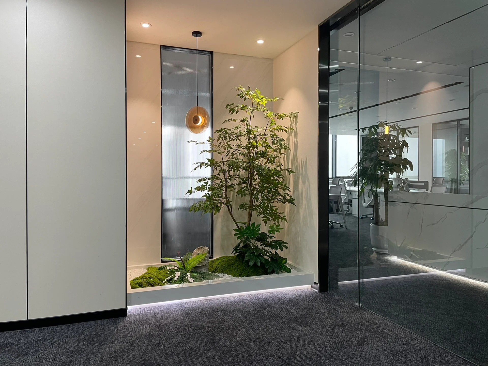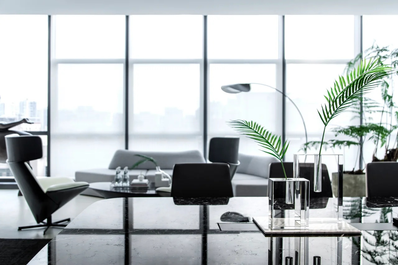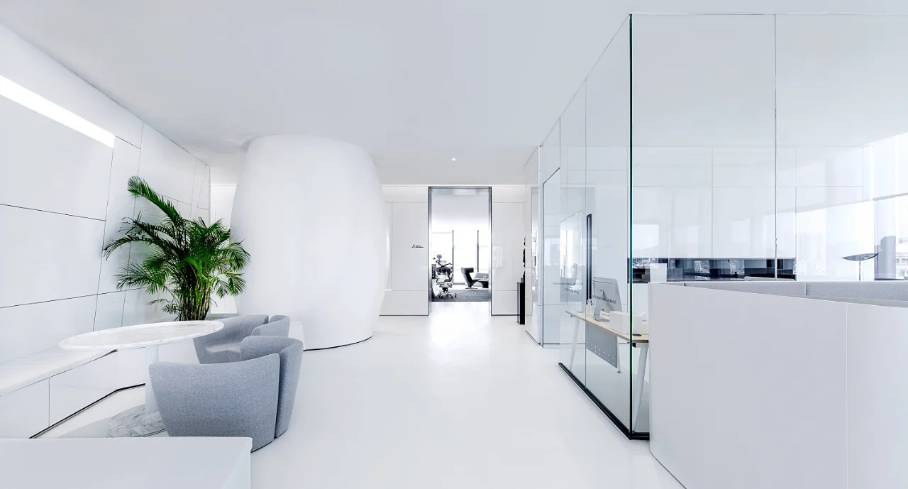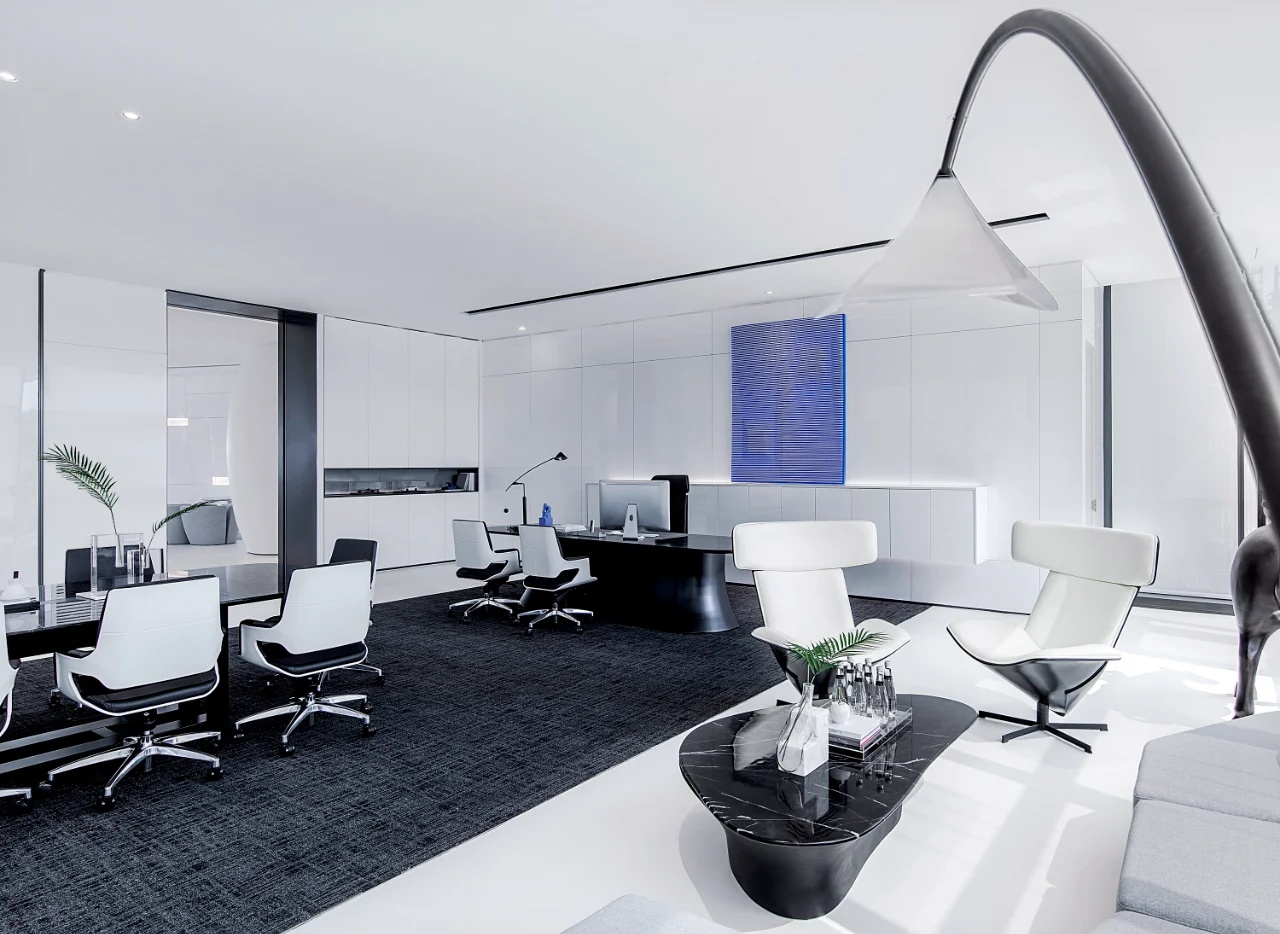 该委托项目包括将现有房屋改建成一家律师事务所的办公室。原有的唯一庭院被用作等候和接待室的半开放空间。从街道上可以通过一个铺有火山石地面的坡道直接进入办公室,坡道覆盖了底层和上层的地面,将整个空间统一起来,并作为家具和其他元素的基座,将不同的空间限定在一起。前厅是优先考虑的地方,在现有的墙壁、不透明的玻璃隔断、家具和楼梯之间划定了界限。将会议室、工作场所和衣帽间设在底层,解决了方案问题。玻璃隔断将主会议室和一个开放式工作空间隔开,并将庭院的景色尽收眼底。