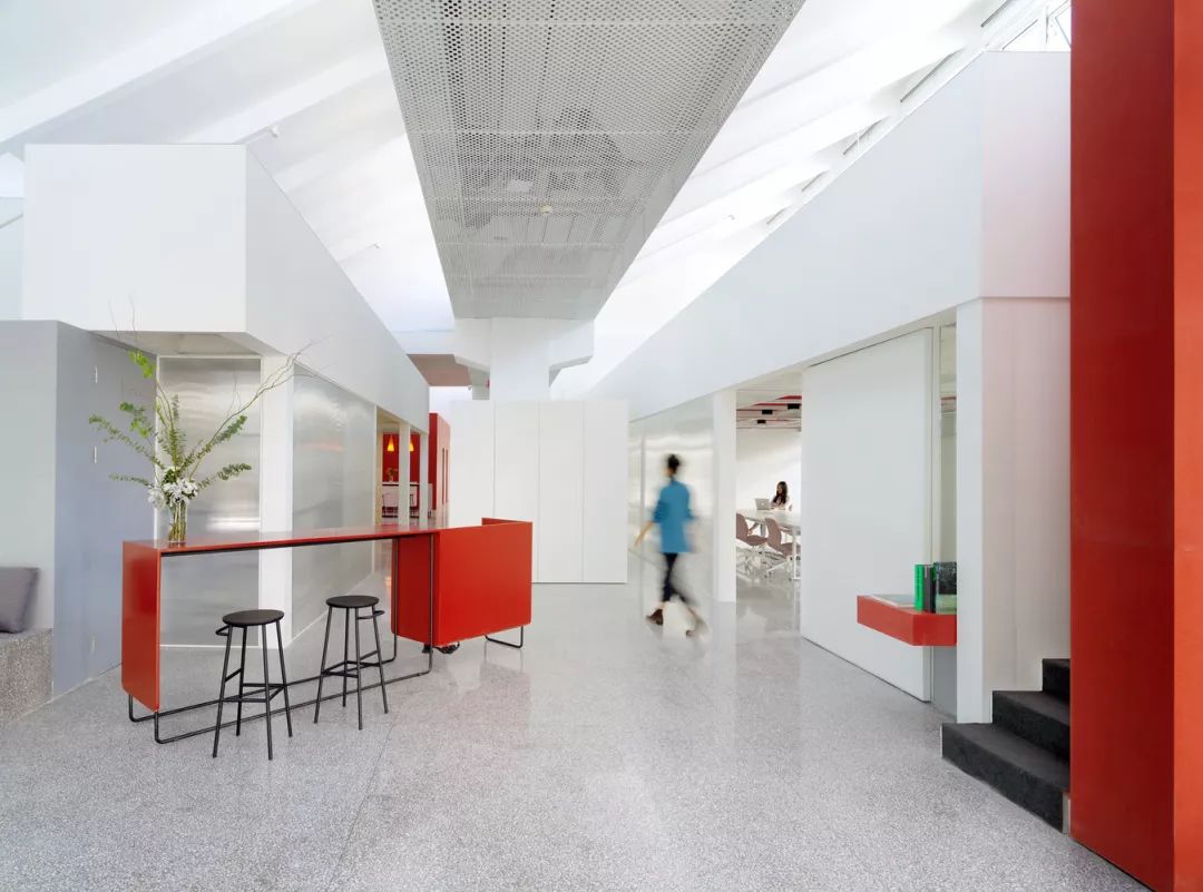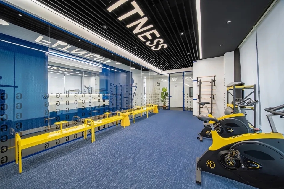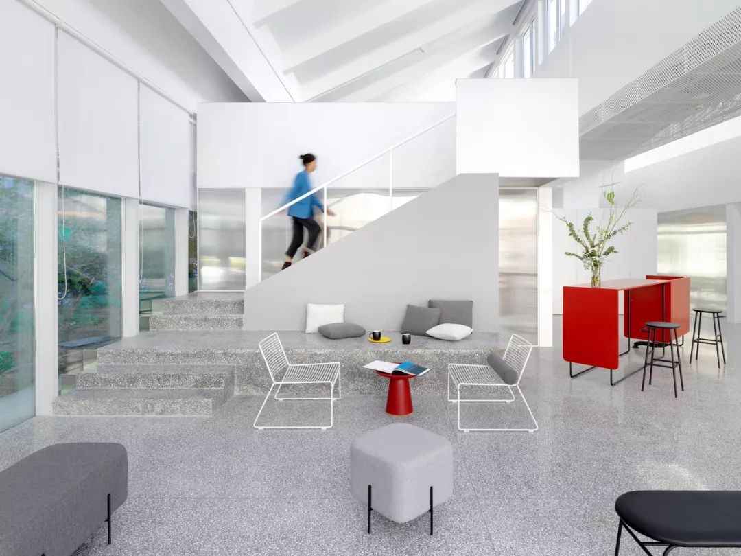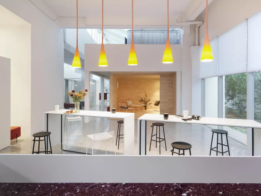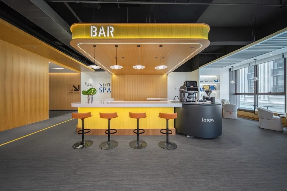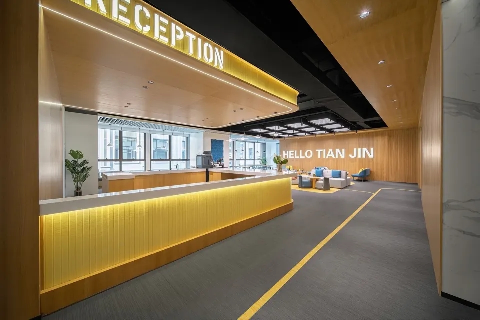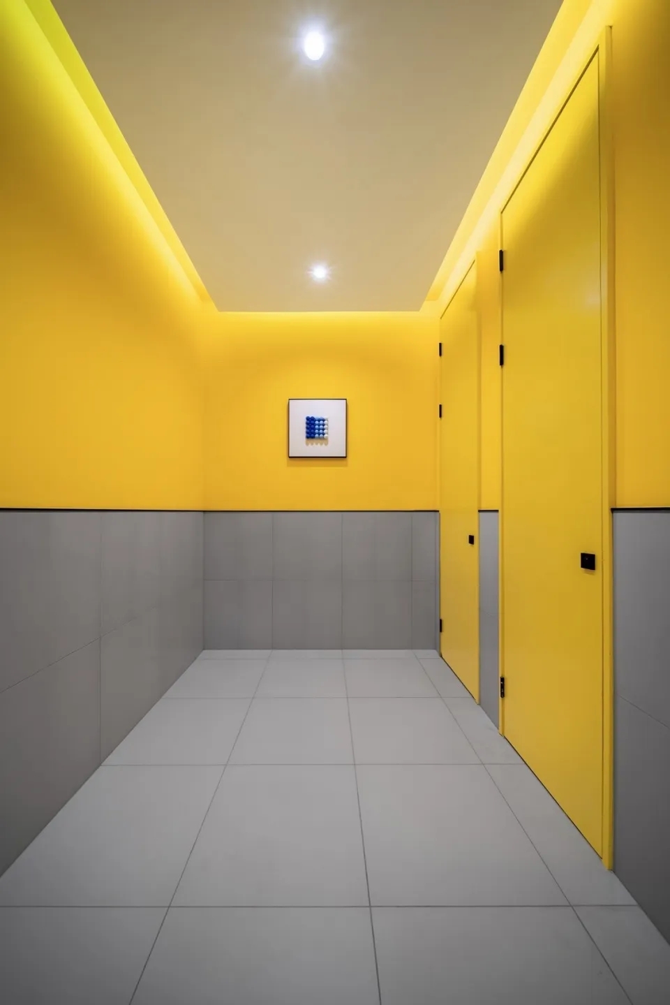 该空间既要有一定的开放与协作的办公空间特征,又要具有咖啡厅一般的松弛氛围,从而为整栋楼的客户提供一个更具参与感的、更高效的活力办公环境。设计以明亮的色彩引领空间,运用一根连续的黄色线条将接待空间、路演空间、会议空间、办公空间、运动空间、卫生间等串联整合,模糊各区域的边界,构成富有变化的动态秩序与高效便捷共创协作的流动空间。