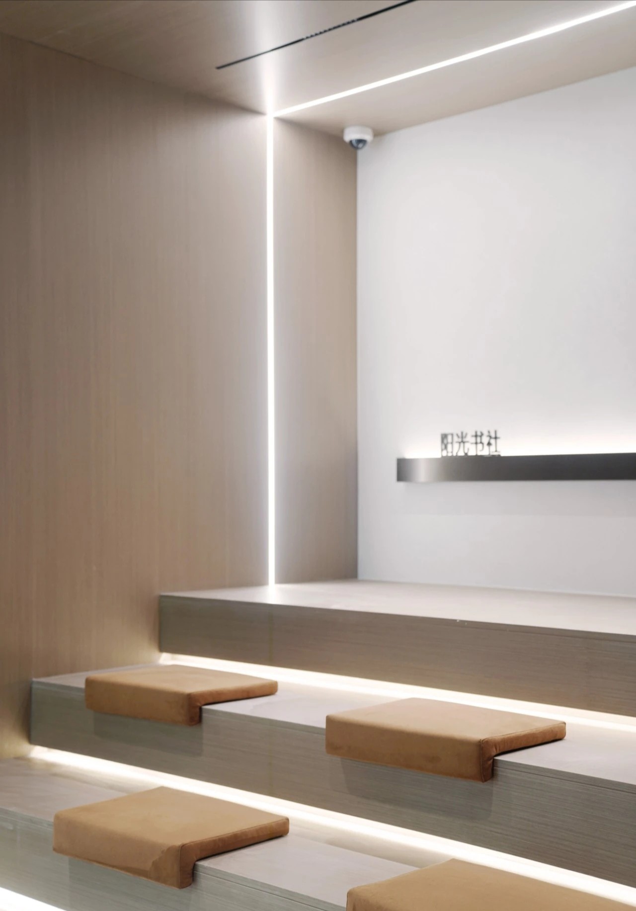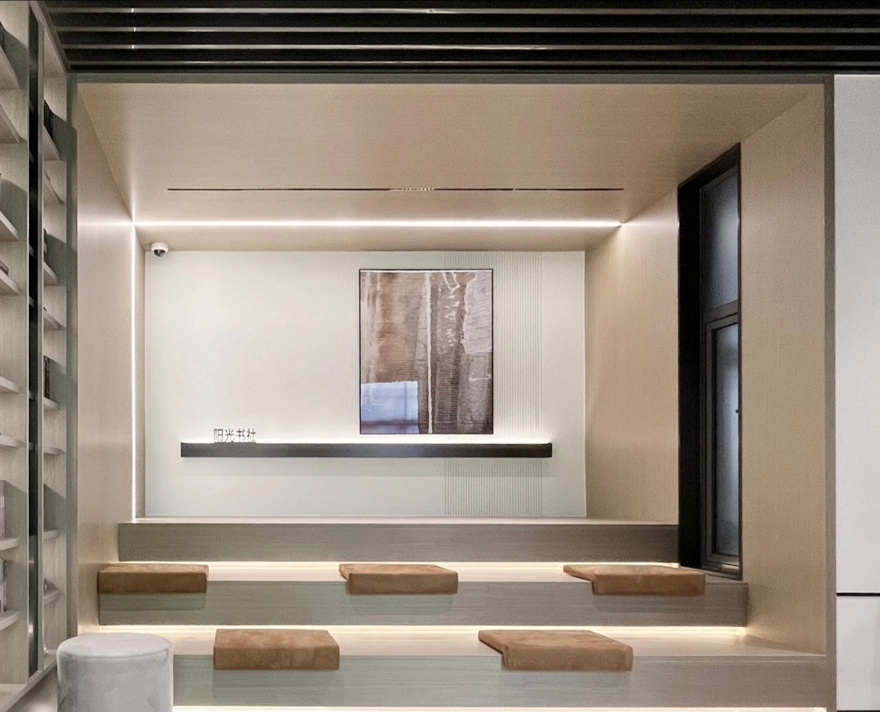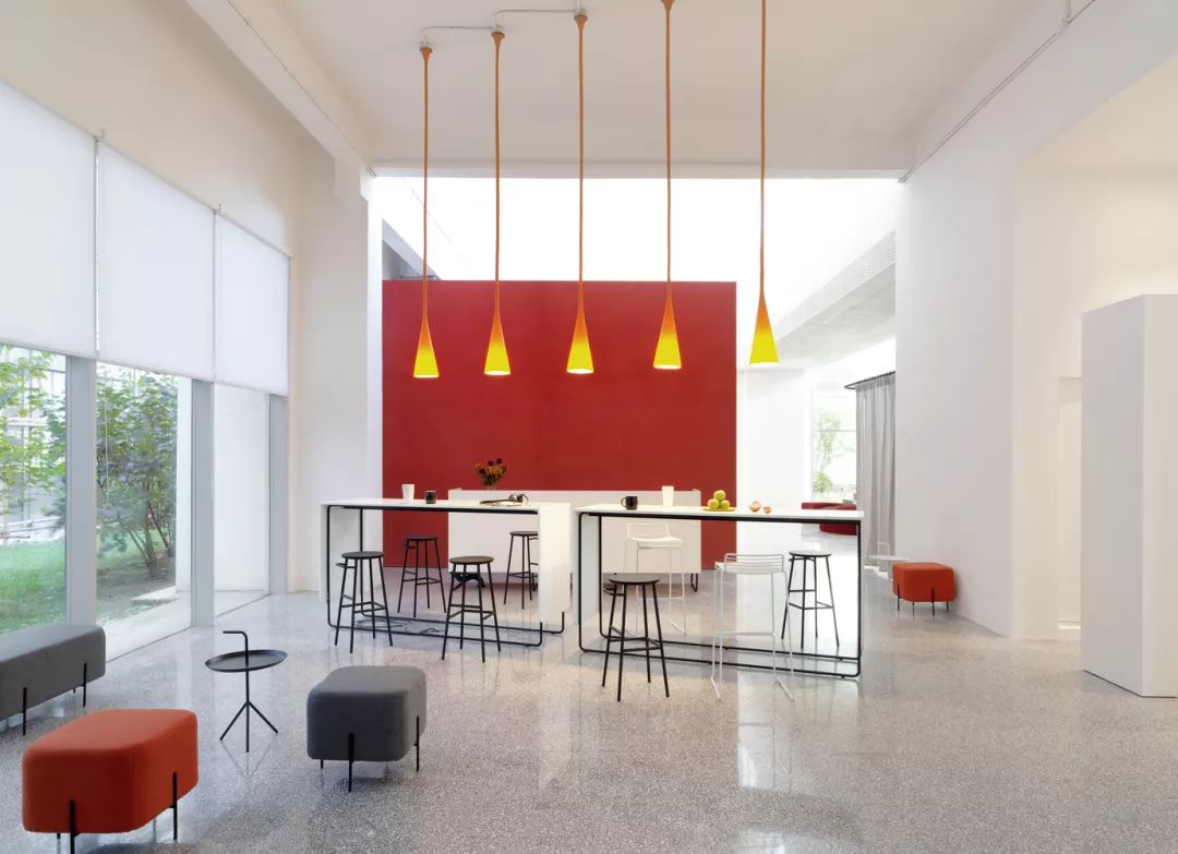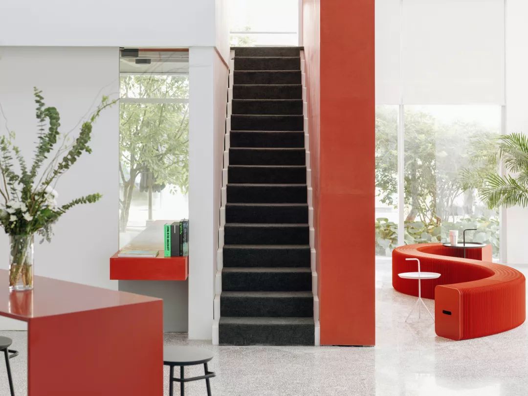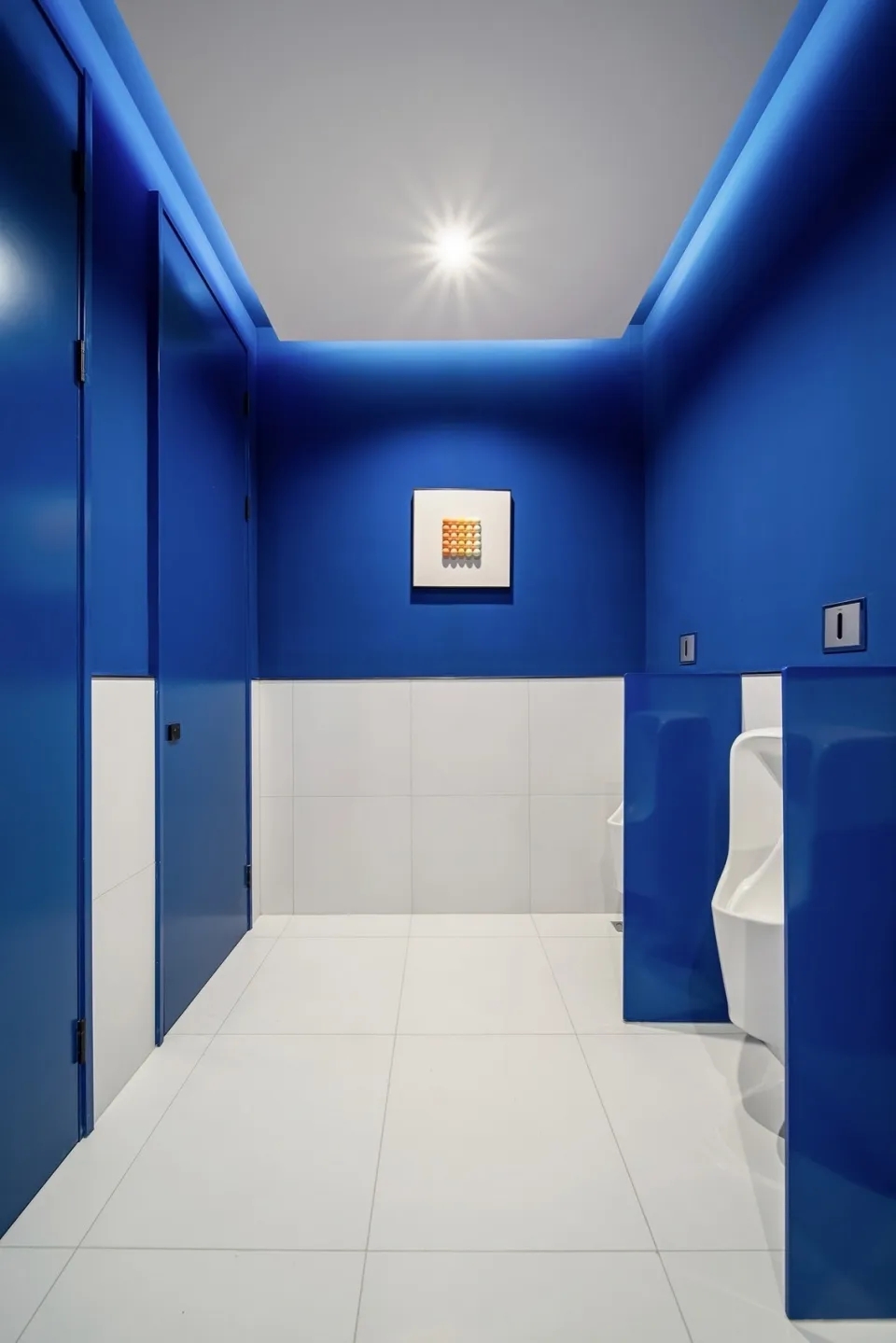 该空间既要有一定的开放与协作的办公空间特征,又要具有咖啡厅一般的松弛氛围,从而为整栋楼的客户提供一个更具参与感的、更高效的活力办公环境。设计以明亮的色彩引领空间,运用一根连续的黄色线条将接待空间、路演空间、会议空间、办公空间、运动空间、卫生间等串联整合,模糊各区域的边界,构成富有变化的动态秩序与高效便捷共创协作的流动空间。