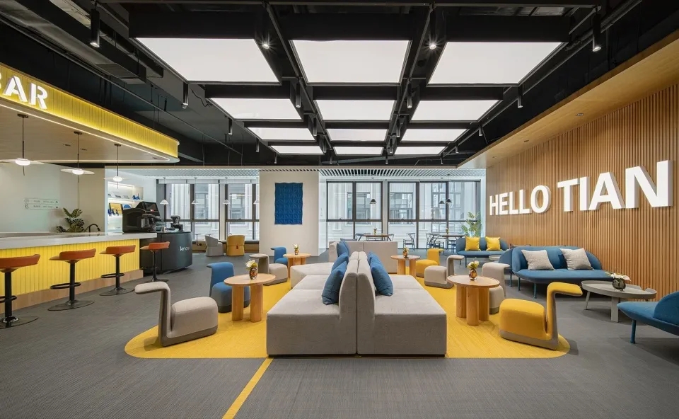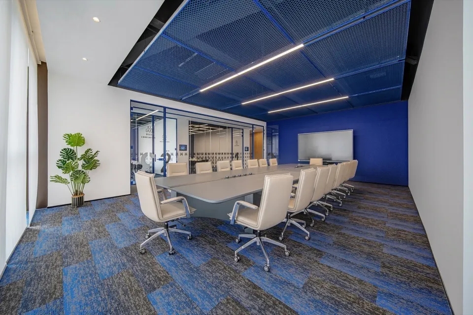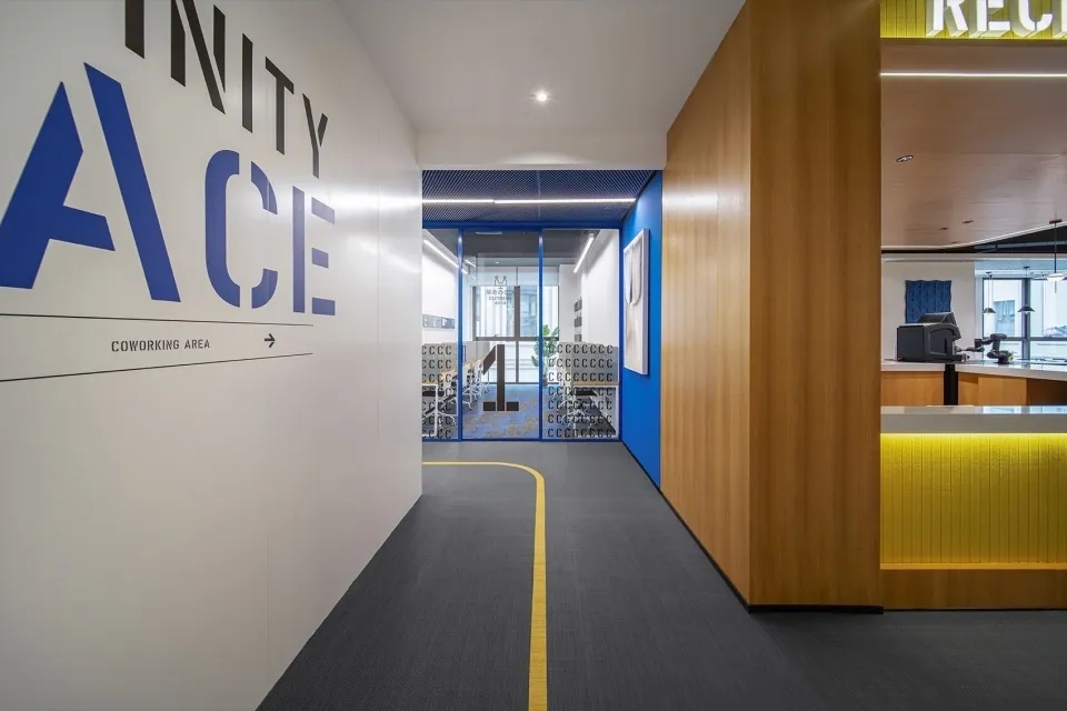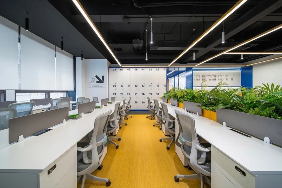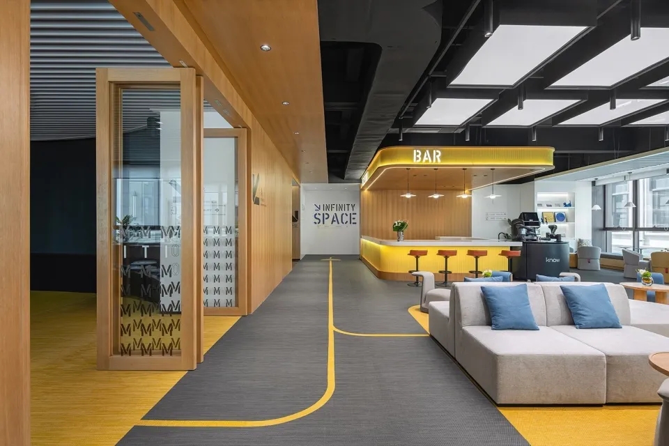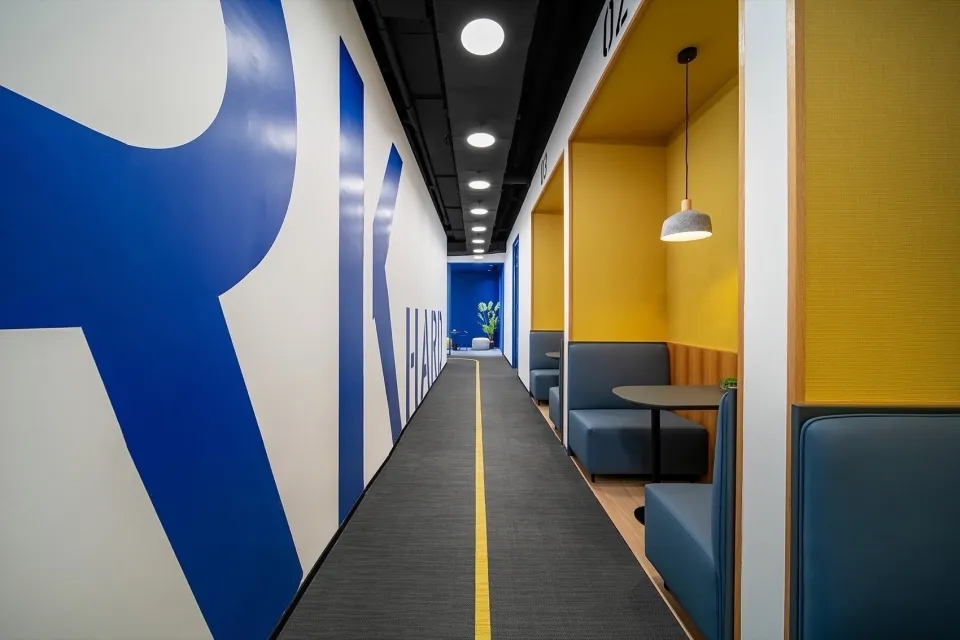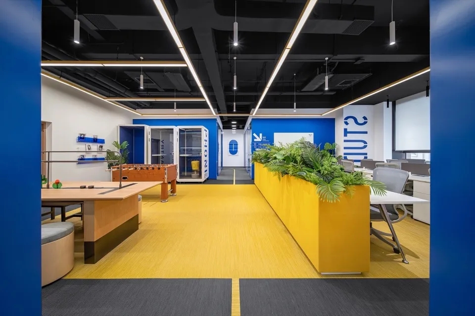 开放办公区用黄色编织地毯限定空间边界,黄色的地面与蓝色的墙面共同营造松弛而又充满趣味的办公氛围