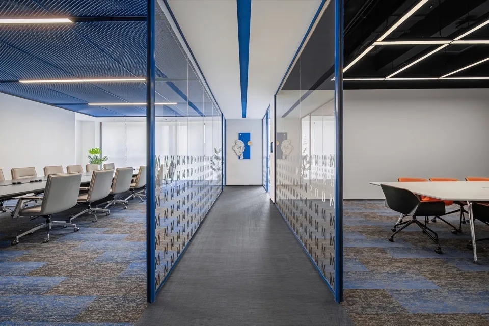办公空间用蓝色玻璃隔断划分出封闭办公室,玻璃上的标识区分不同房间,阵列排布的字母的保护隐私的同时也保证了空间的通透性