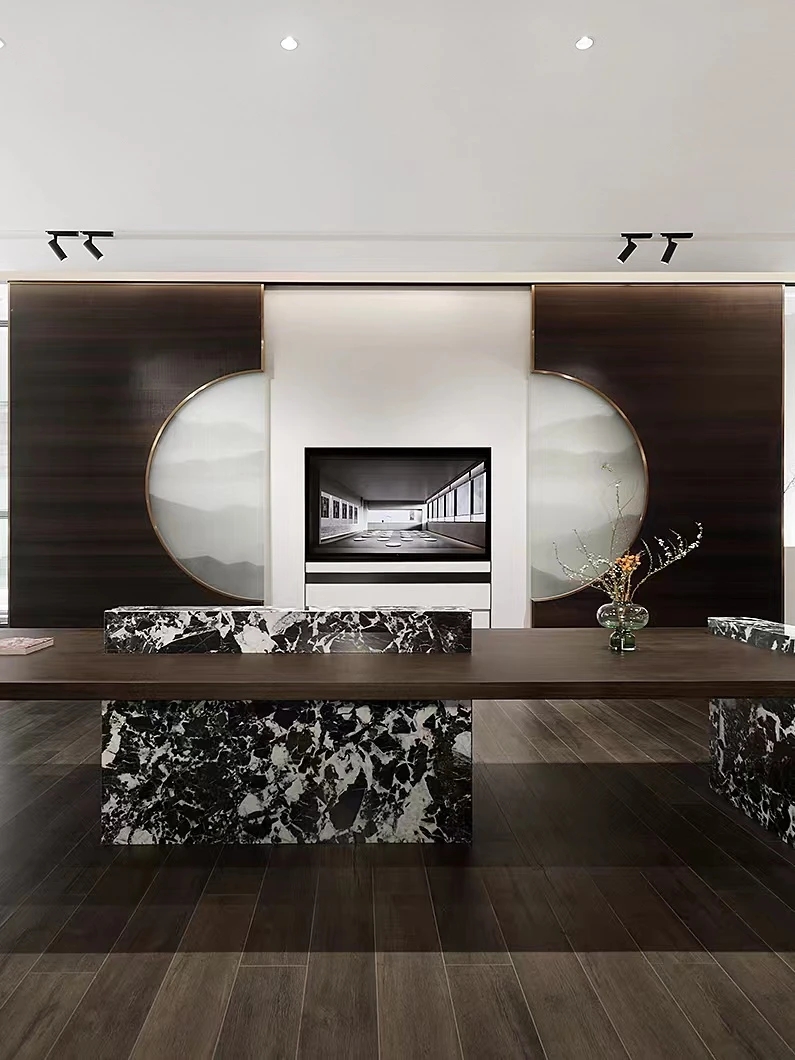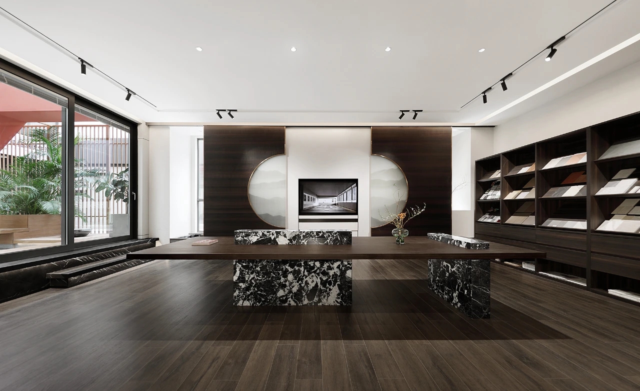 以茶为主题的科技型企业性质,决定茶一定是这个空间的主题,不论从色彩和构成上我们均遵循茶的元素进行提炼和升华,着力塑造一幅现代的意境美。同时结合科技型企业的特点,在前沿感和科技感上找寻一些元素与之形成相辅相成的关系。