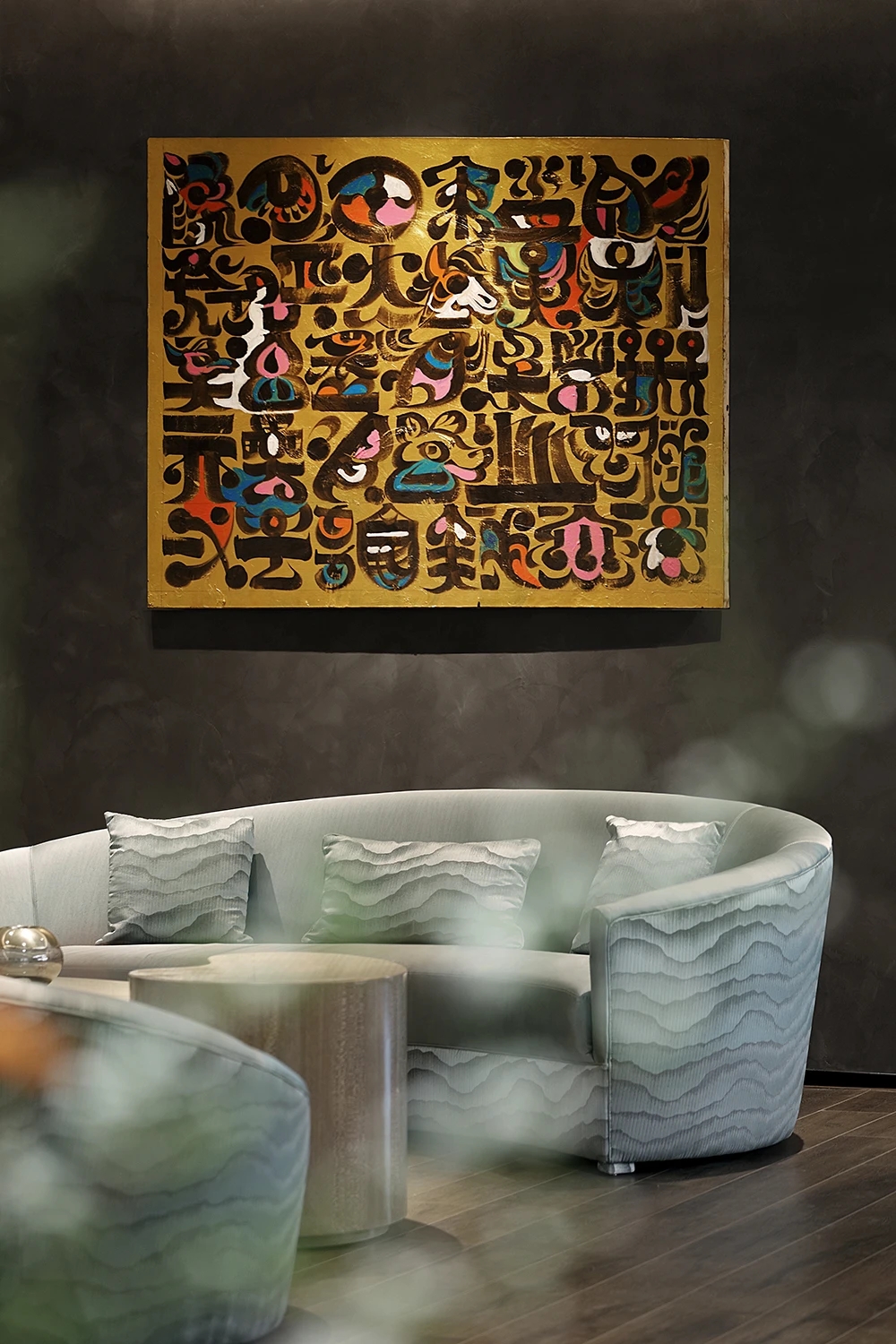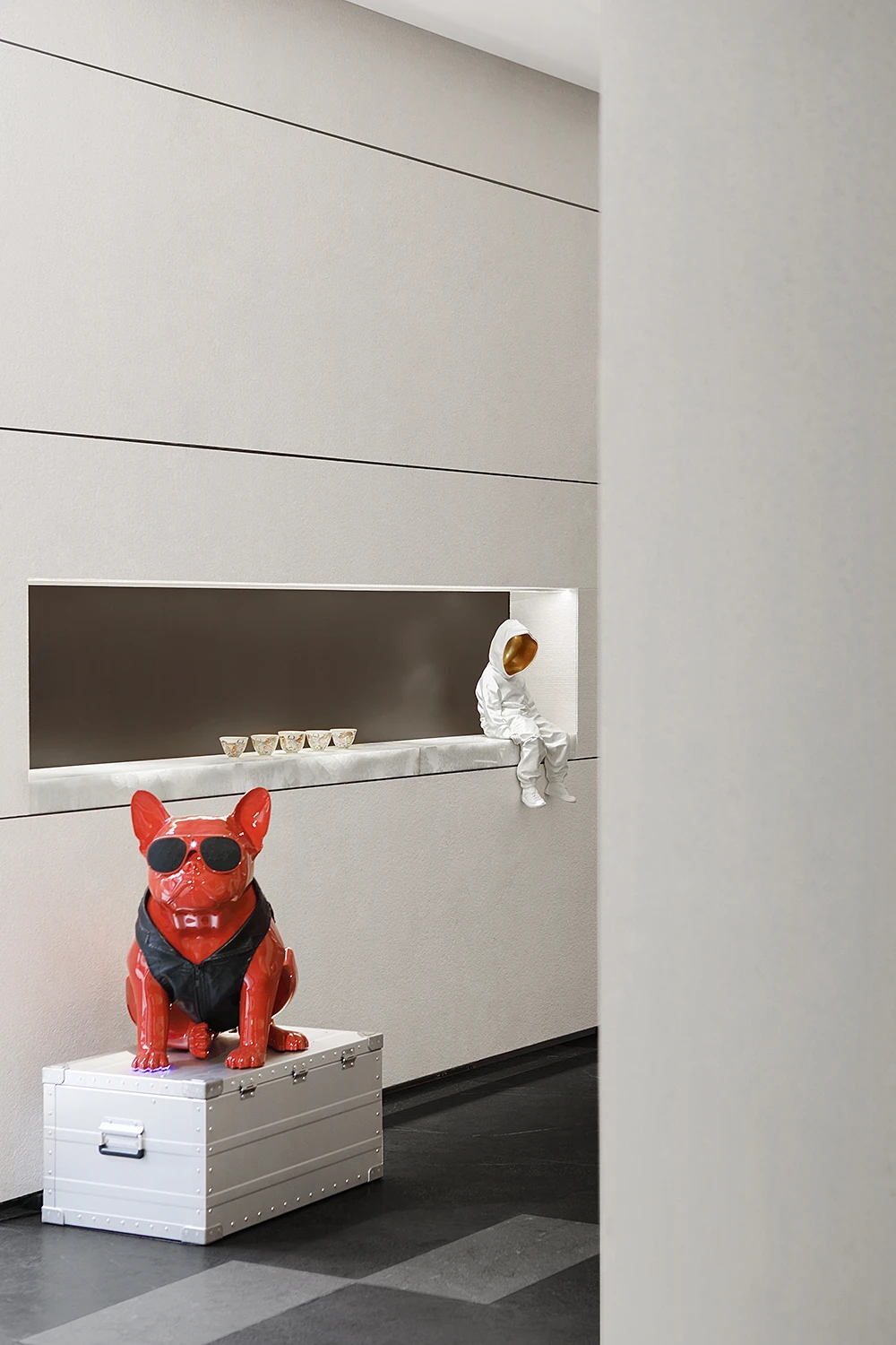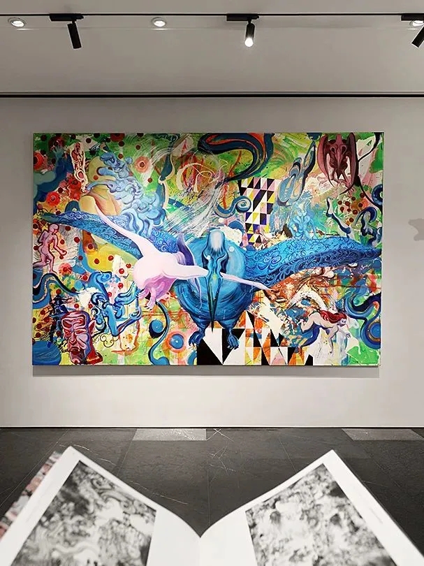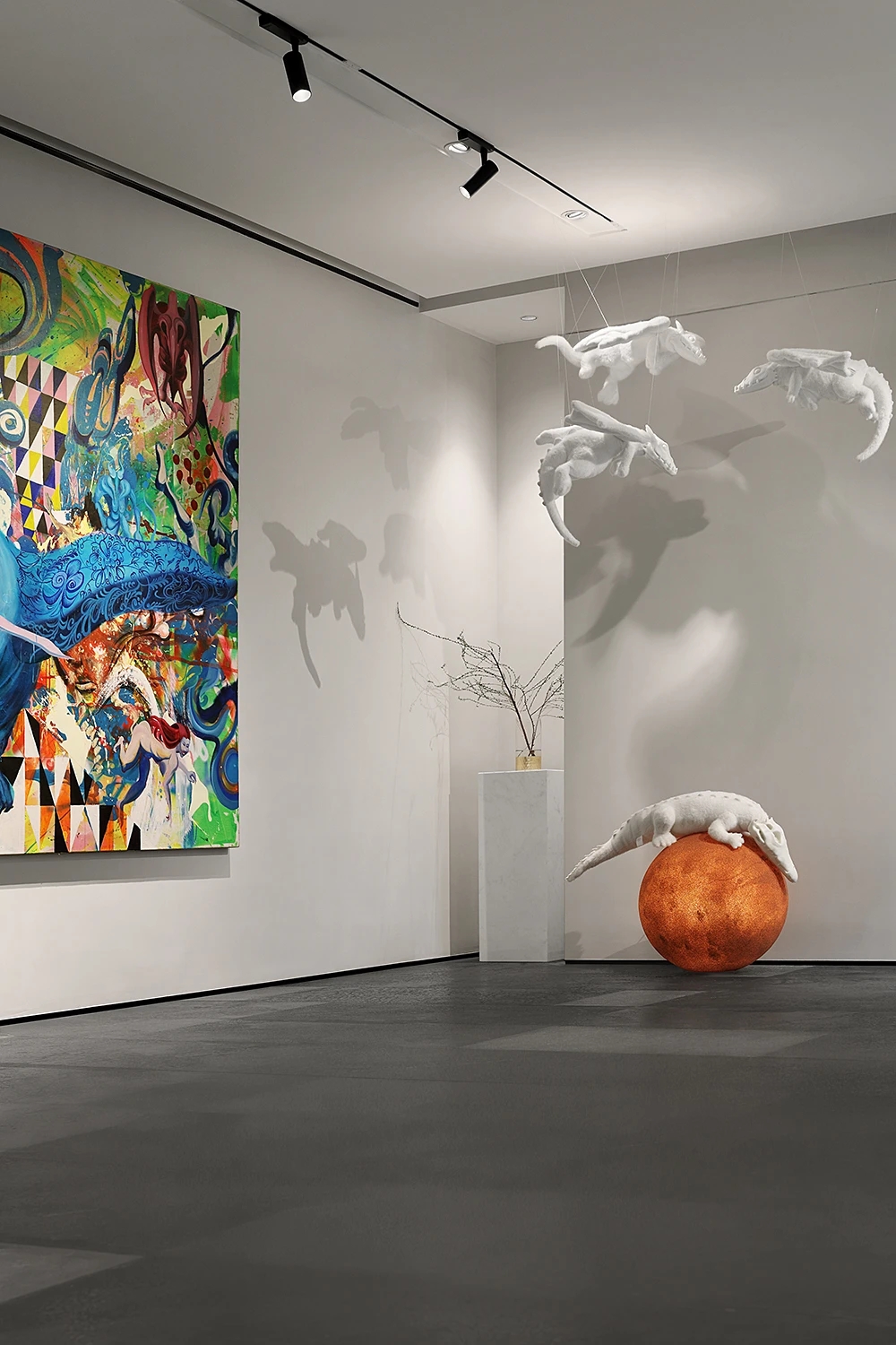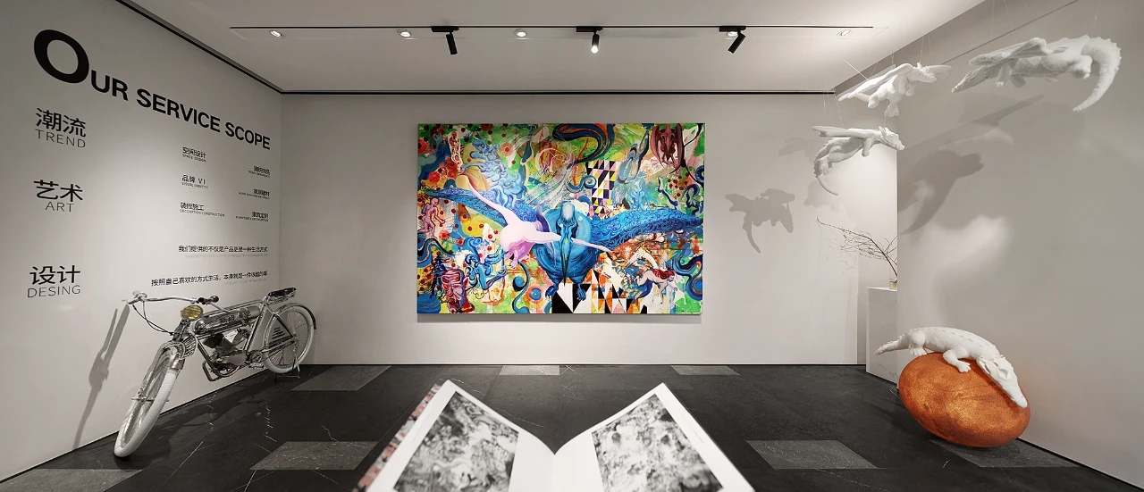 入门处是一个法斗潮玩音响,随之是黄玉龙的原创雕塑作品—《孩子王》,充斥着不羁、叛逆的个性张力。墙上的挂画是朱敬一的原创手绘艺术作品《大鹏》,也是整个空间最大的亮点,极致绚烂的色彩碰撞,抽象扭曲的造型,这种怪诞的表现手法能引发我们对艺术的思考。