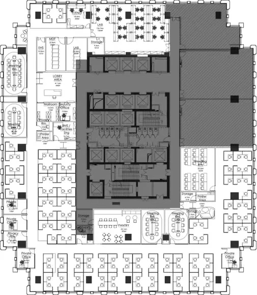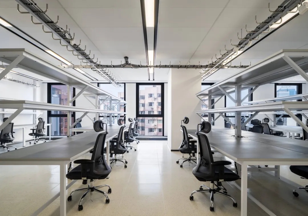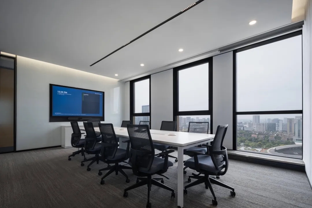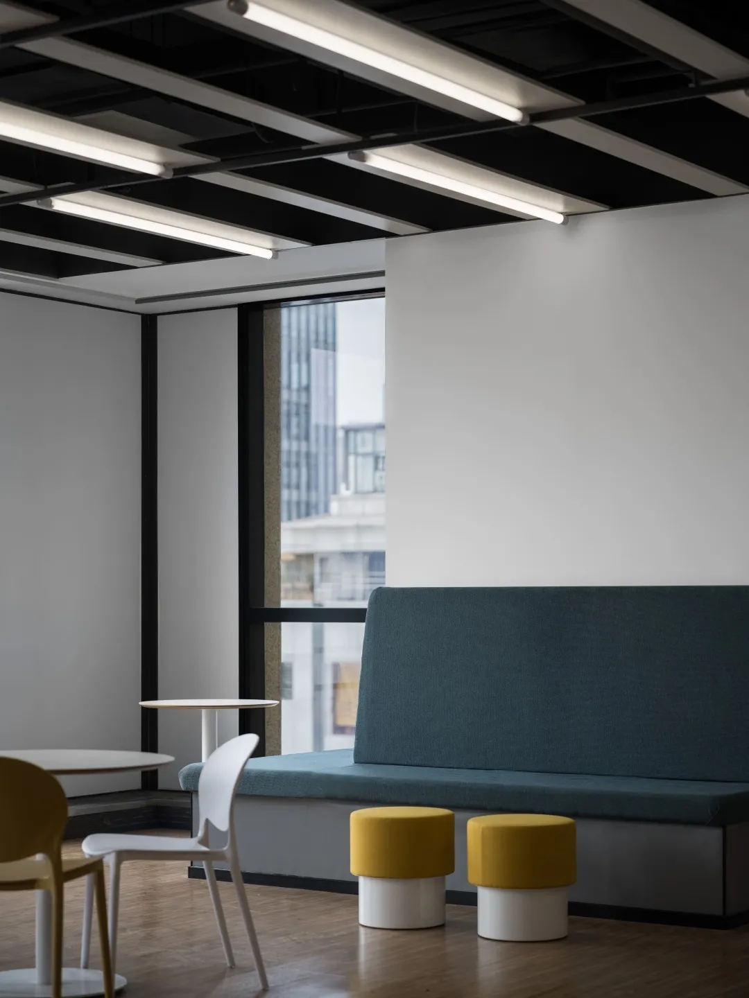 公共功能区位置选择在入口接待处的背后,利用该区域宽敞的空间以及充足的自然照明,汇集了多样的公共功能。开放式的布局设计,使得大堂与茶水间之间形成相互连接的空间,充分发挥了这一区域的动态性和多功能性。 天花板的长条形灯条体块交叉,营造出漂浮感以及强烈的反差感,将室内空间与外界构成了对比,内与外均是宜人风景,也让内部空间从外界之中凸显出来。