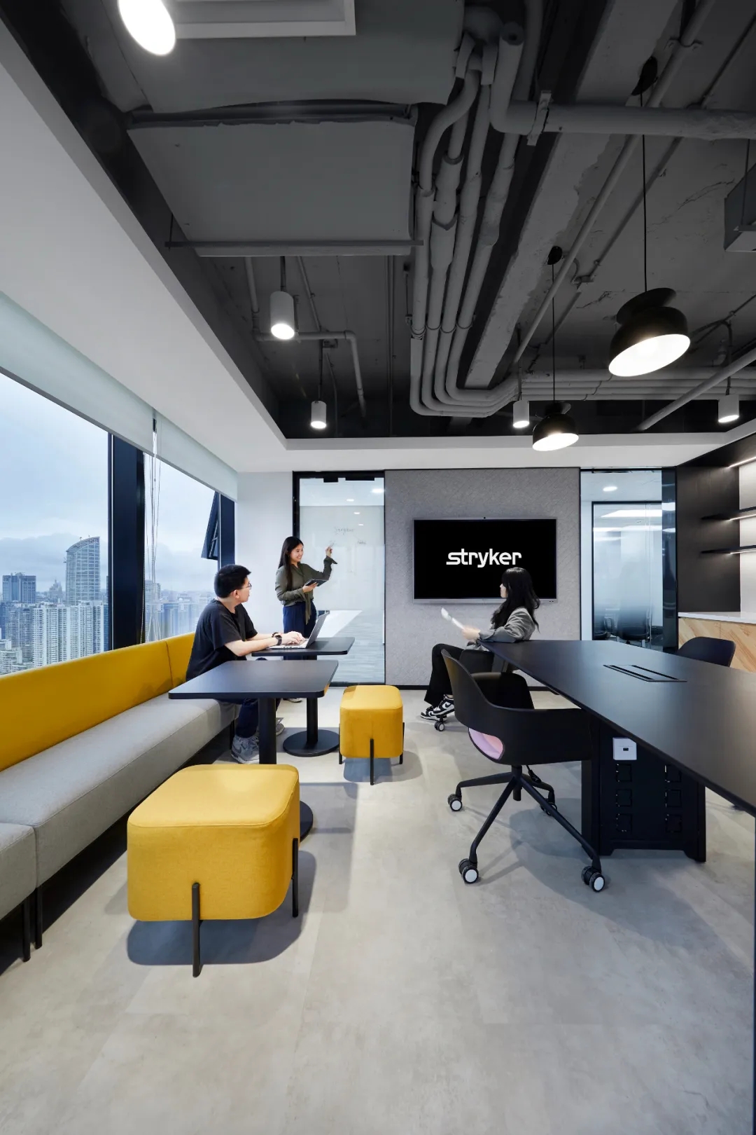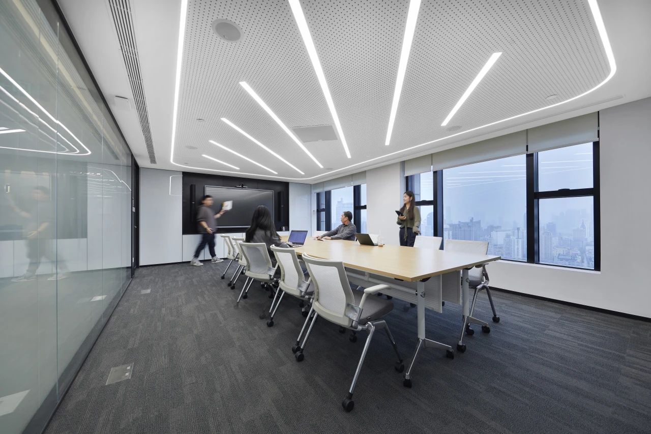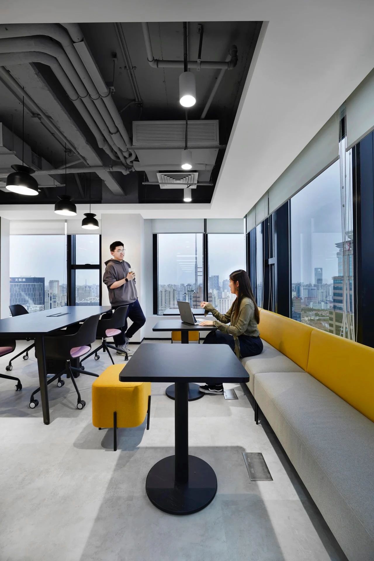 核心理念是整体为开放式办公布局。在这里,休闲会议区和休息区轻松地交织在一起,营造出一个充满活力和高效协作的工作环境。这些区域之间的视觉分隔是通过巧妙地将不同功能区刻意使用不同图案的灰色地毯, 以及根据功能不同而不同的天花板来实现的。