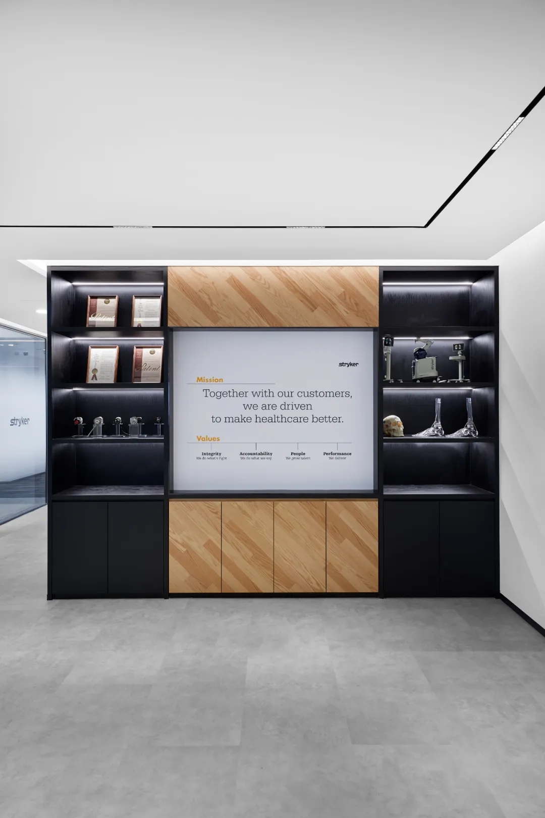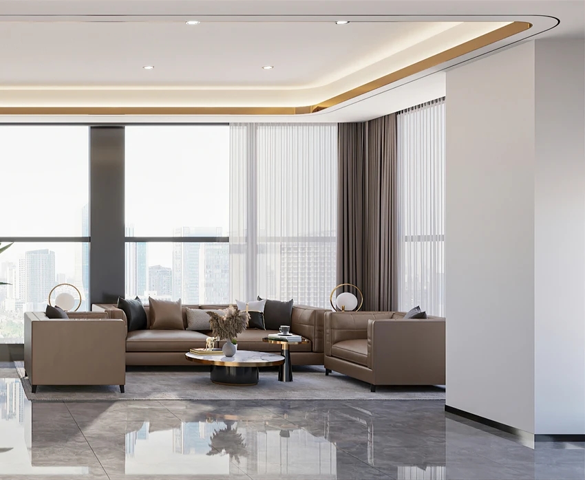 办公室是一个典雅而现代的空间,这里融合了沉稳的灰色与温暖的木色,彰显出现代办公环境的简约与舒适。家具的设计也颇具现代感,精细的工艺与独特的设计理念让每一件家具都闪耀着智慧的光芒。尤其是办公桌右侧的文件柜,通过不规则的重组排列设计,增强了设计感,同时保留了一份庄重感。