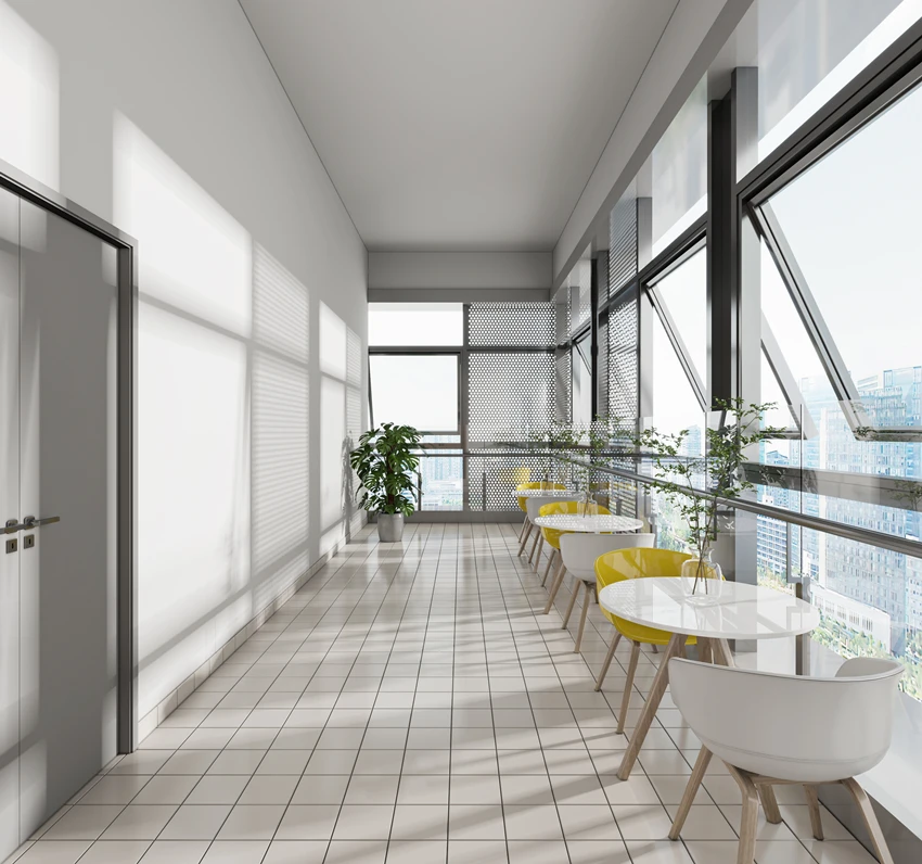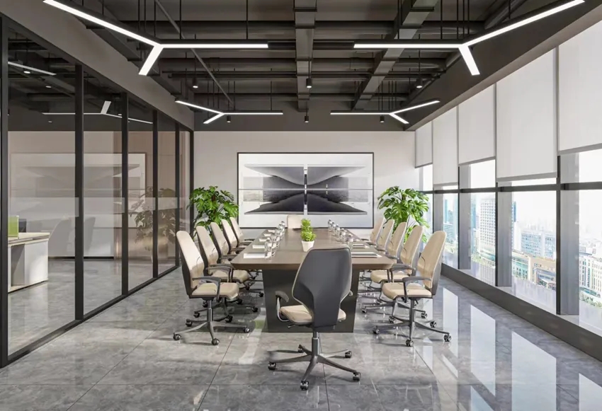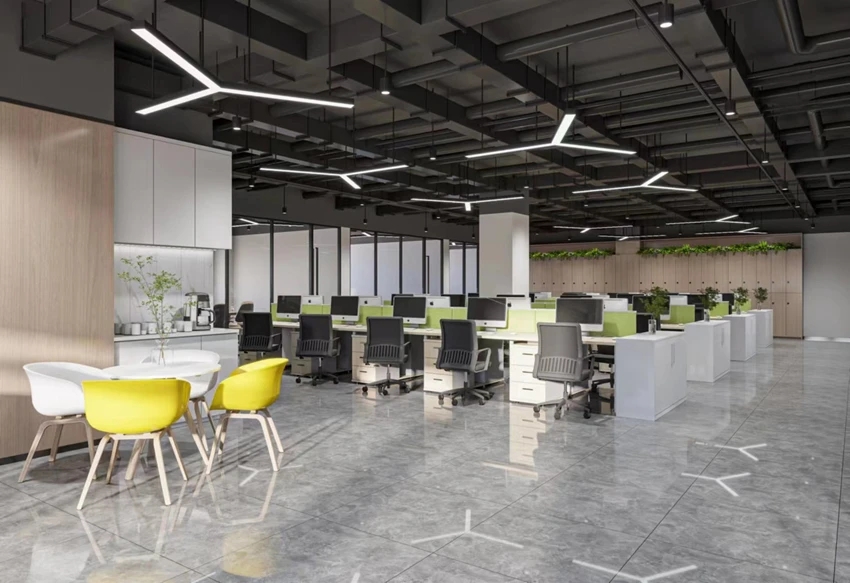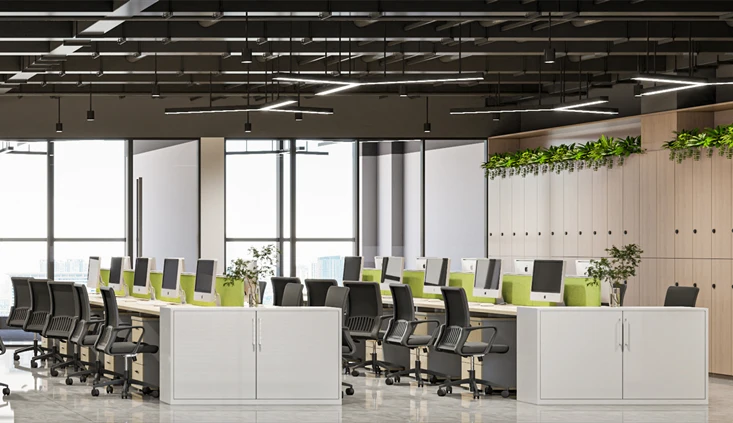 自然光线和舒适的工作环境:强调办公室的良好照明设计和充足的自然光线,如大窗户、透明隔断和明亮的灯光,让读者感受到办公室的明亮和舒适的工作环境。