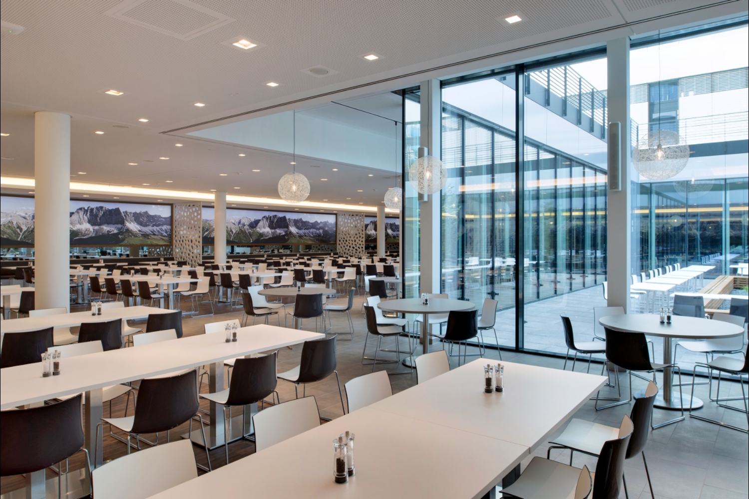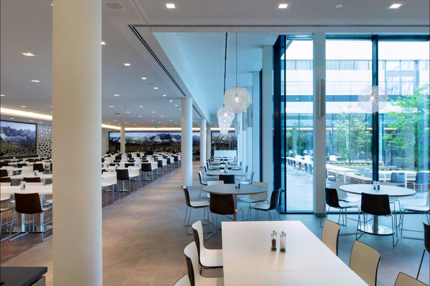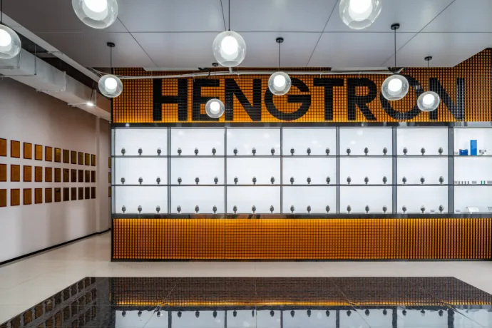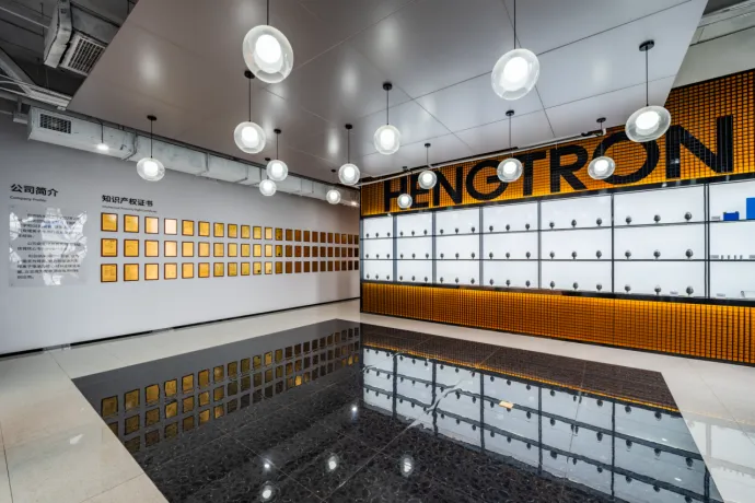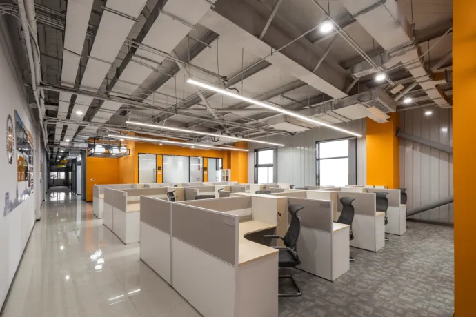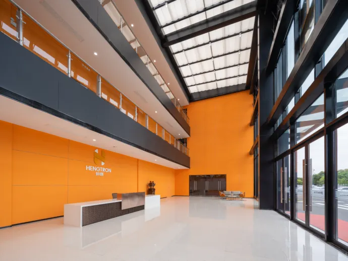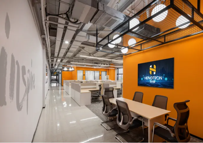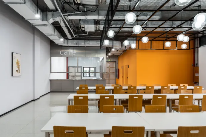 在员工餐厅,统一大面积地延用大堂的活泼元气的橙色作为背景色,如“电子”一般的玻璃灯泡元素在漂浮在一个半开放的钢架盒子里, 给工厂的食堂平添一份设计感和活泼,同时加强品牌的统一形象。
