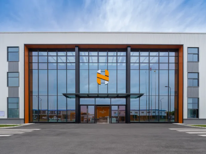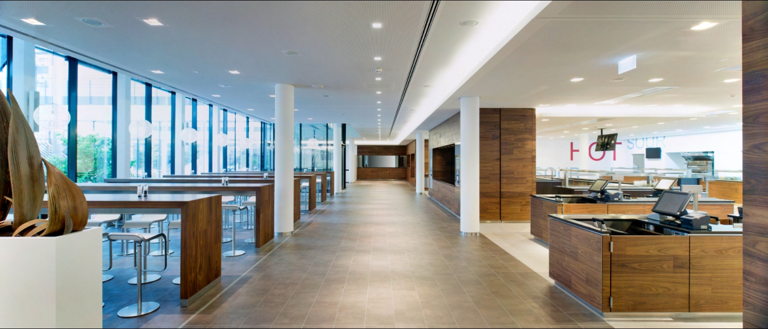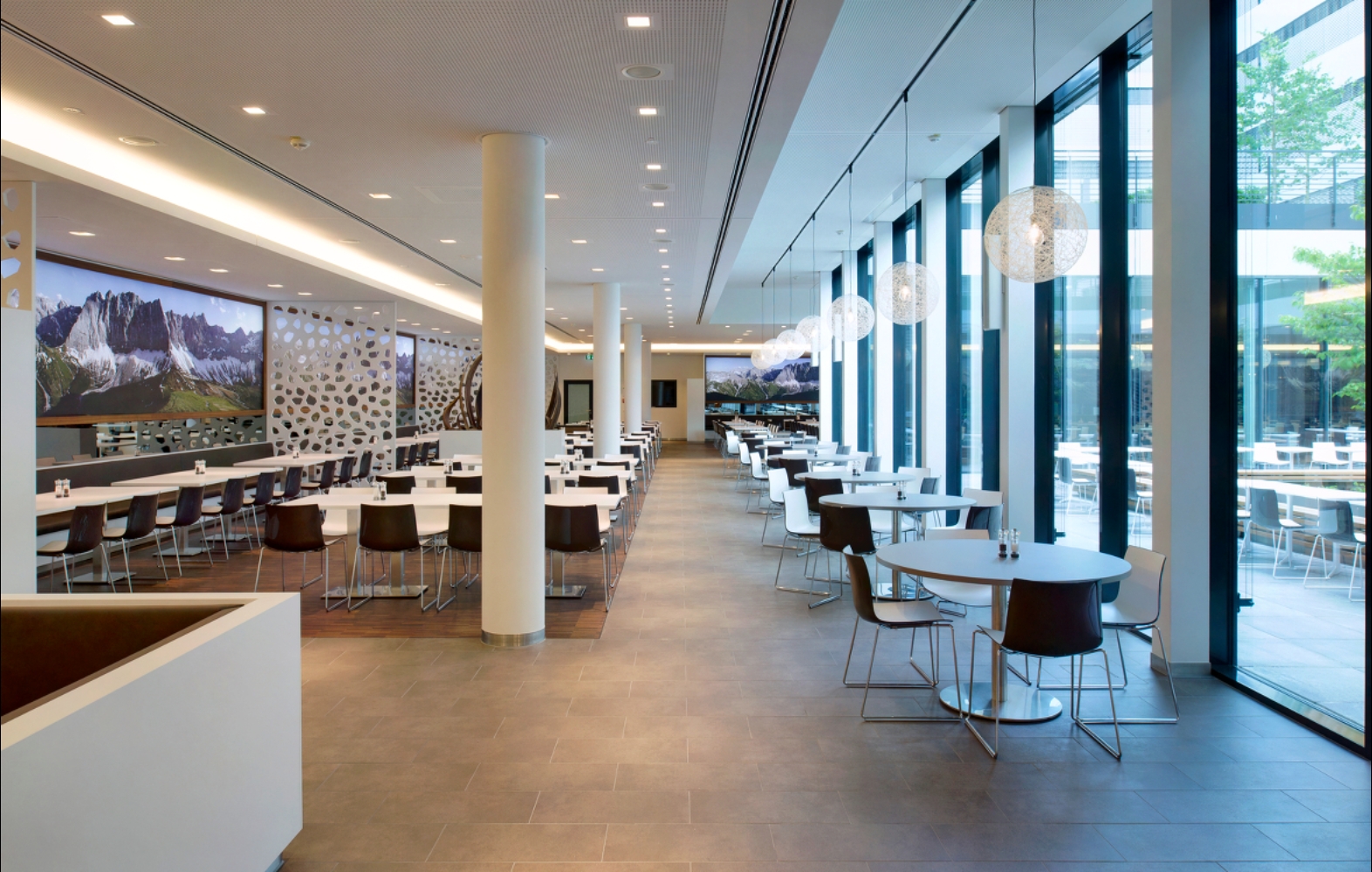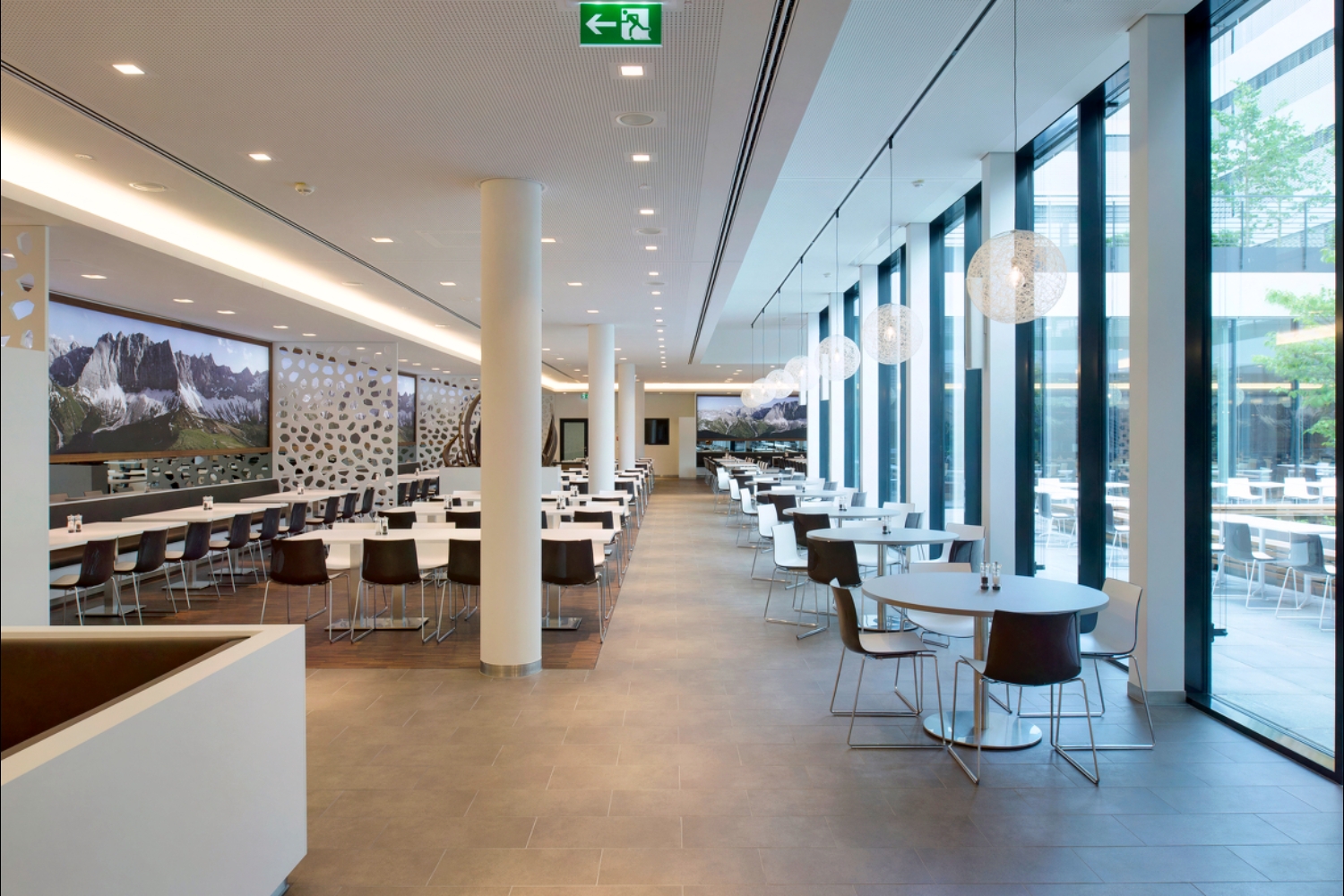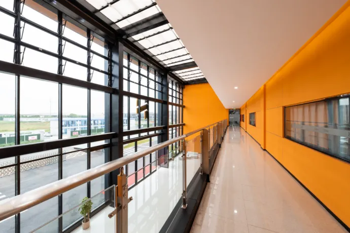 在员工餐厅,统一大面积地延用大堂的活泼元气的橙色作为背景色,如“电子”一般的玻璃灯泡元素在漂浮在一个半开放的钢架盒子里, 给工厂的食堂平添一份设计感和活泼,同时加强品牌的统一形象。