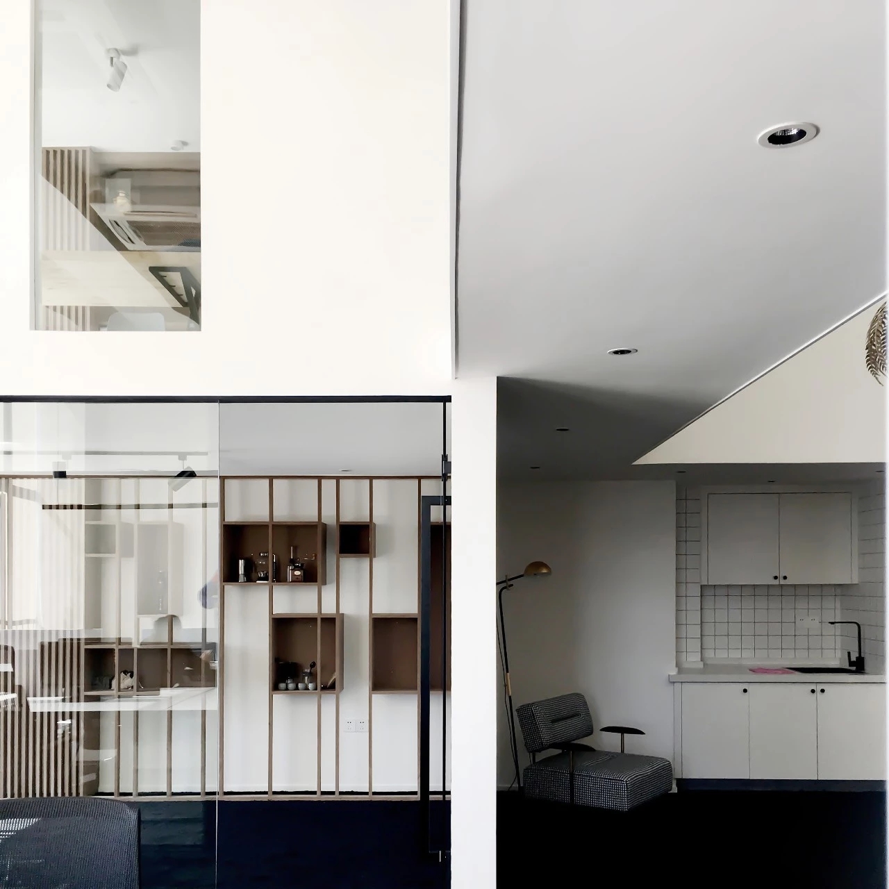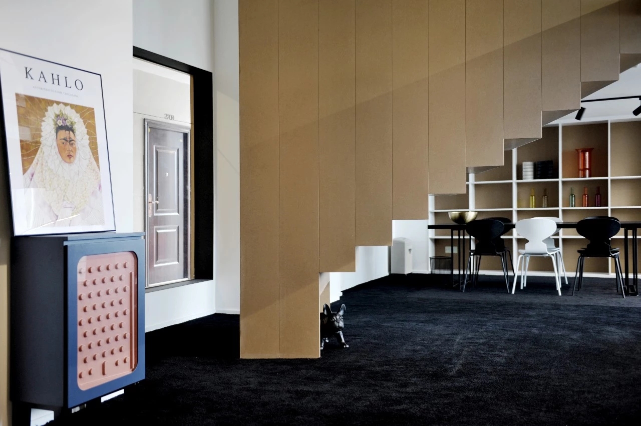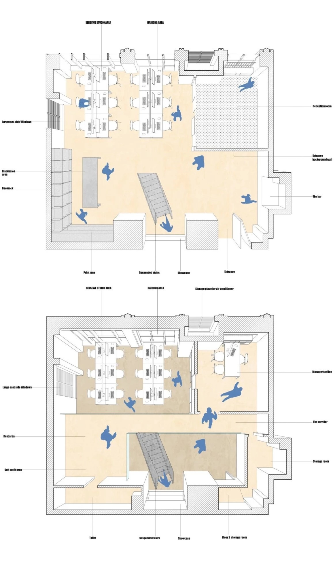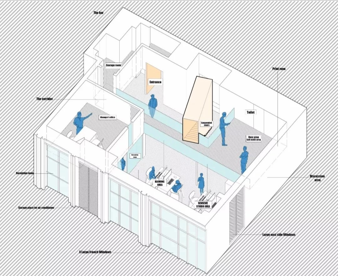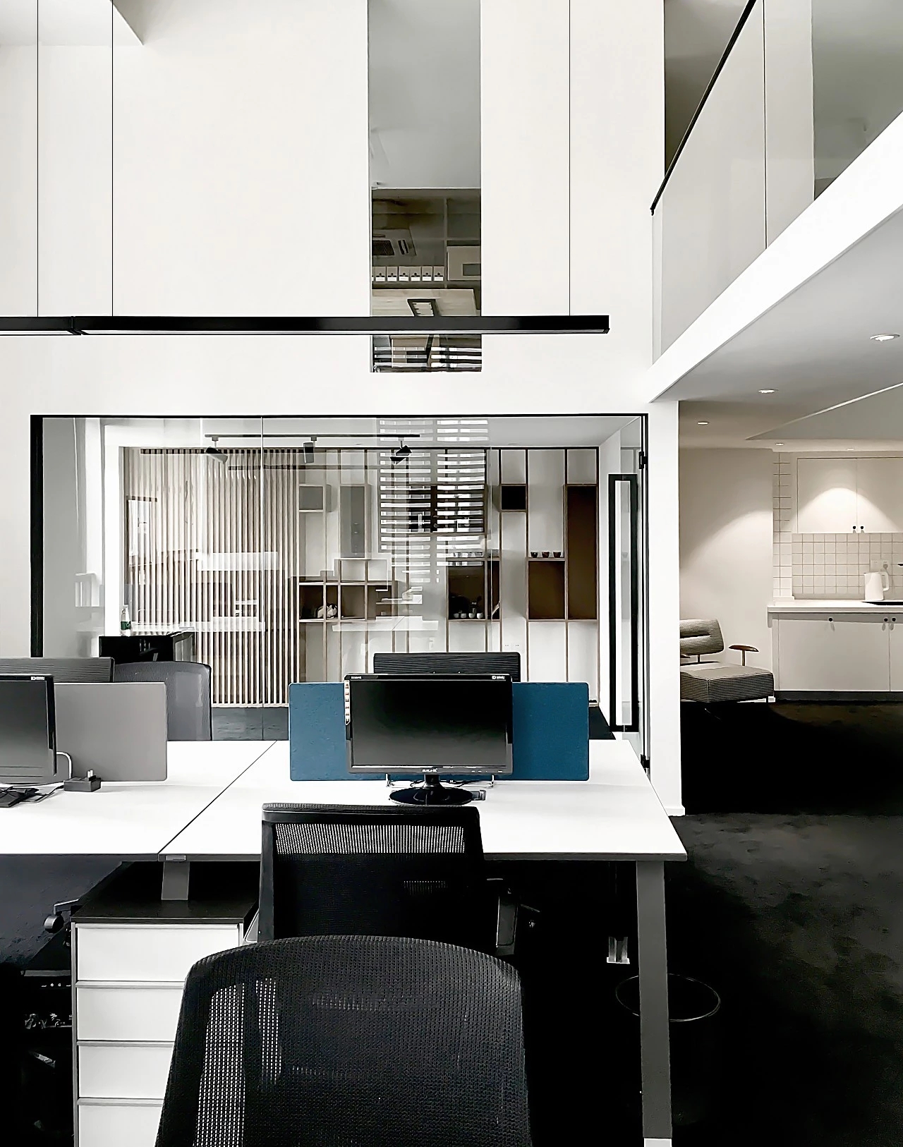 “联合纤维”是此作品被赋予的名字,灵感来源于大脑中的胼胝体,它联系了两大脑半球对应部位,使大脑在功能上成为一个整体。正如深思维一般,把感性与理性连接在了一起。新办公室分为上下两层,二层部位的两个区域通过中心桥梁连接起来,空间上的连接代表着事物的连接、思维的连接和沟通的连接。通透明亮的采光和挑高的办公区域给了深思维优越的办公环境。空间亮点是一个斜置的楼梯,为了放大这一亮点,在办公室外墙上设置了一面大型橱窗。