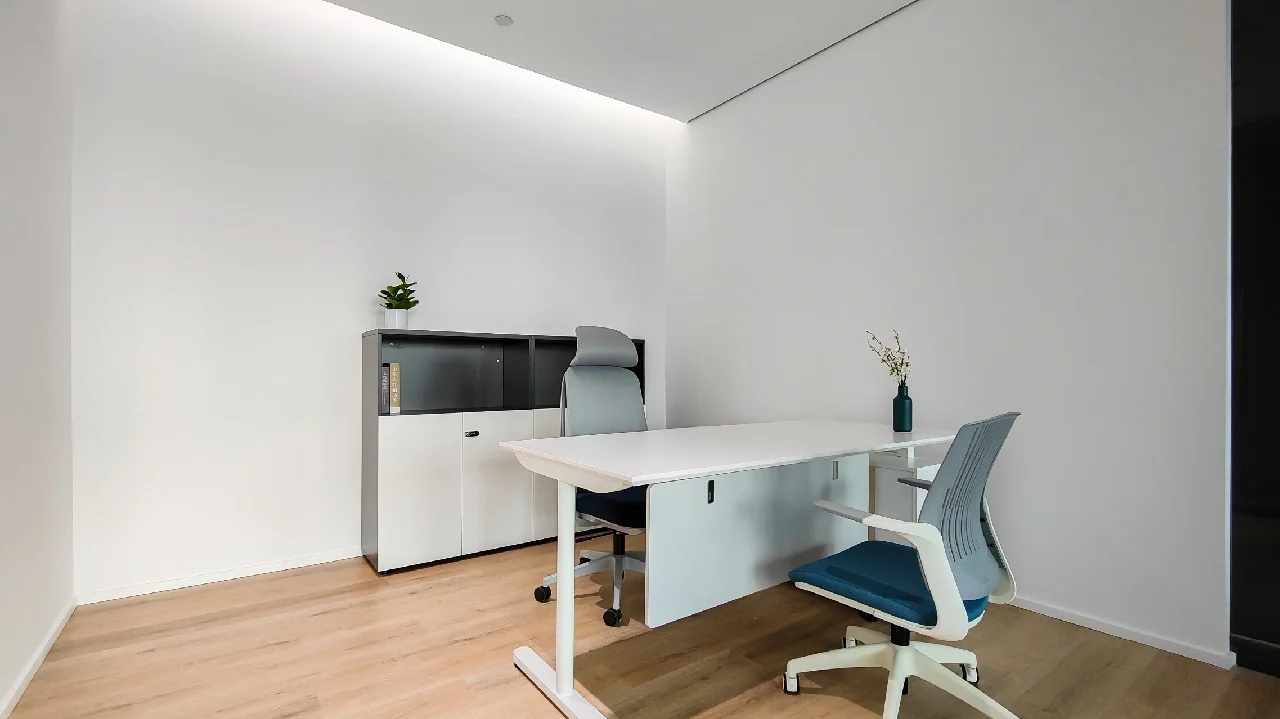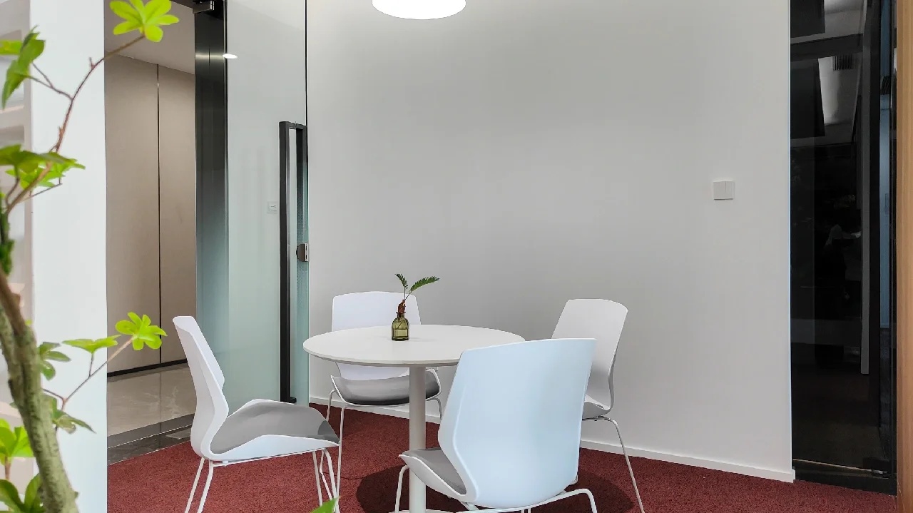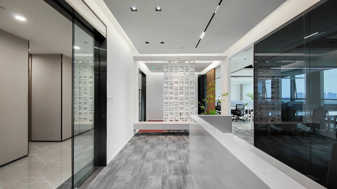 领导办公室往往是威严以及私密的状态,灵猫空间设计将公共区域最深的红褐色作为了领导办公室的主色调,配置以黑白色的肌理现代画做装饰,凸显企业领导的身份地位。