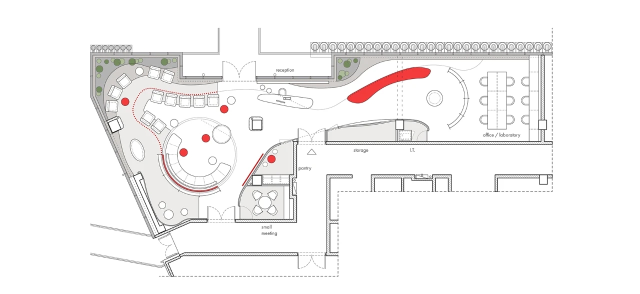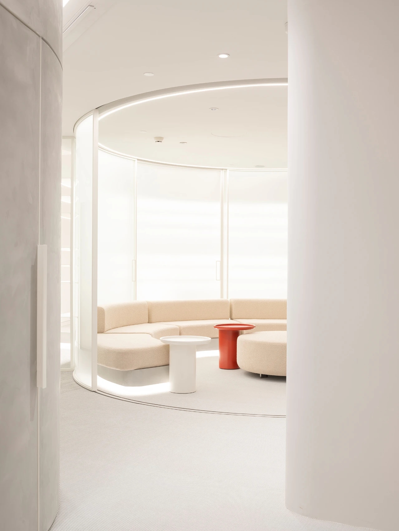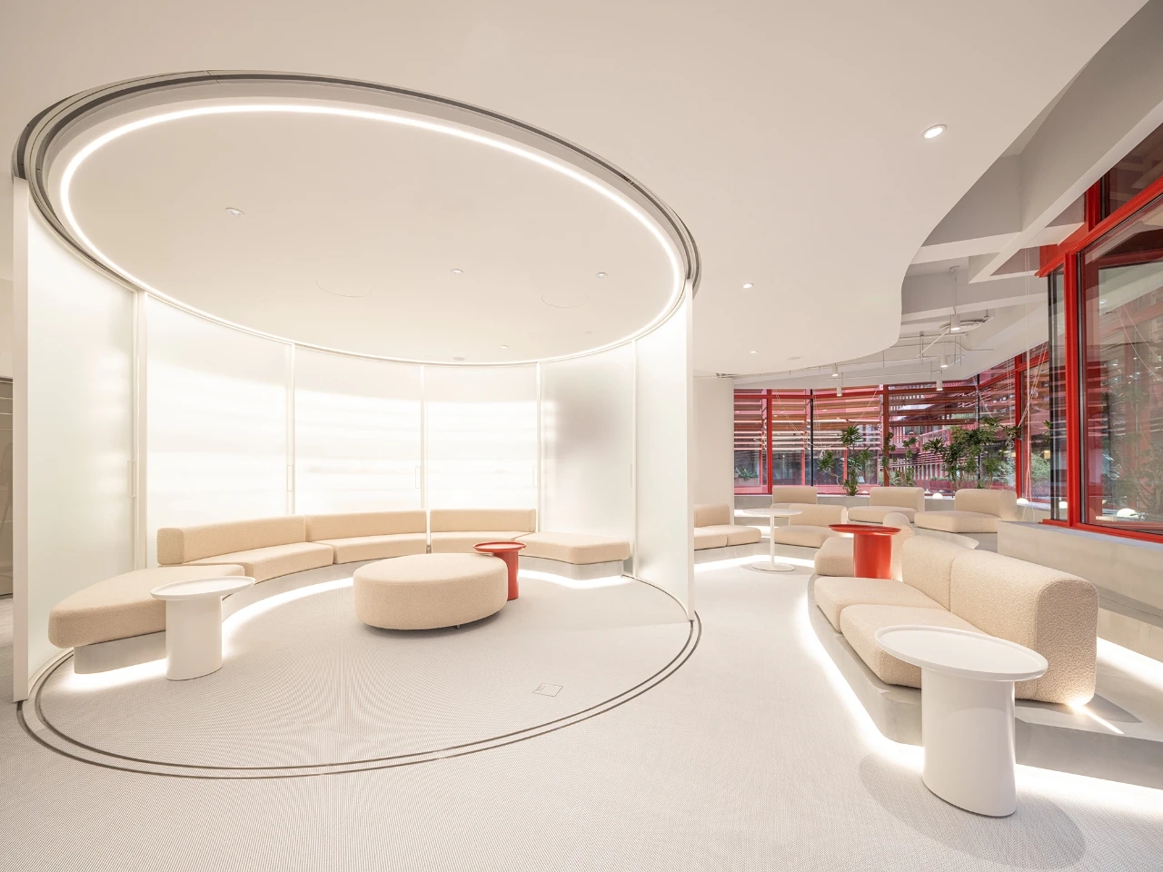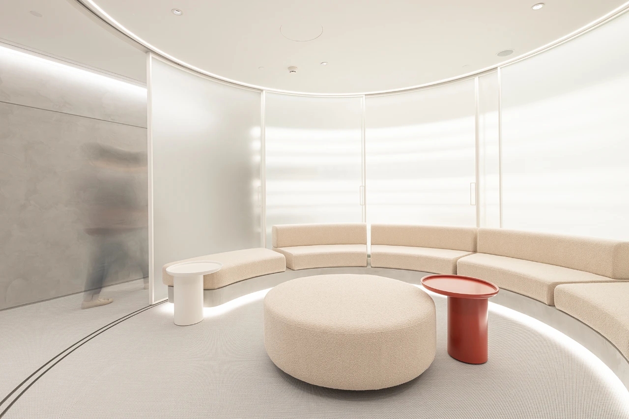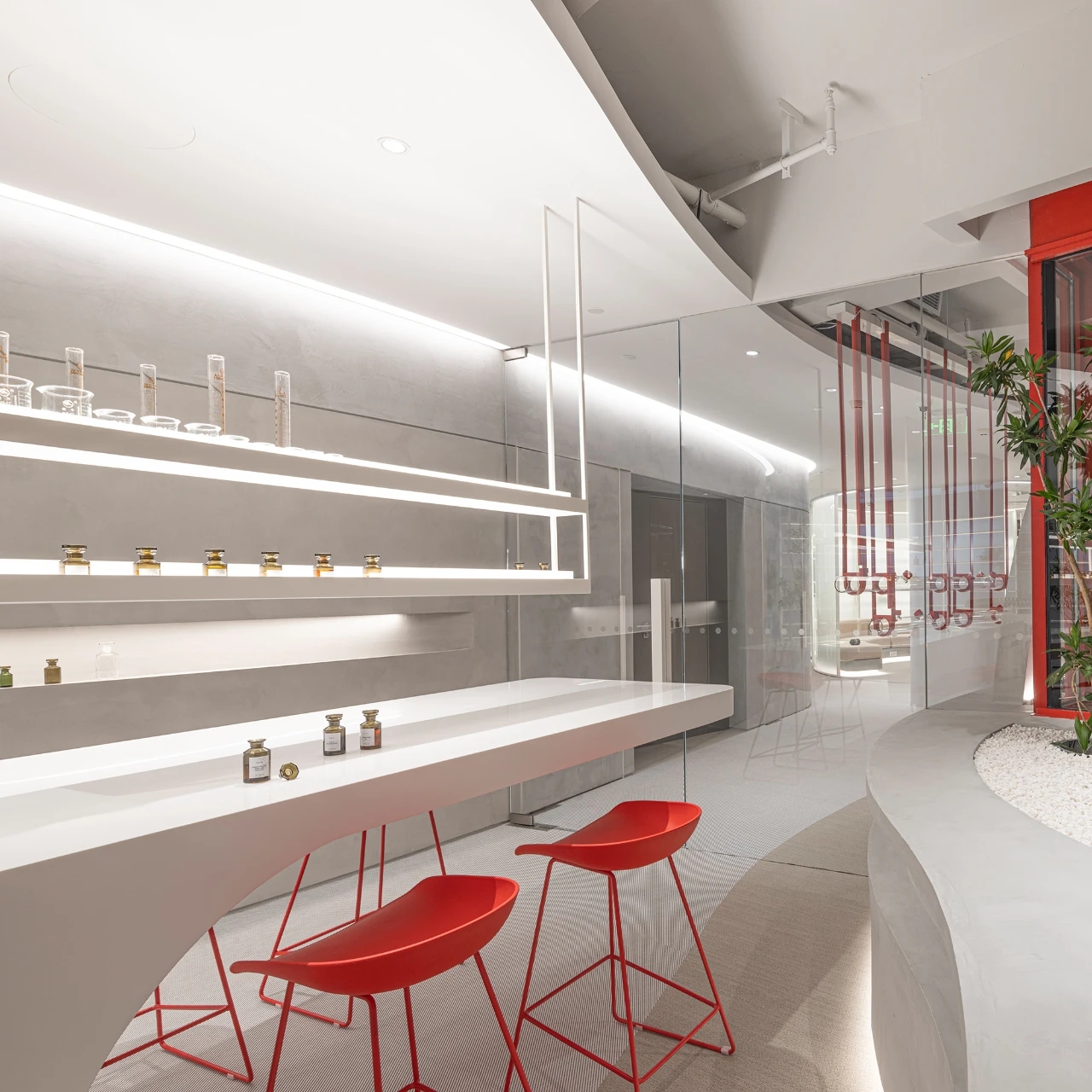 香味的意象会让人想到流动性和柔软的感受,将身体包裹在一种神秘和愉悦的空灵氛围中。我们将这种感觉运用到了办公室空间的设计中。办公室所坐落的地点是由法国建筑大师Jean Nouvel设计的,建筑通体红色。为了对应这种标志性的红,我们在室内也设置了对应的色彩。