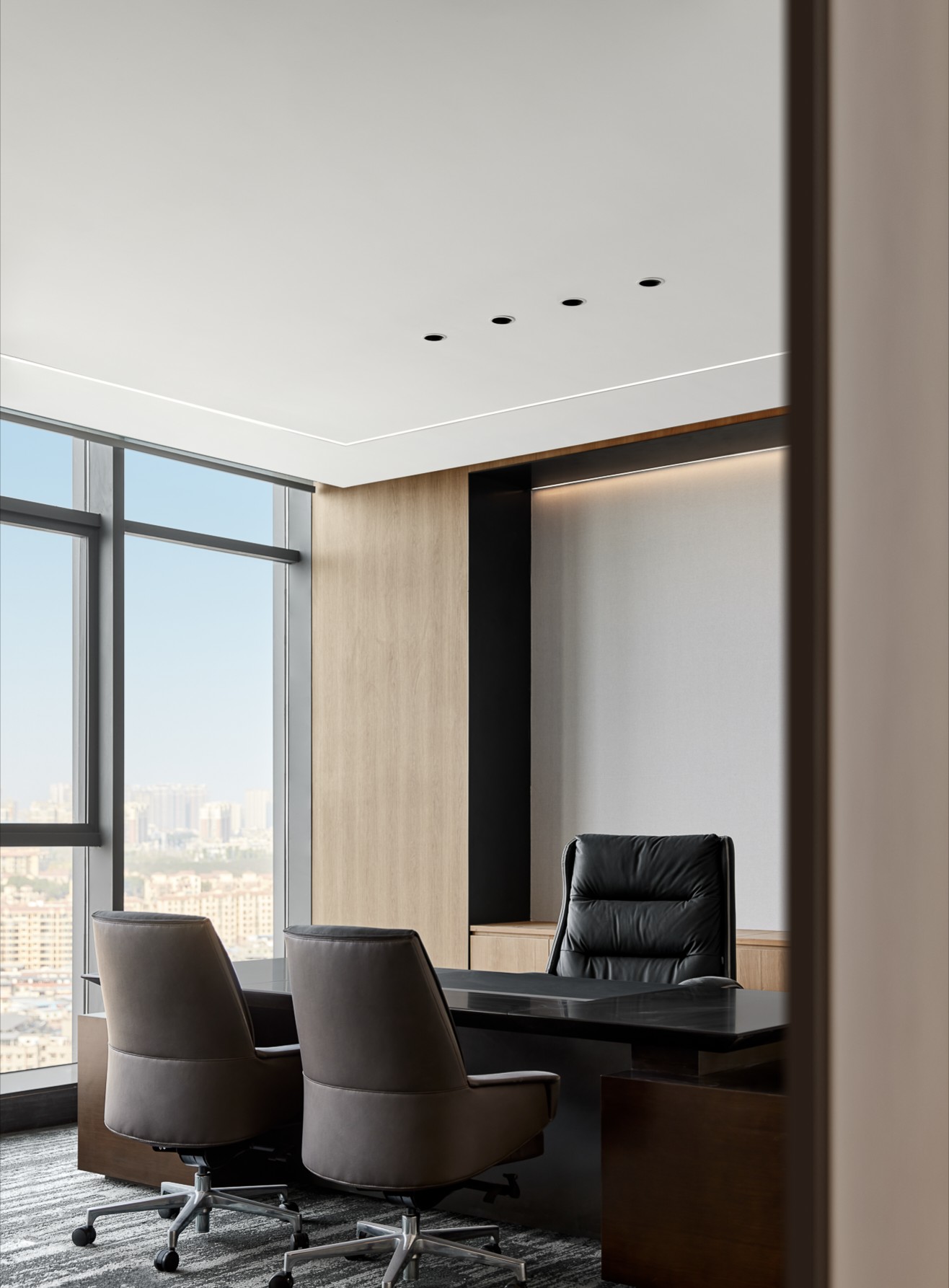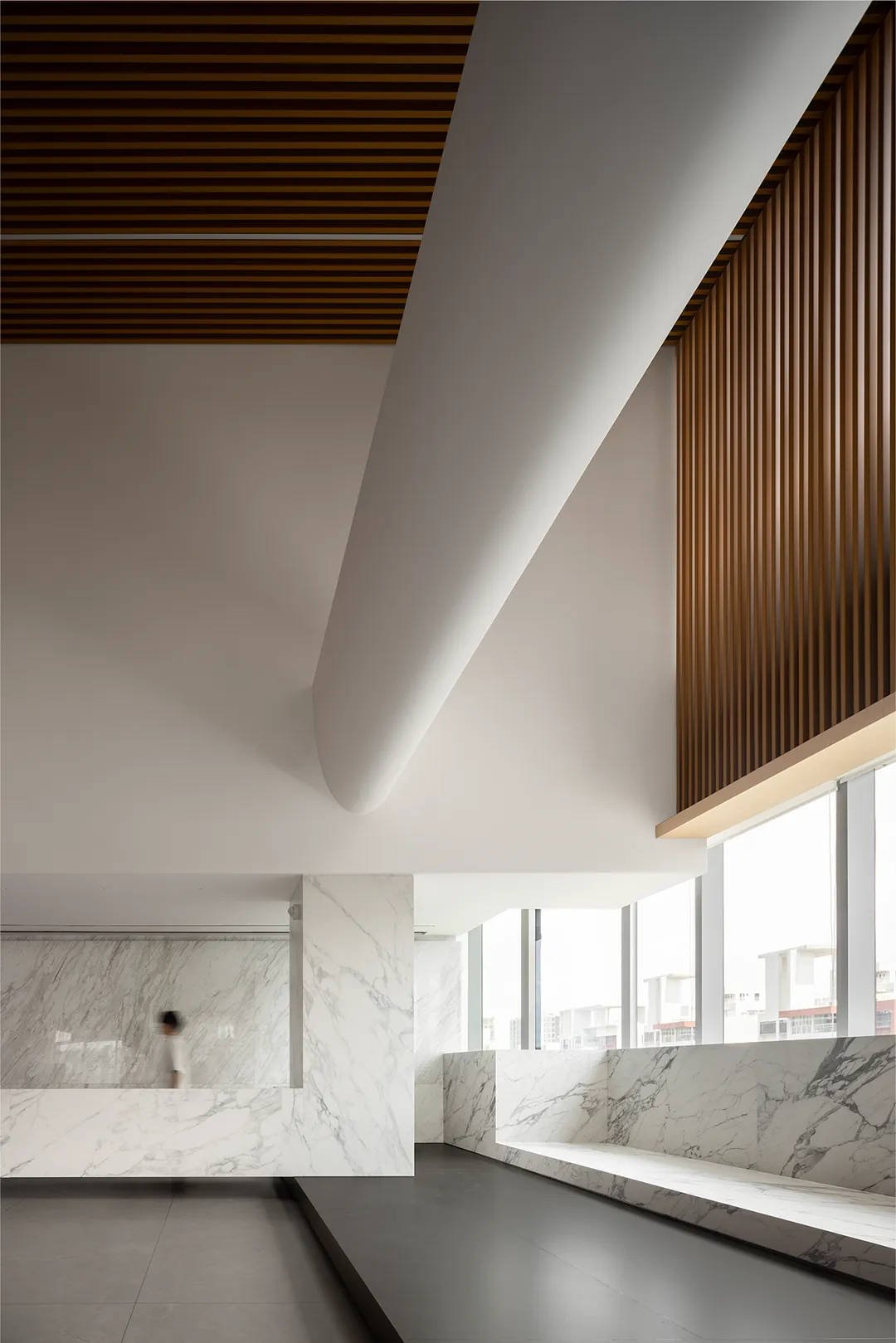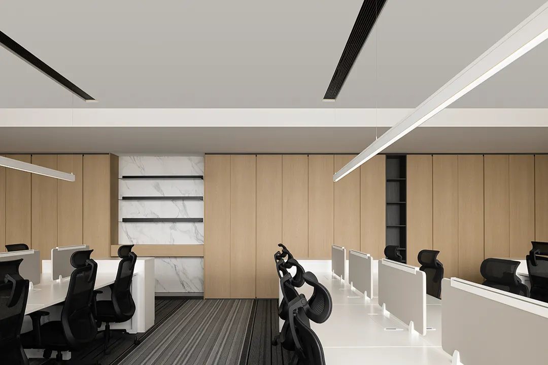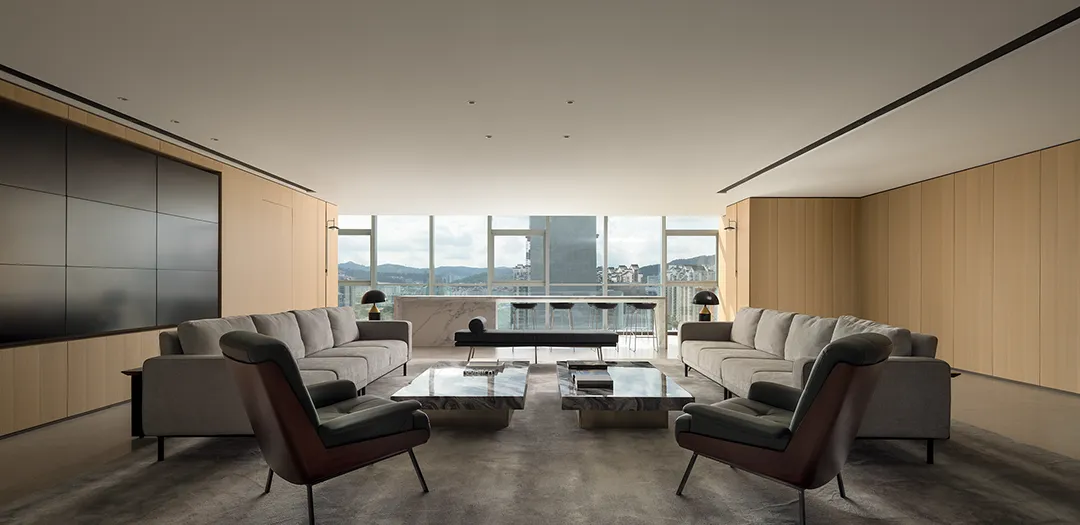 墙体的隔而不断,在木作横纹水平延展的作用下,表现出一定的运动态势,结合场域中的光、气、景观、视线穿间隙而过,共同构筑一幅意境深远的自然情景。木色除了有效地柔化空间环境,也有着明确区域界定的功用。独立办公区和开放区域通过材质的差异变化,形成互相呼应、咬合的微妙关系。
