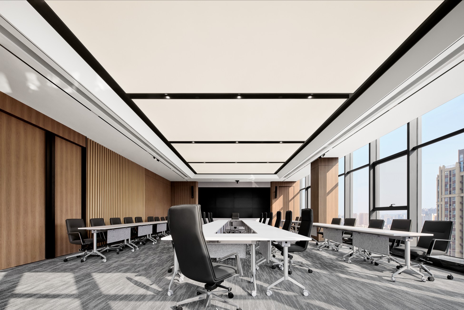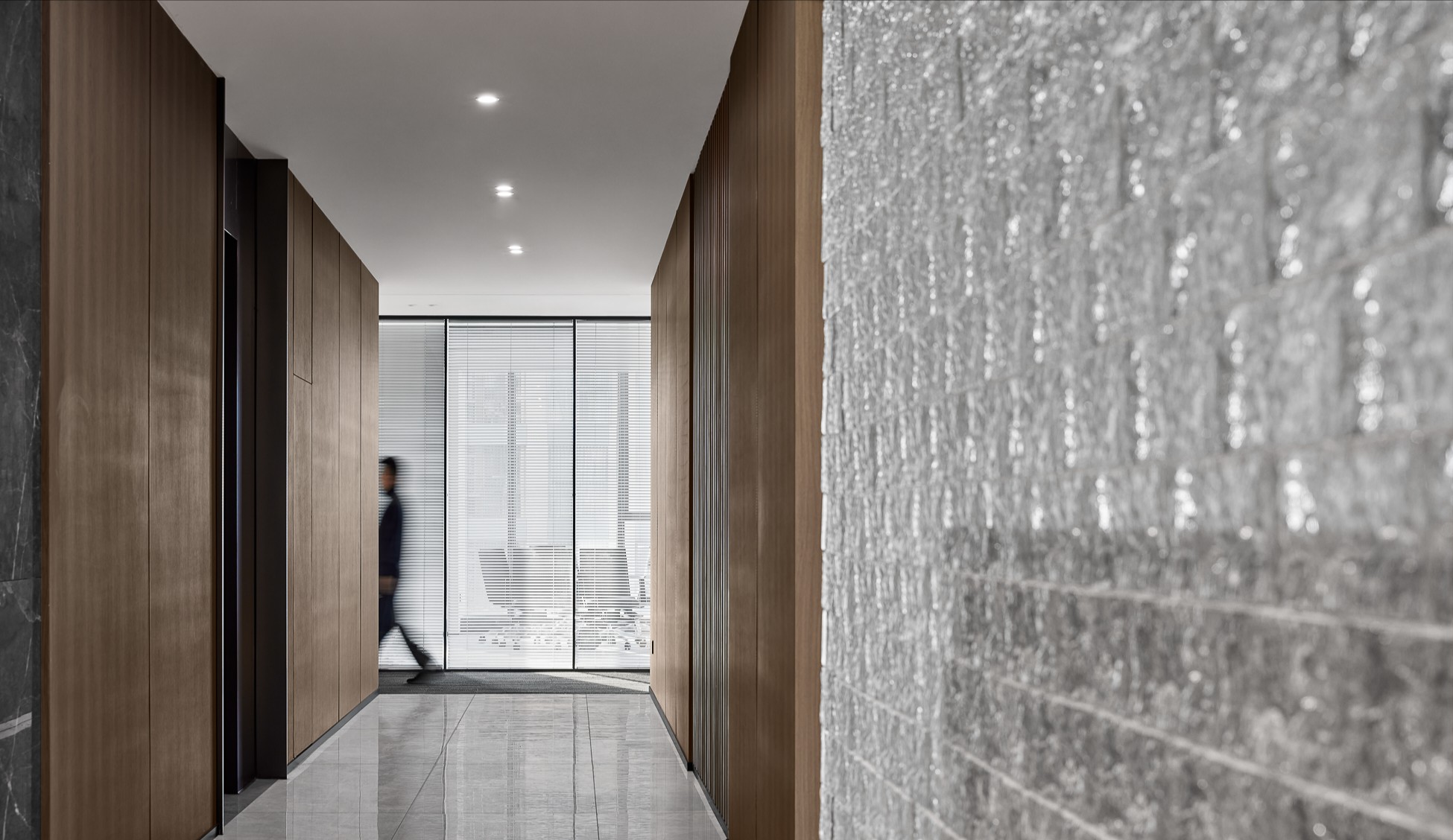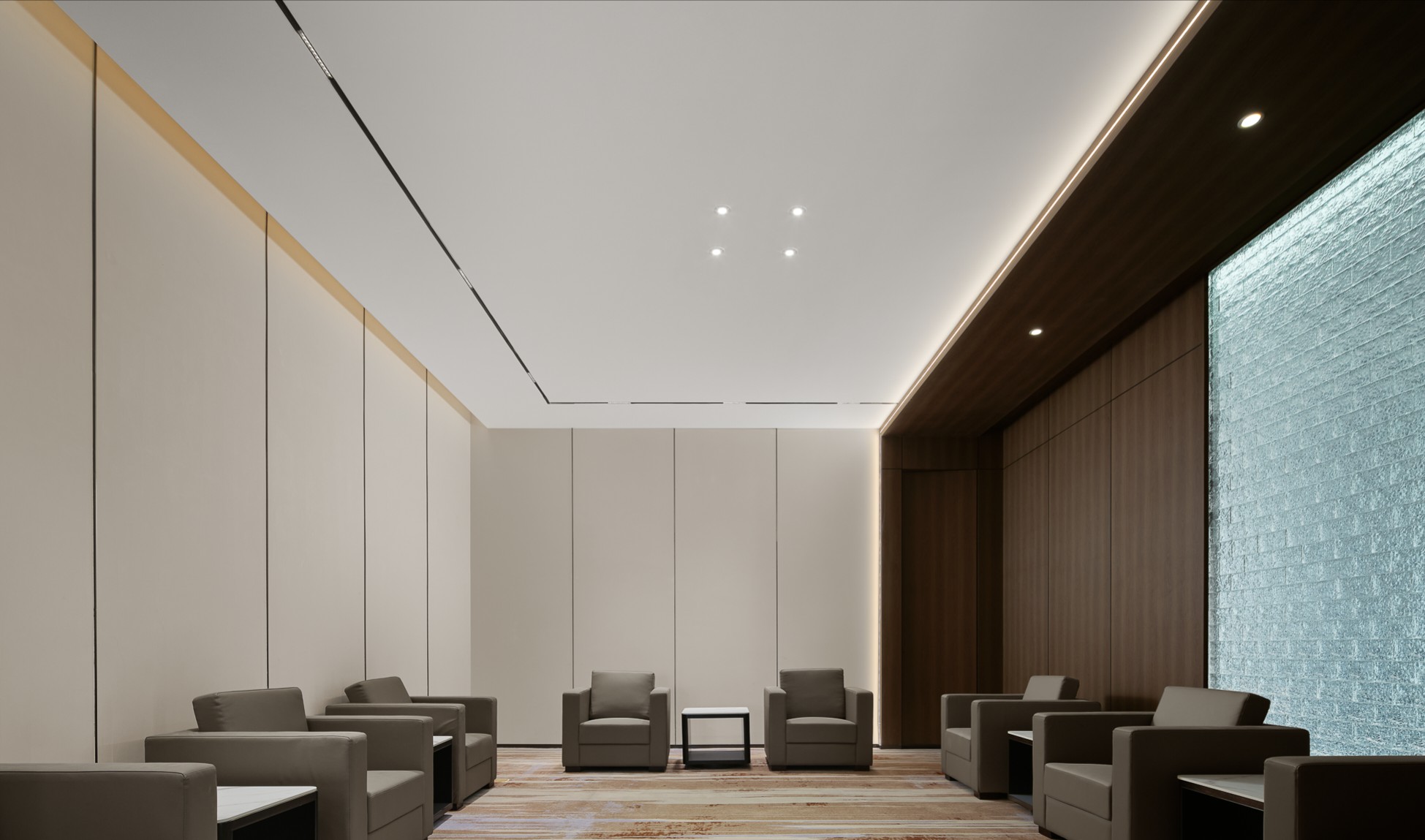 墙体的隔而不断,在木作横纹水平延展的作用下,表现出一定的运动态势,结合场域中的光、气、景观、视线穿间隙而过,共同构筑一幅意境深远的自然情景。木色除了有效地柔化空间环境,也有着明确区域界定的功用。独立办公区和开放区域通过材质的差异变化,形成互相呼应、咬合的微妙关系。
