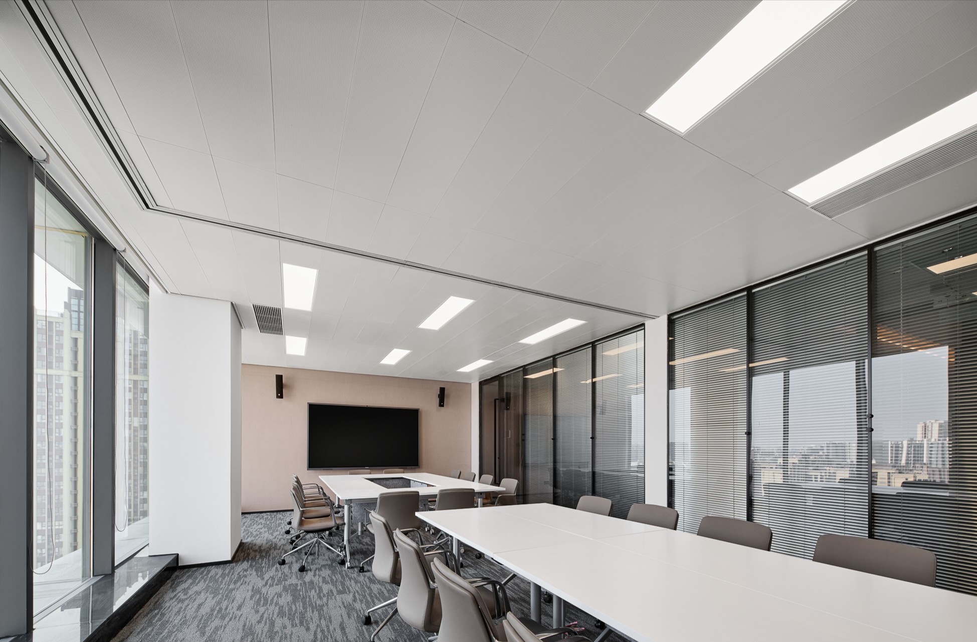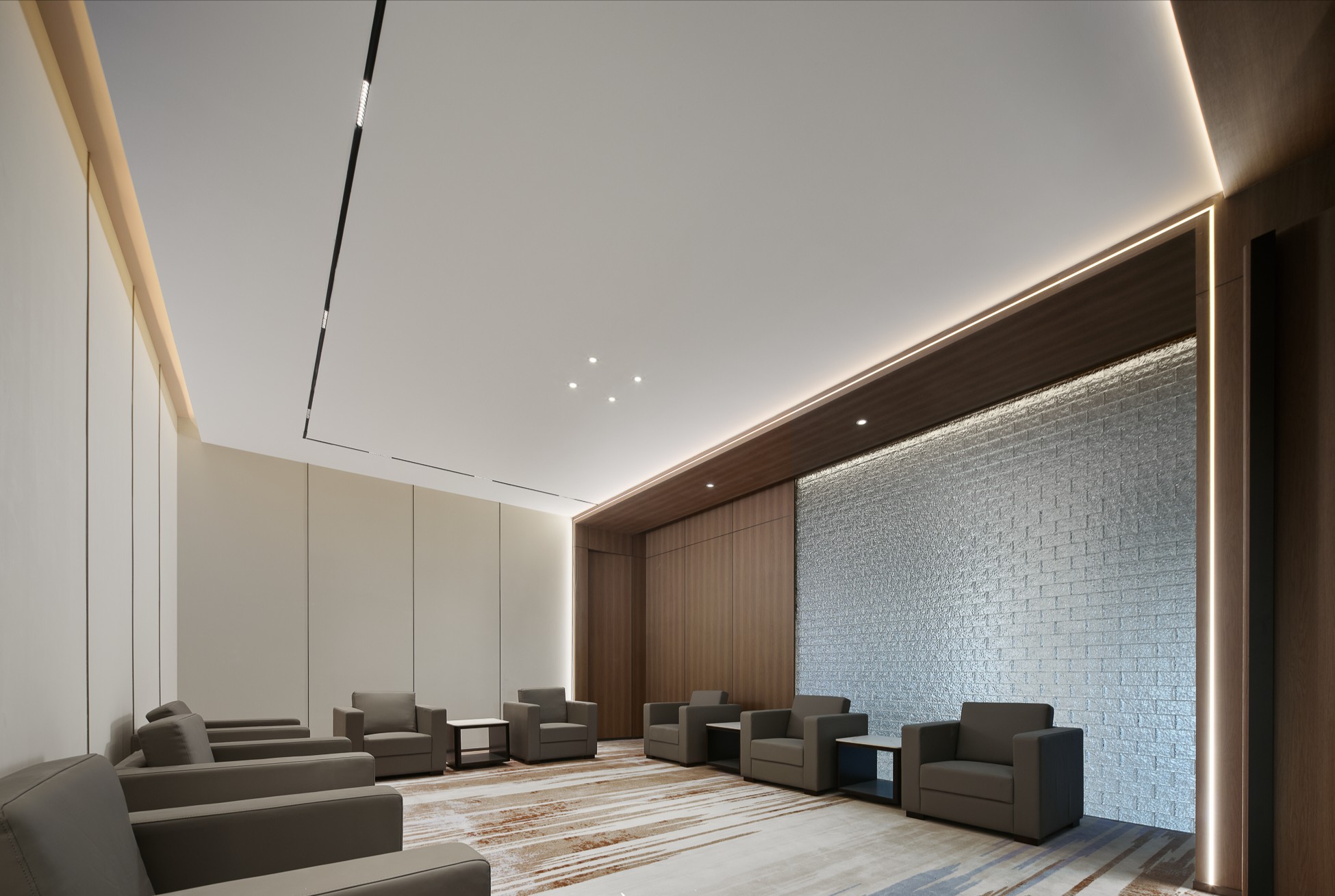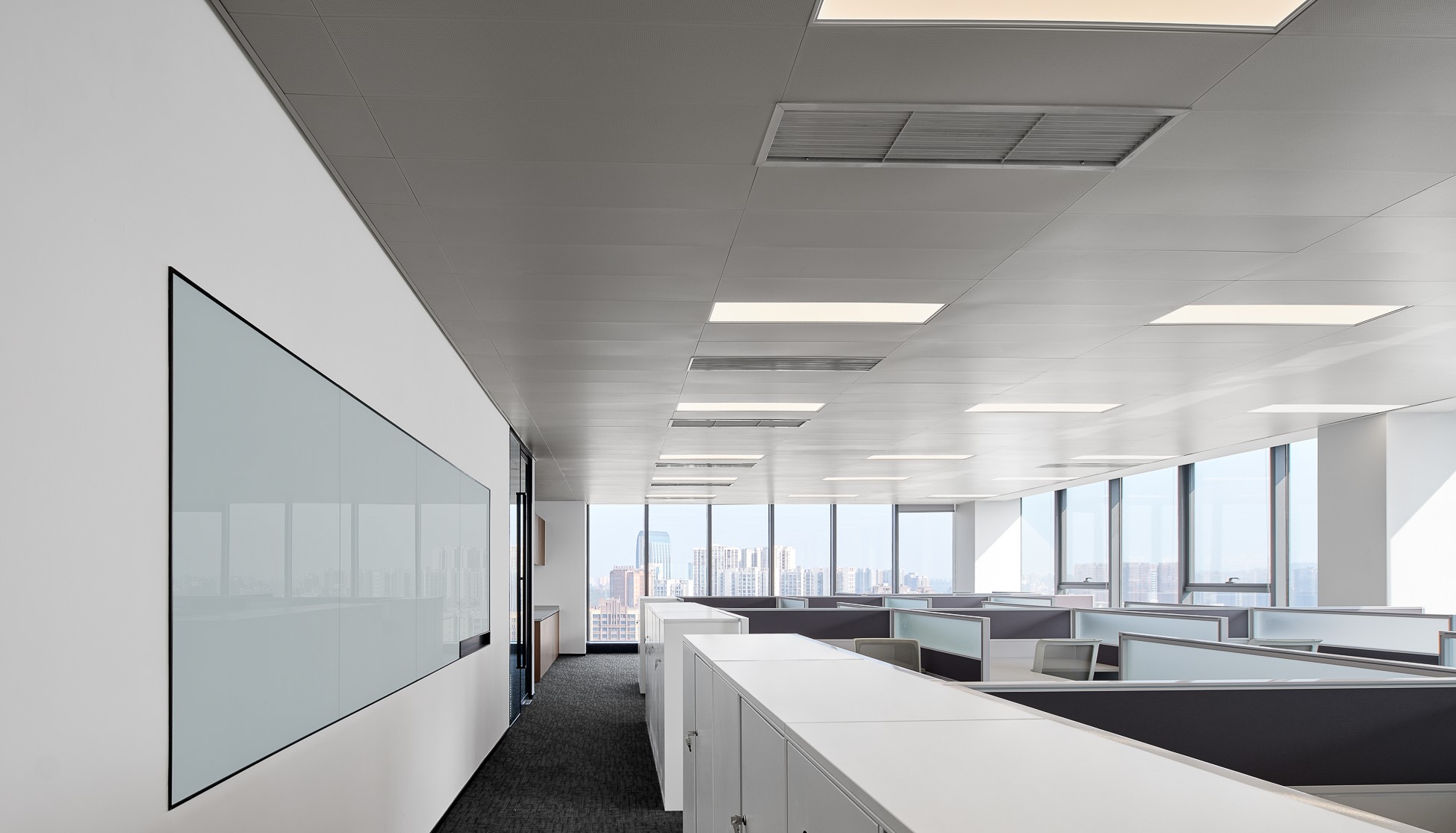 办公空间的主要配色是白蓝,利用横纵交错及多变的白蓝的线条,体现专业、高效、冷峻的形象。白意味着“空”,白作为“无颜色”,能够促使人想象力获得自由,在繁杂的思绪里获得安静。结合现代的设计语言和表现手法重新塑造出一个时尚、干练、舒适的办公空间。