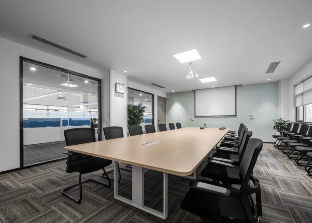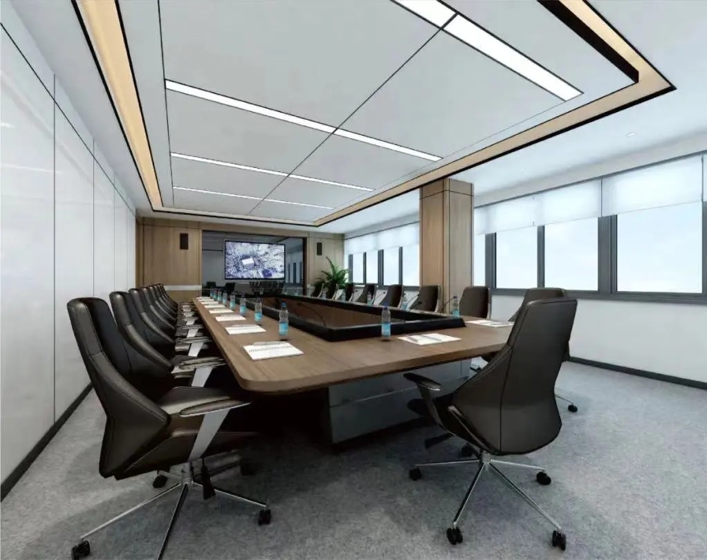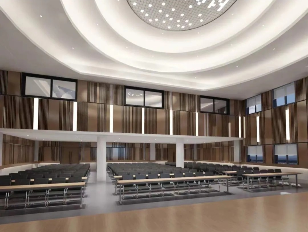 报告厅运用了圆形吊顶以及流线的空间分隔。结合了展厅的设计特点,软装配饰的风格也同样是选用一些流线感的木饰面吸音板,顶面通过一些几何结构和流动性线条打造一个抽象且动态的空间。