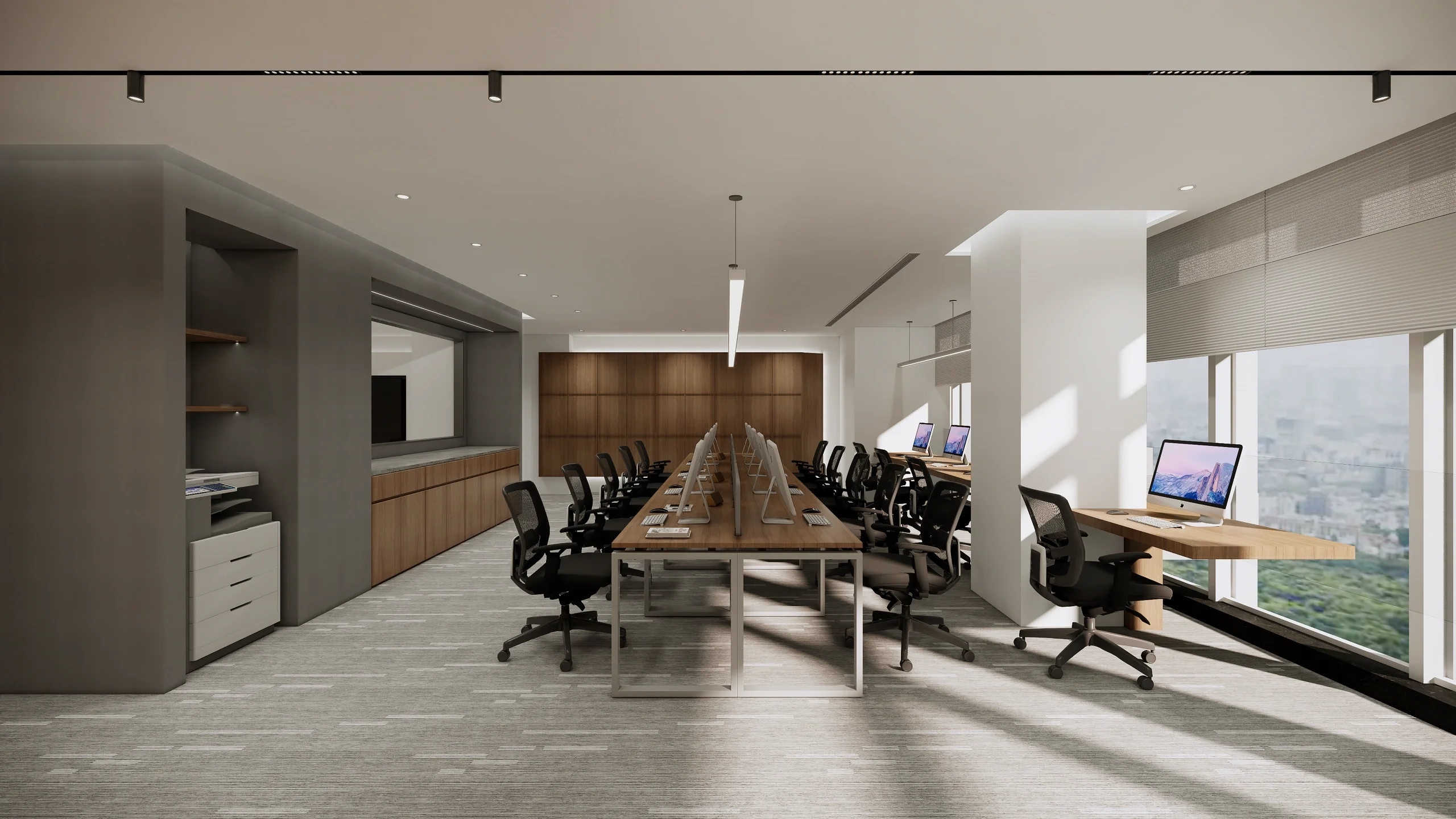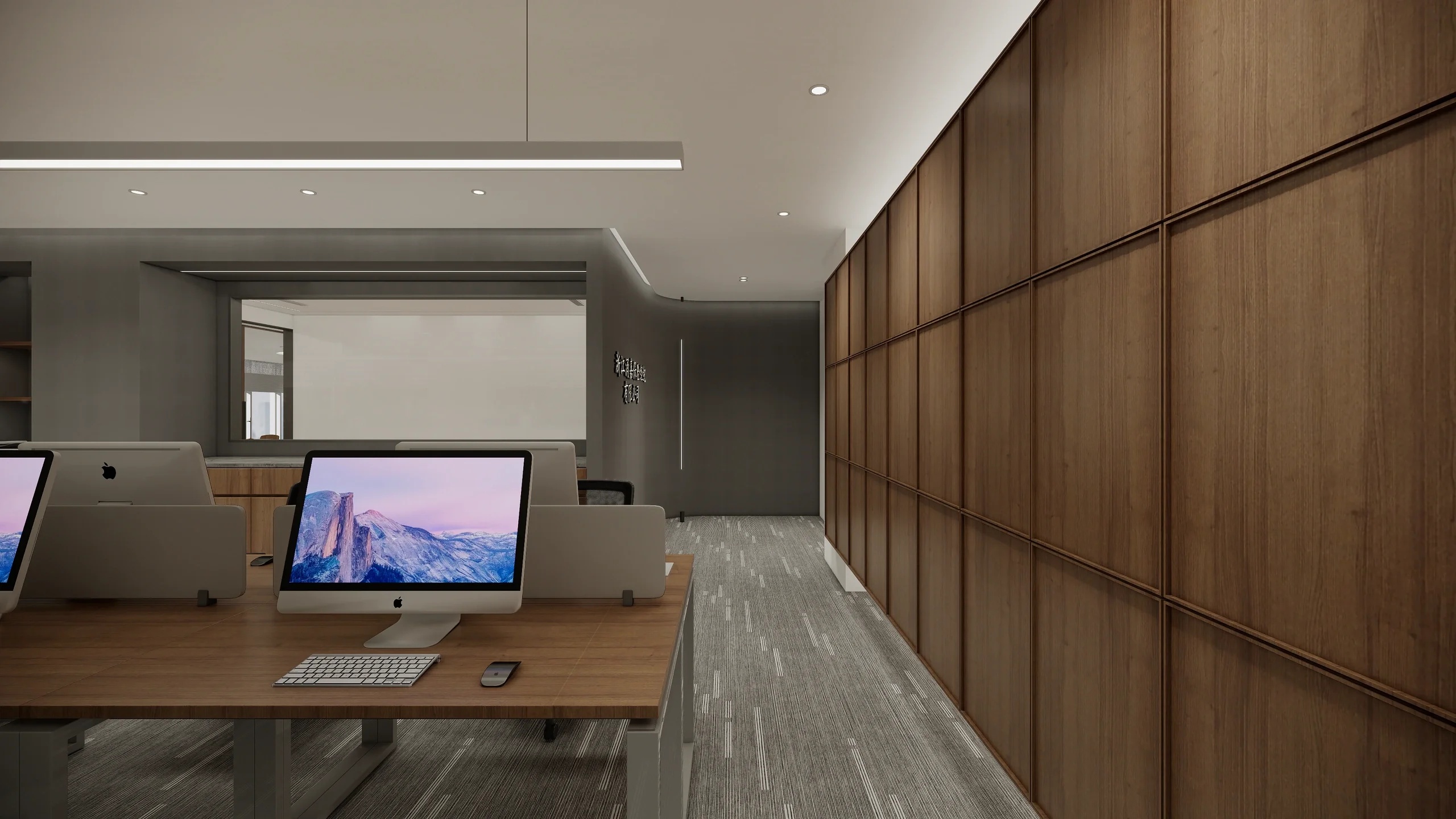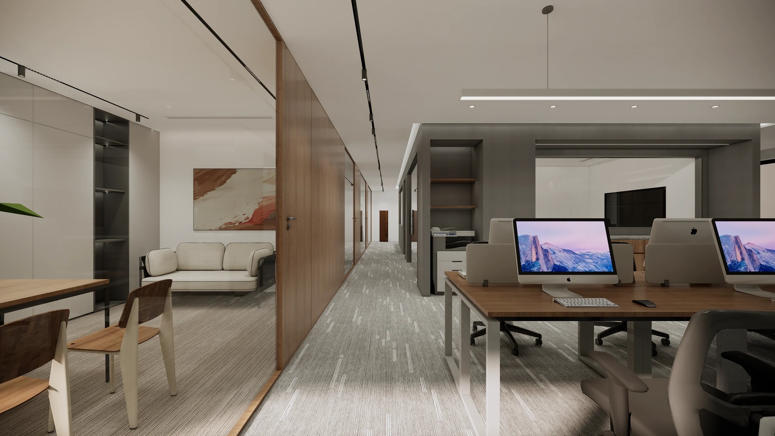 结合现代创新和经典元素运用,加大胆设计灵感,采用英国银行上世纪30年代风格提取经典元素,墨绿色台灯演变与现代空间结合,重新创造出“新”精英办公空间。