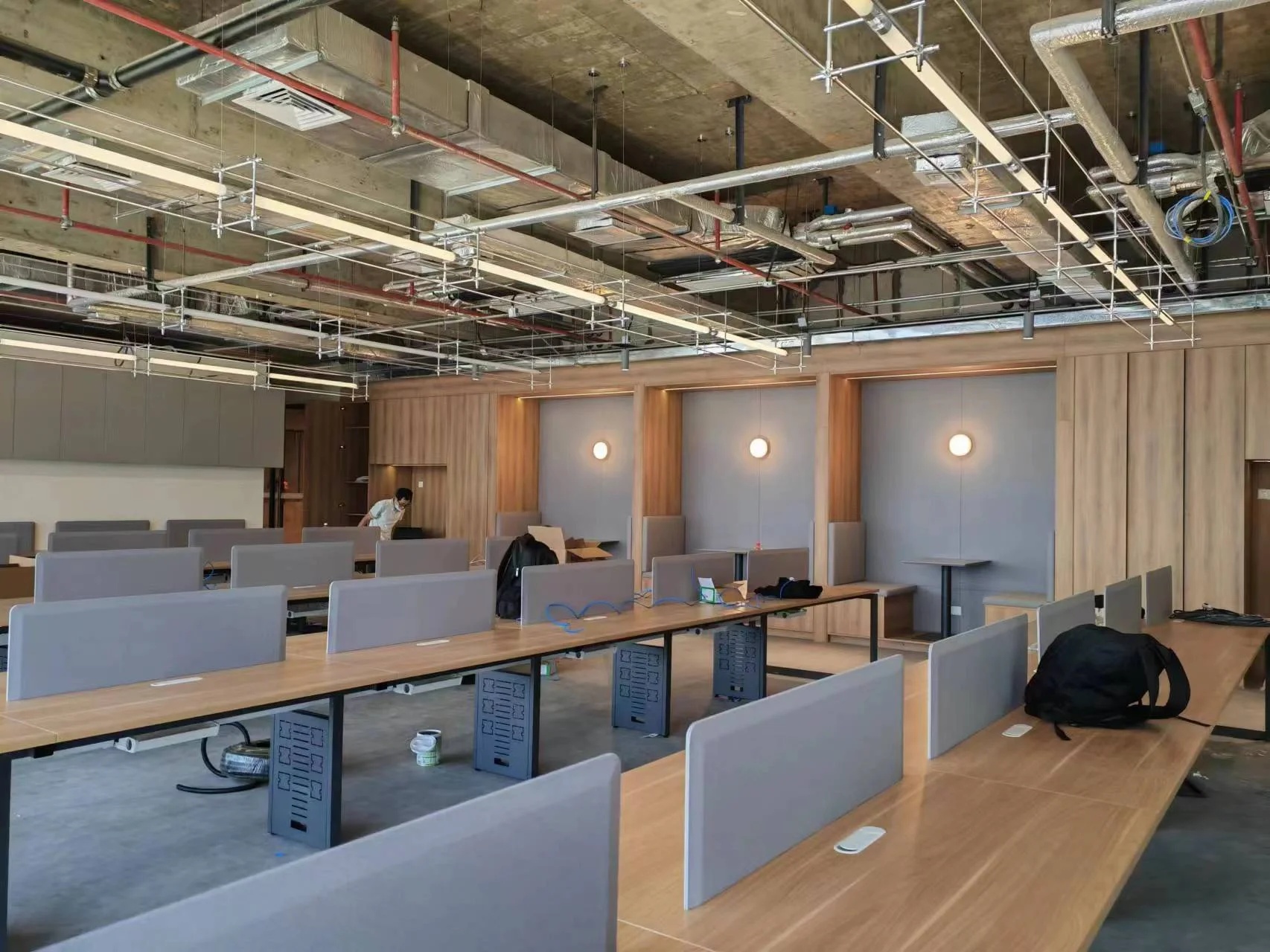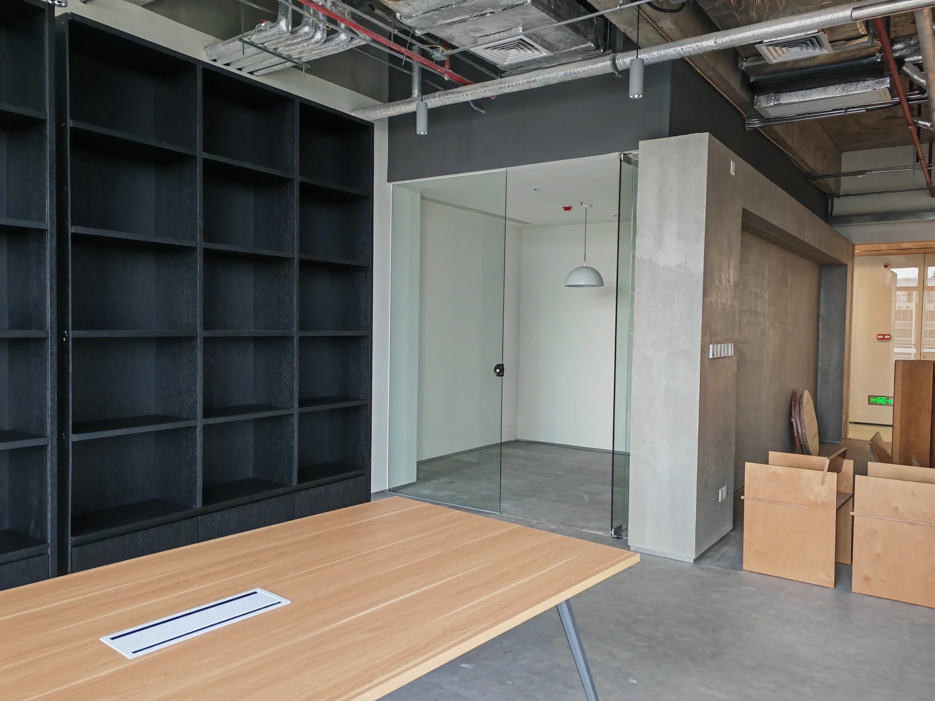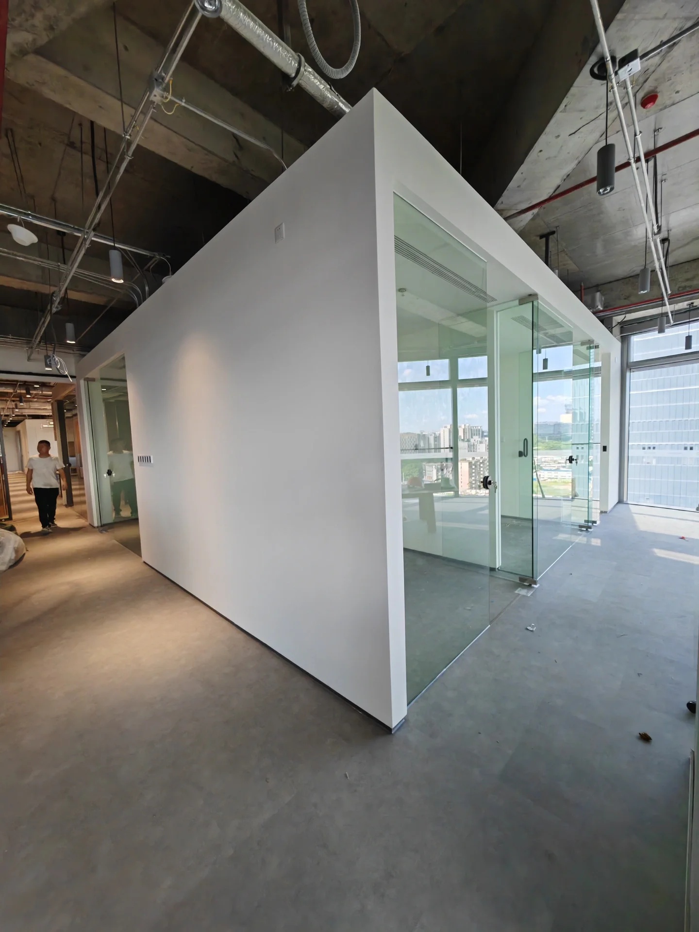 办公室和过道以隐形门相隔,保留过道整体性。确保了办公的私密与安静,办公室延伸了木饰面的主体材质,用大象灰作背景赋予低调的品质!