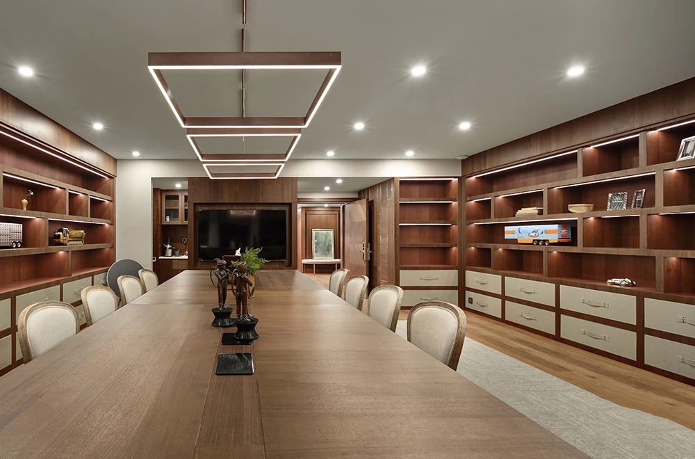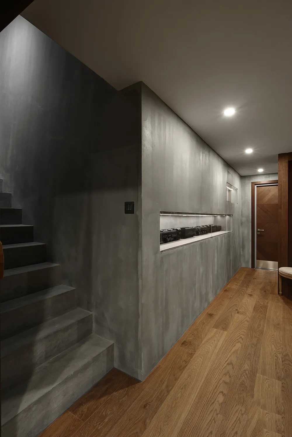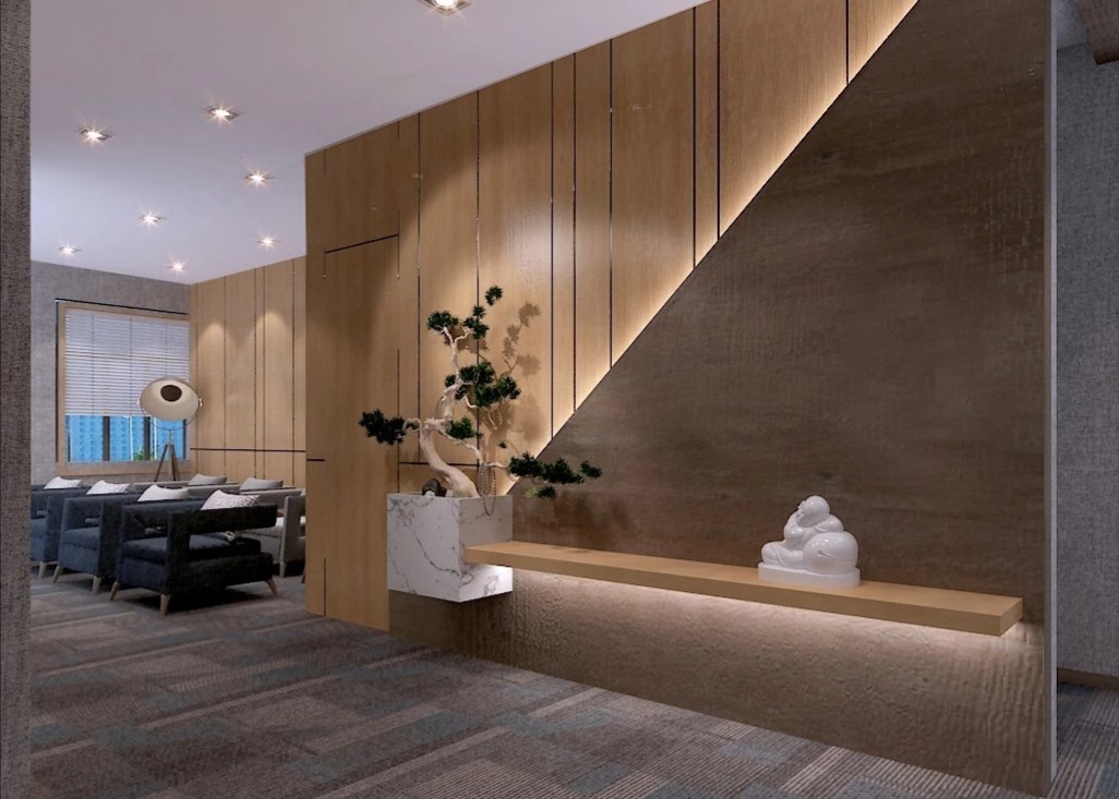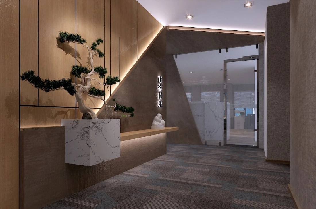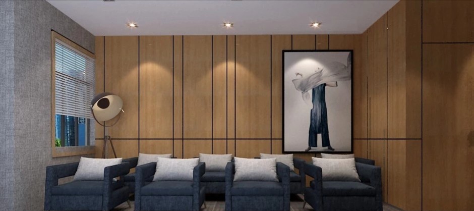 整个空间都是我们全手工制作的,并且采用了完美铺贴法。尽量做到‘0’踢脚线和‘0’收口条的工艺。会所室内所包含的木作从木门到展柜,从玄关隔墙再到卫生间储藏,全部都是由工人师傅到现场定制,从打造框架结构到木皮纹路对接再到收边打磨全都是手工制作。地面材质的处理使用了木地板、水泥、地毯,三种材质的无缝拼接,办公区域吊顶以水泥调为核心,搭配地板的原木材质,软硬冷暖材质在同一空间碰撞融合对比鲜明,并舍弃了通用的收边条大胆制造。