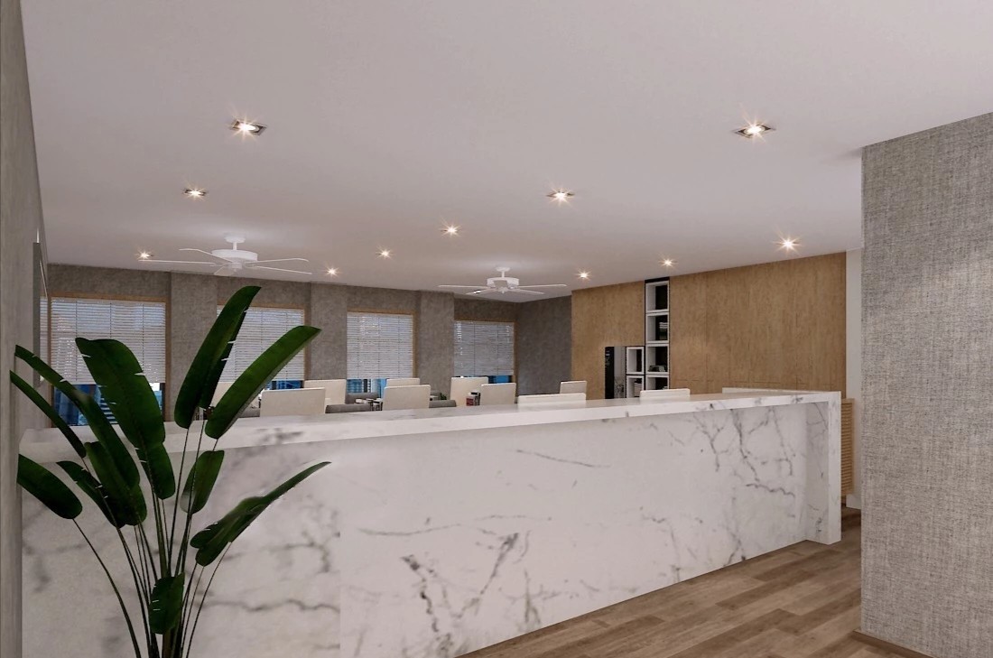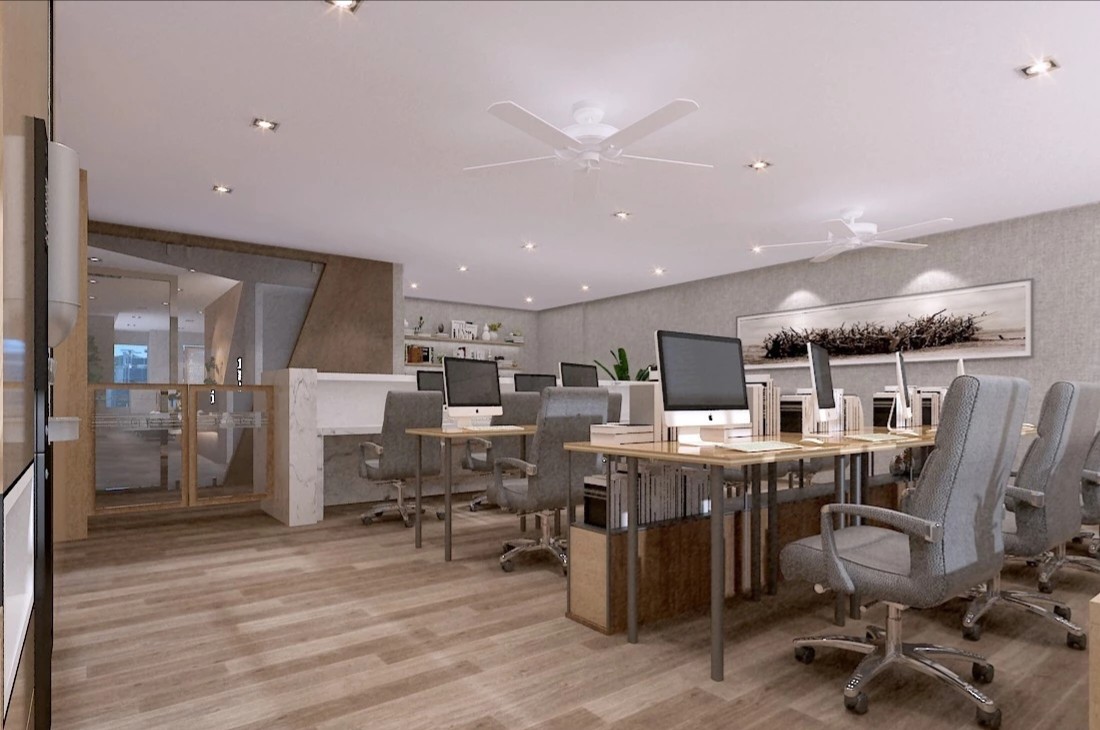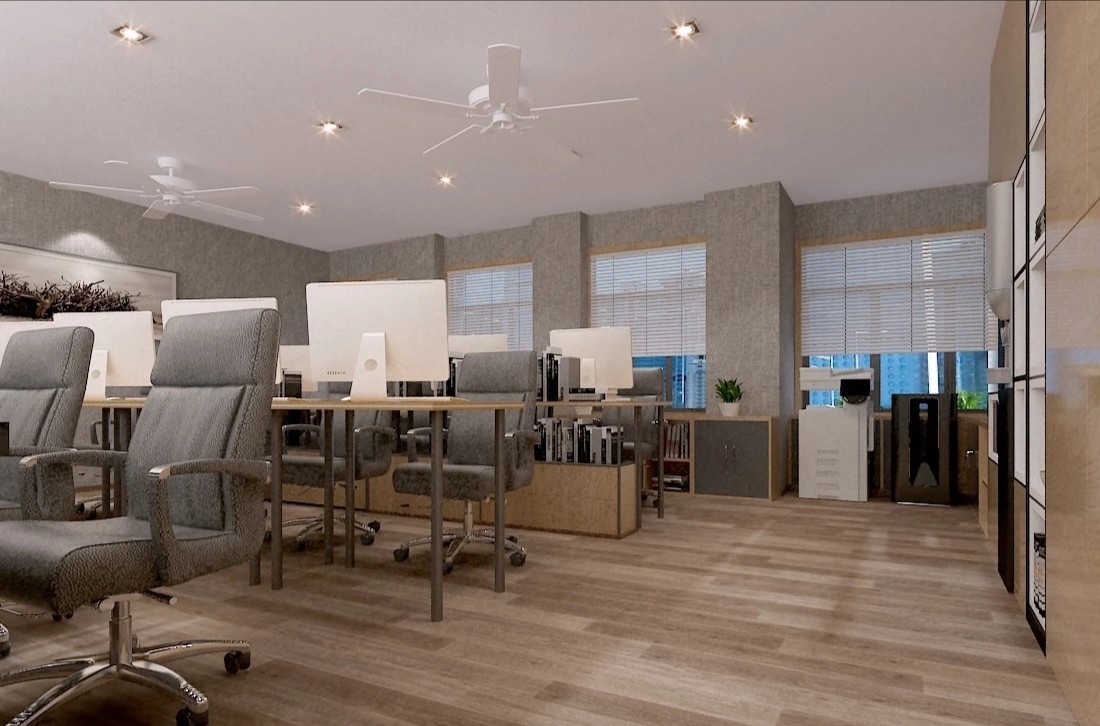 之前的空间进门就是楼梯,右手边就是一个很大的会议空间放了很多的椅子,显得非常的拥挤,左手边是一个办公桌,而且卫生间就在外面裸露着,整个空间的统一性比较差。我们首先做的最大的改动就是在进门的地方加入了一个玄关墙,让楼梯口和大门空间有一个缓冲,在墙面上做了一个隐形门,将卫生间很好的包裹进去,进门左手边做成了客户等候区,客户不会因为卫生间在旁边显得尴尬或者不舒适。反而可以在有需要的时候推开隐形门使用,门推开时灯会自动打开不用担心找不到开关的问题,非常的方便。