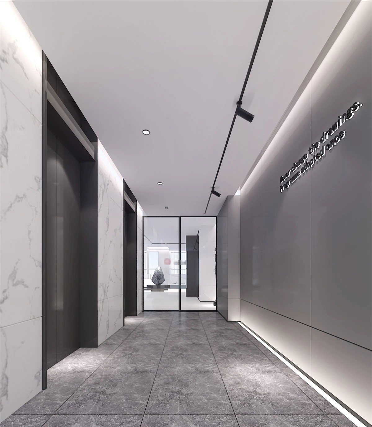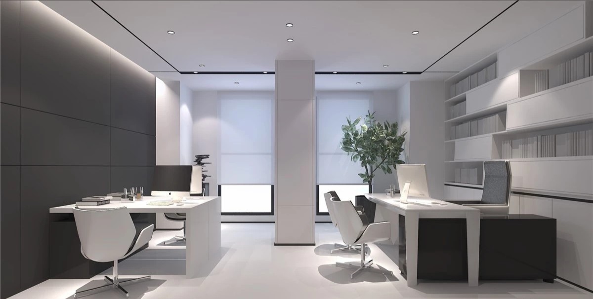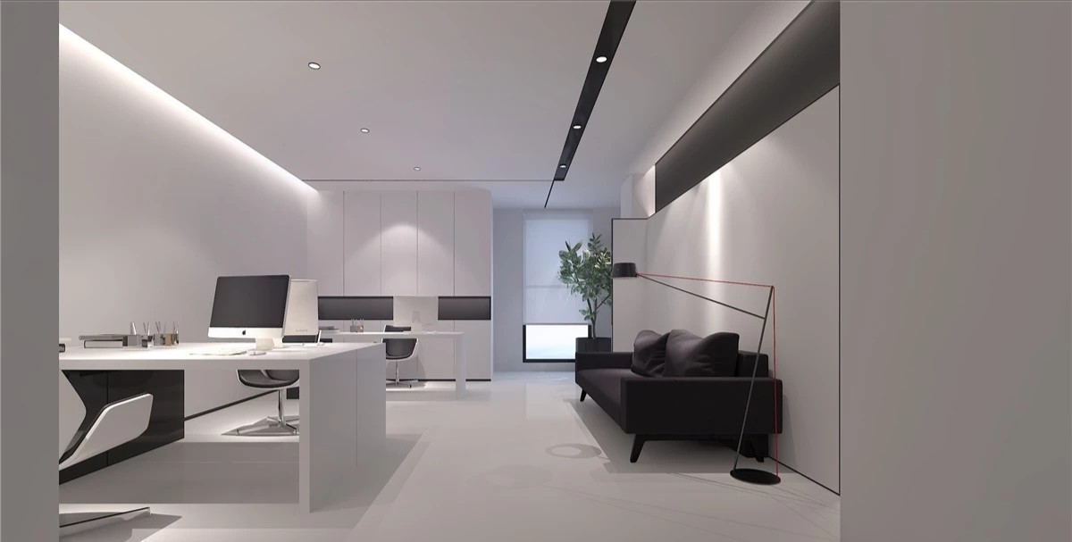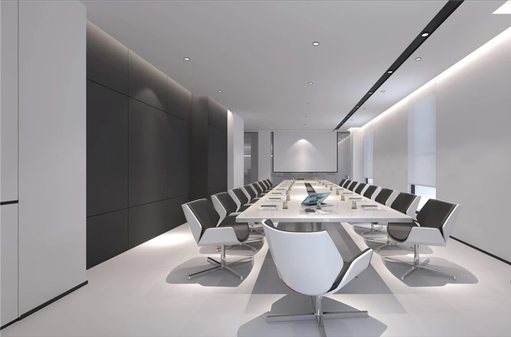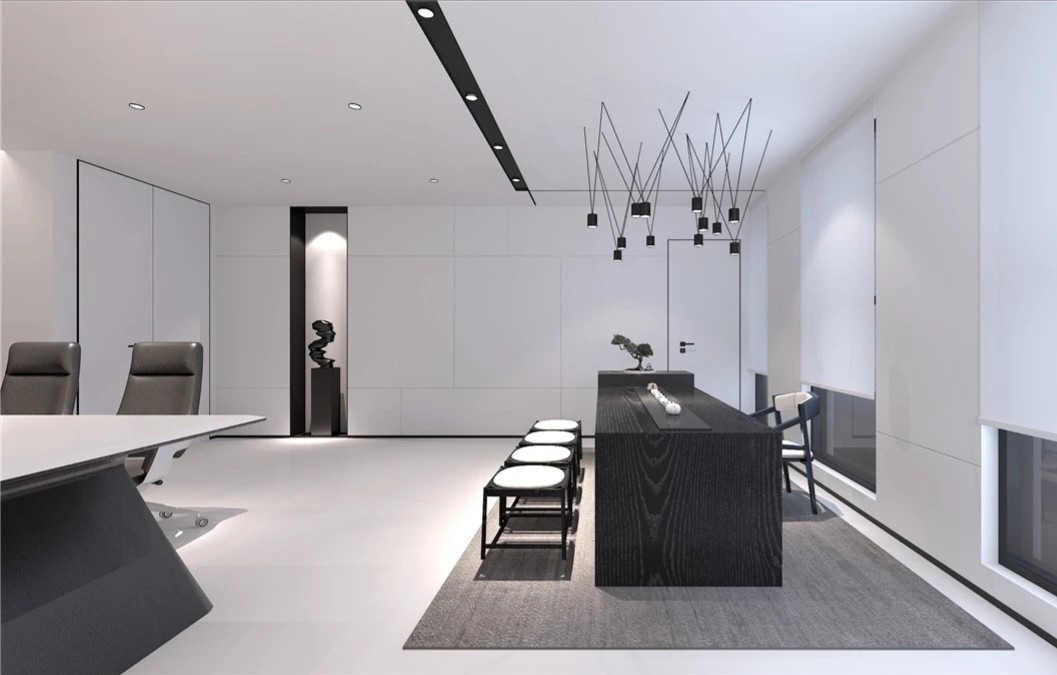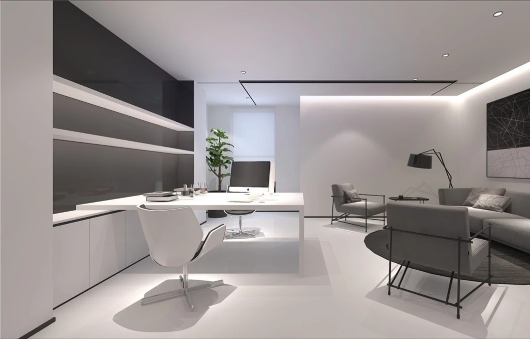 色调上,纯白为主色,深灰色辅之,呼应了这群地产青年直白坦率的为人处世之道。同时,白与灰也是百搭色,可以承接变化万千的图案与色彩,方便公司未来业务的多维拓展与多样展示。风格上,为适应年轻员工的现代化审美需要,删繁就简,桌椅、沙发、灯带均使用极简线条,直线与弧线,方形、圆形或是三角。造就舒适的视觉观感,时尚简约,兼具未来科技范儿。少而简的装饰,最大限度减少对员工思维与视线的干扰,使他们更专注于高强度快节奏的地产事务。