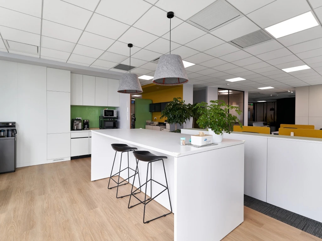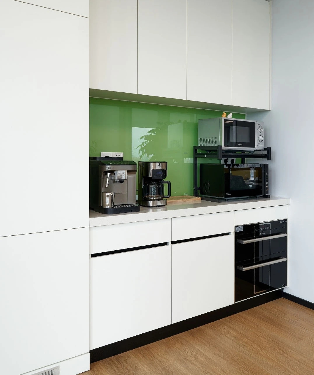 明净的空间伴随着视线纵深向前,空间的色彩也随之变换,带来活力的气息。复合型社交空间【餐厅】里吧台、桌椅、橱柜、咖啡机、微波炉、饮水机、洗碗机、跑步机等多样化功能需求一应俱全,温馨舒适、采光极佳的空间也衬托了舒适放松休闲的氛围,这里是公司员工用餐聚餐、放松休息的聚集地。