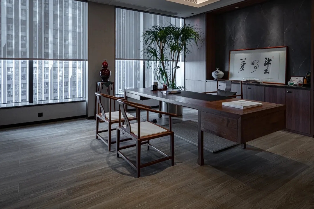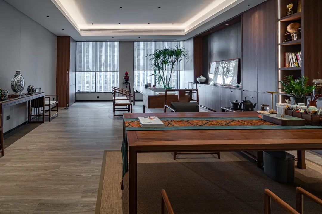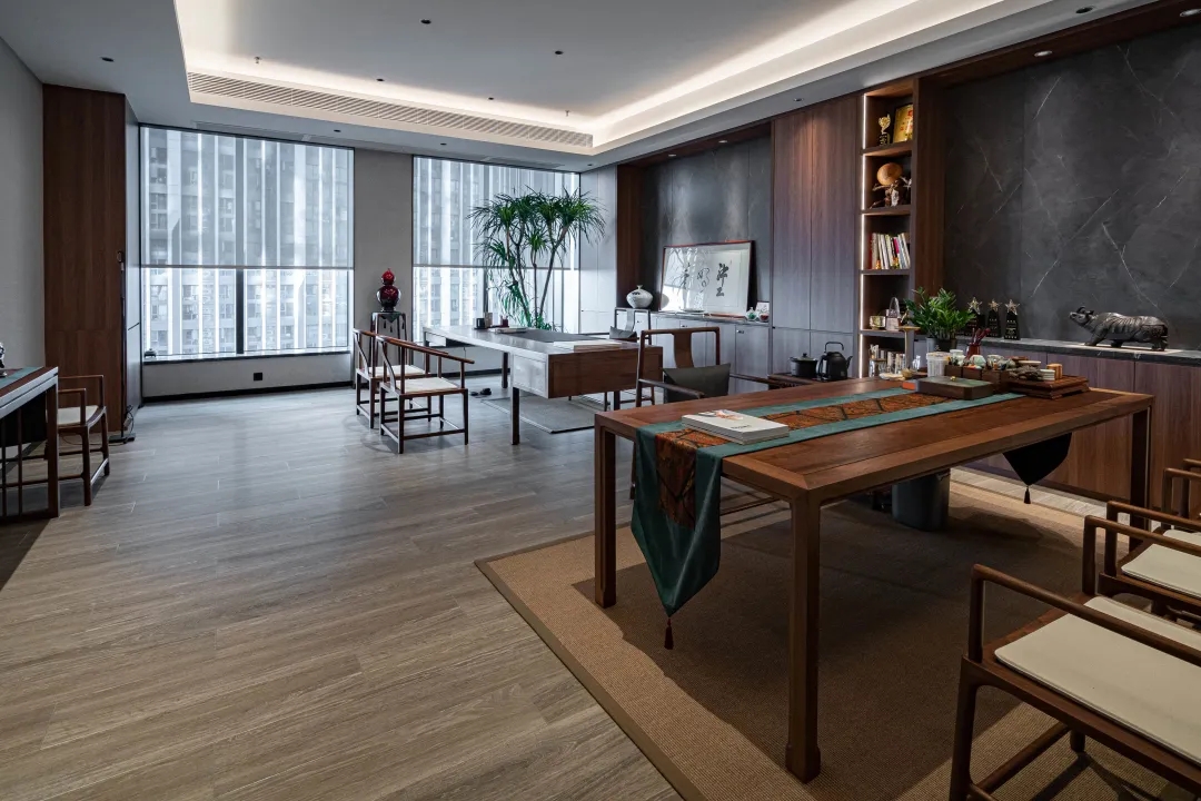 业主面向的客户多来自大企业的精英群体,办公室仍决定以时尚中式的姿态向外输出其理念和经营策略,无论从室内主色调、空间总体氛围亦或是启建设计工程想表达的实力和态度,灵感与选材均注入东方蕴雅。