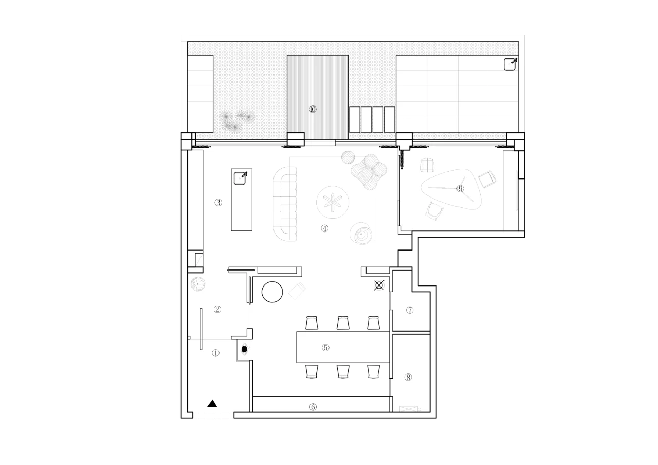 在办公与接待功能维稳的状态下,扩展西厨与露台的面积,强调家的和谐温馨、轻松愉快的氛围,链接办公空间与居家情态,让休闲娱乐也成为“工作的一部分”,未来也能让在这办公的设计师们迸发出更多设计灵感。