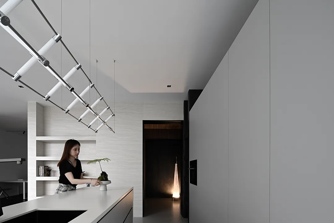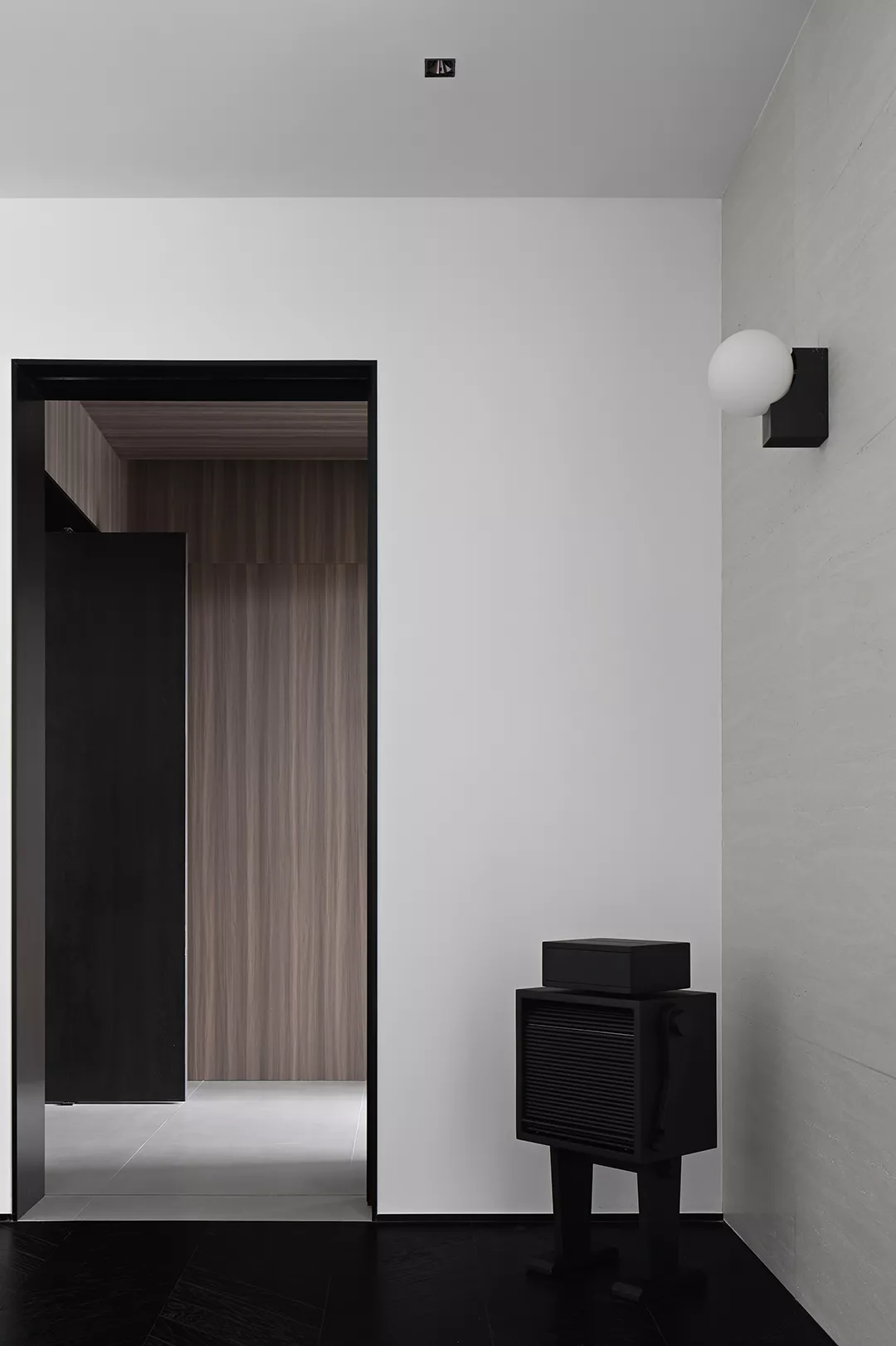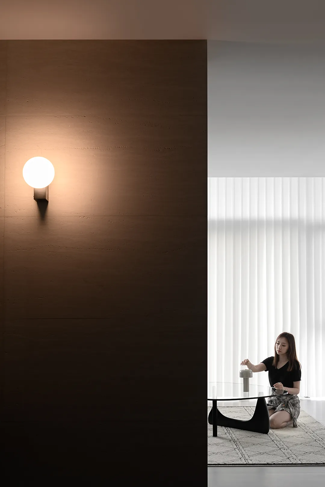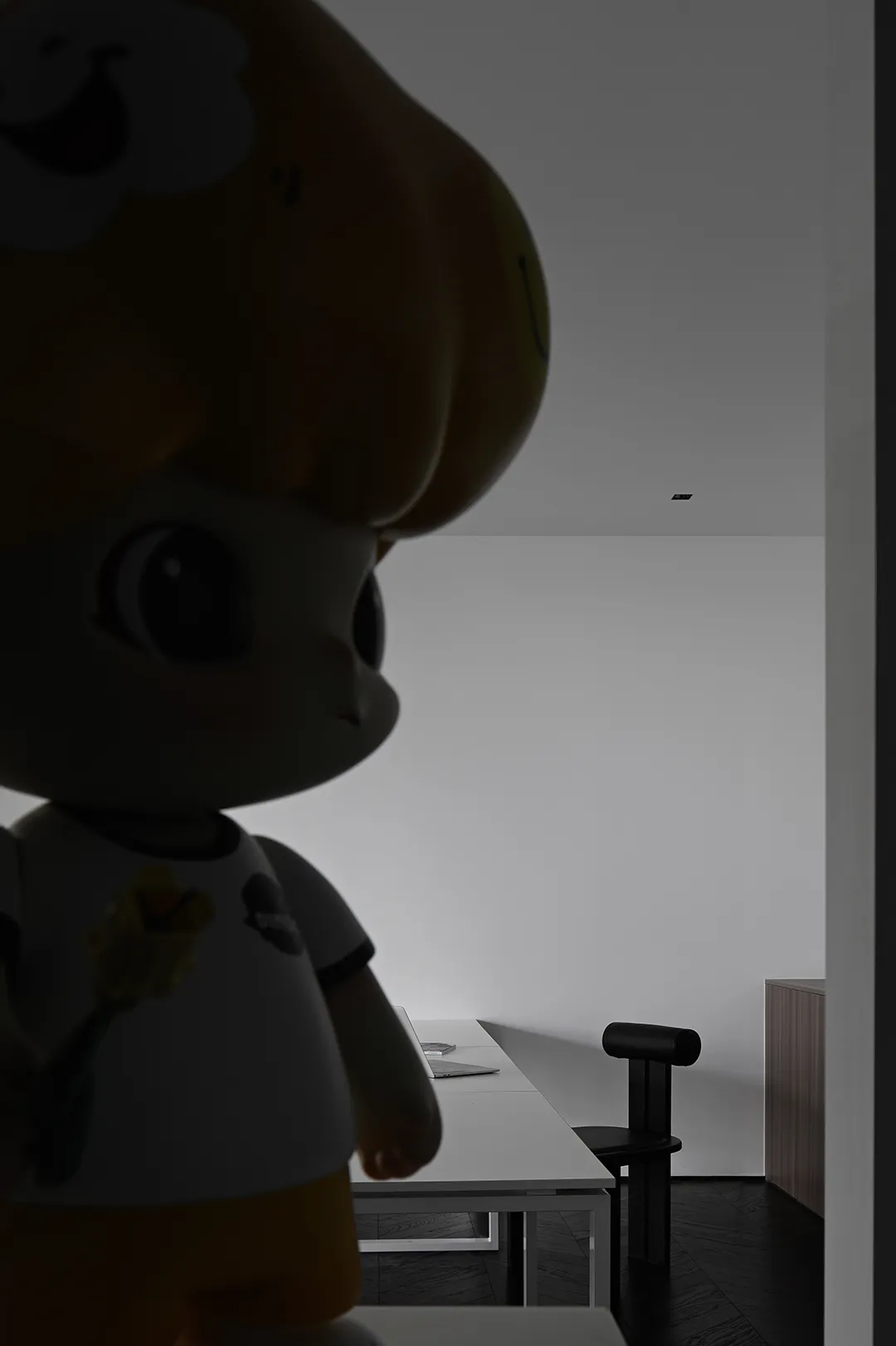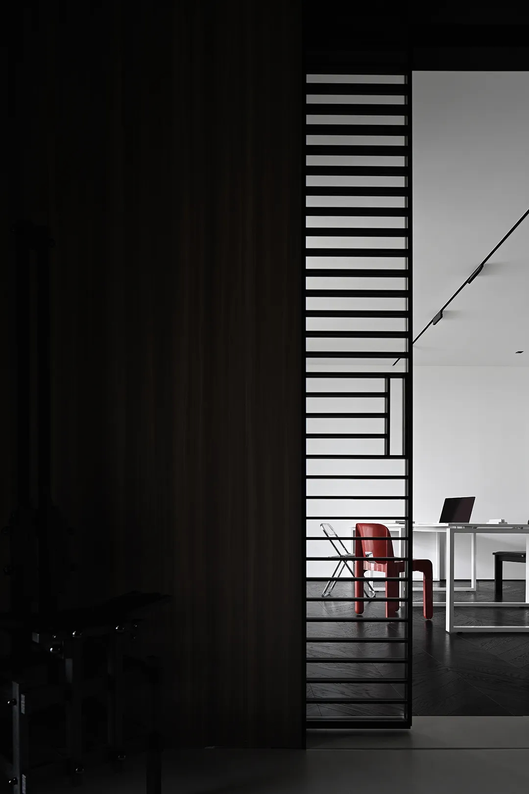 让身体有一种“逃离办公室”的错觉。内外双玄关的设计,解决了原始建筑写字楼的限制,也让空间动线更多样性。塑造从明转暗,再由暗转明的空间脉络,于自然过渡的动线之内阐释简约空间的多样性、层次性与可能性,也让每一个来工作室的人都有一段不一样的印象。