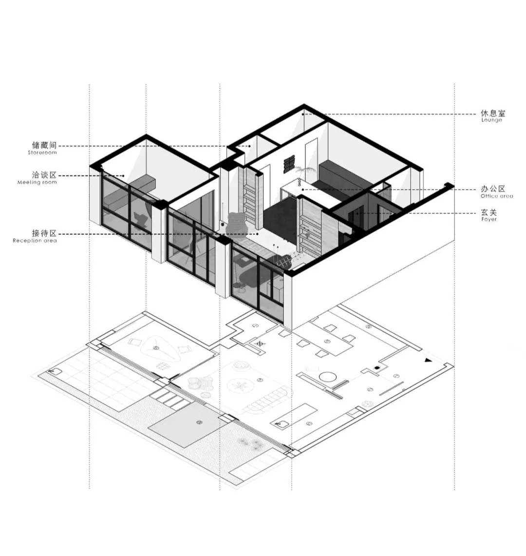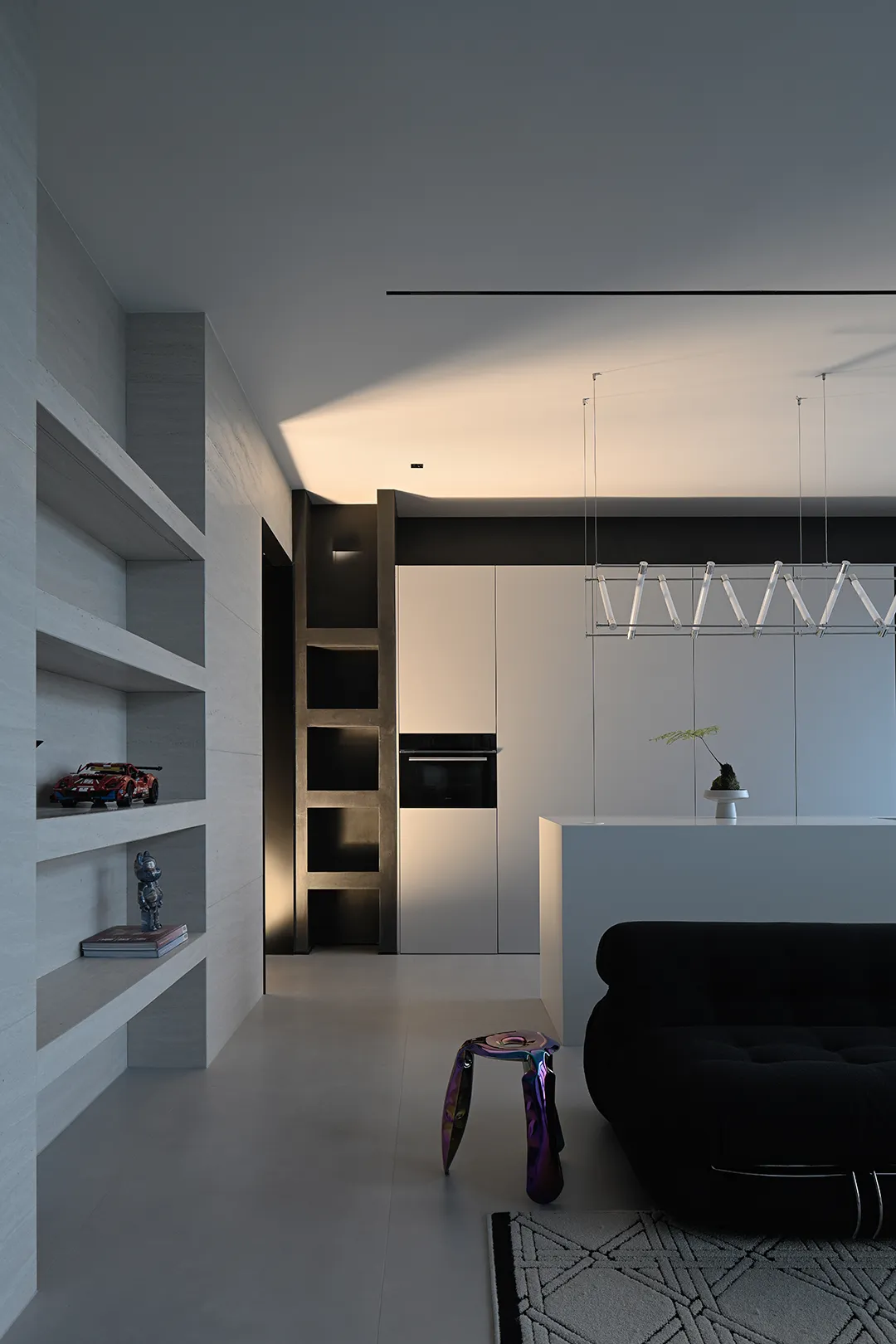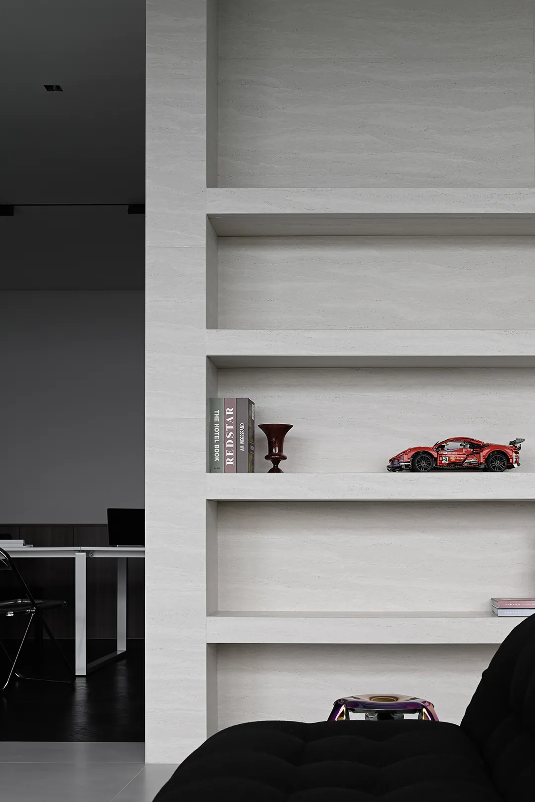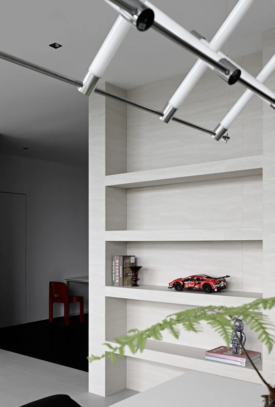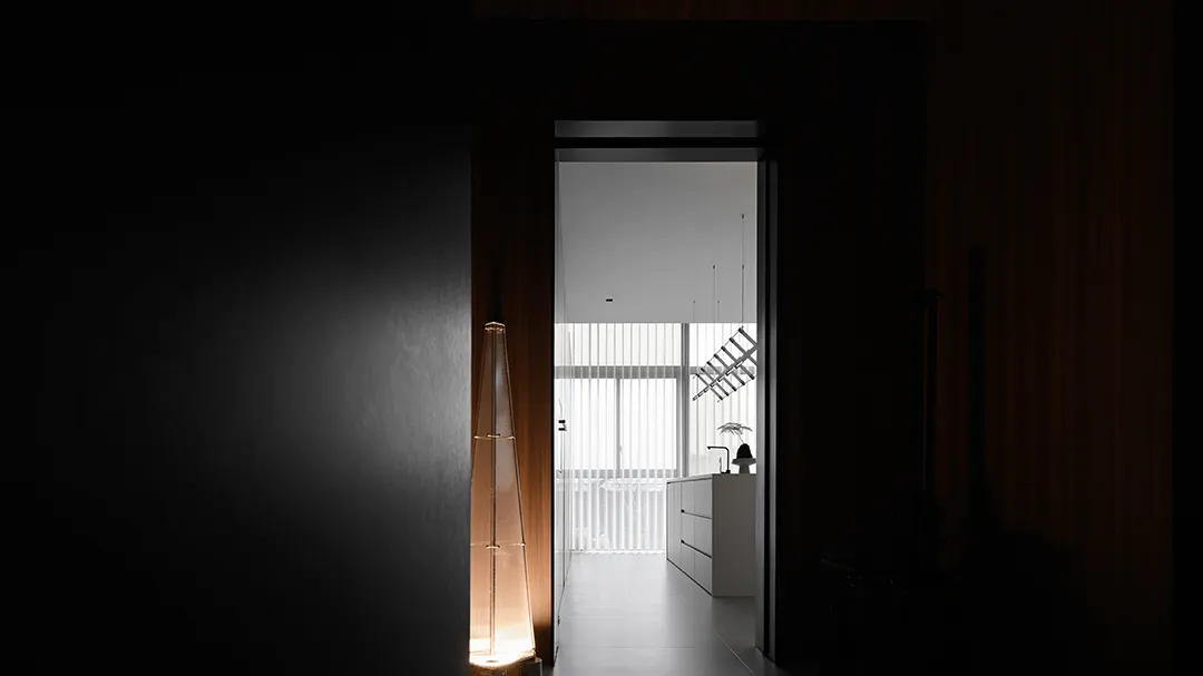 让身体有一种“逃离办公室”的错觉。内外双玄关的设计,解决了原始建筑写字楼的限制,也让空间动线更多样性。塑造从明转暗,再由暗转明的空间脉络,于自然过渡的动线之内阐释简约空间的多样性、层次性与可能性,也让每一个来工作室的人都有一段不一样的印象。