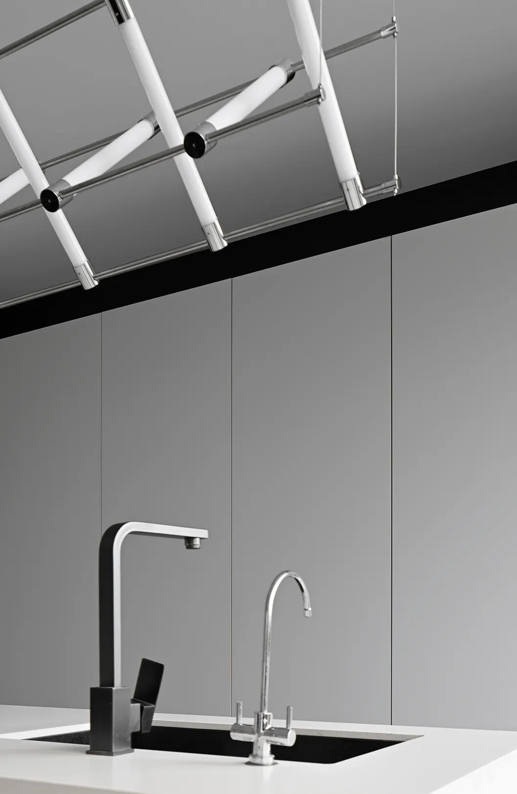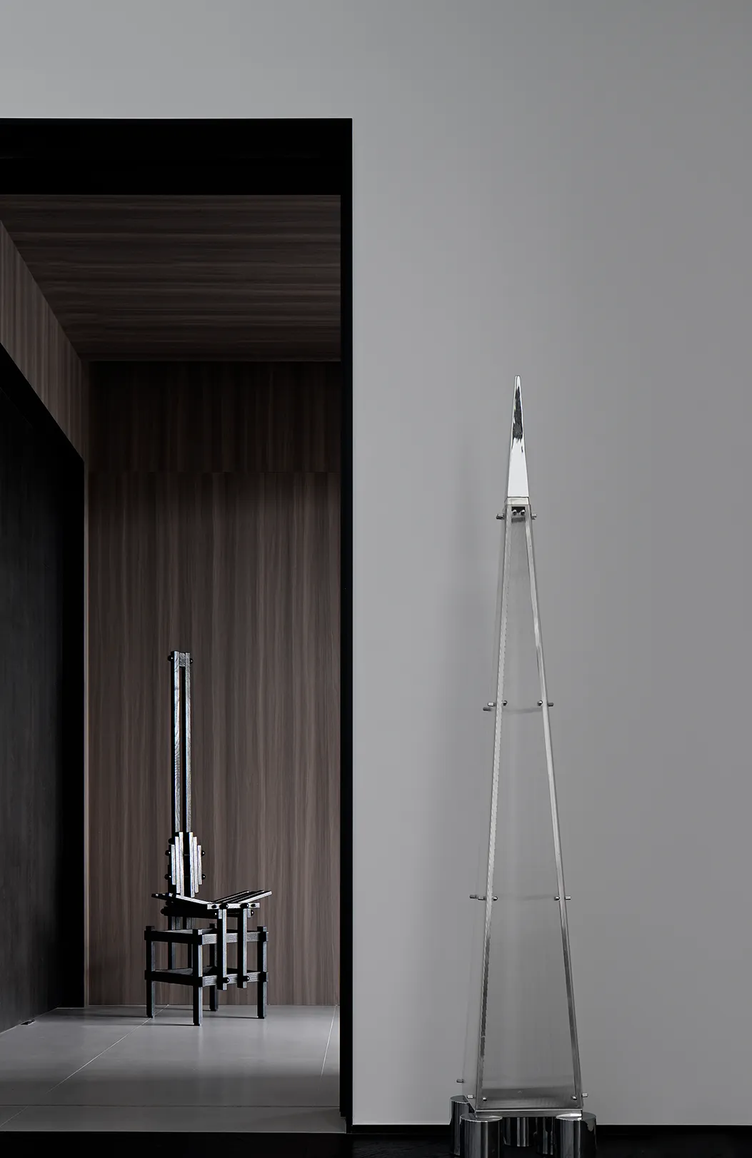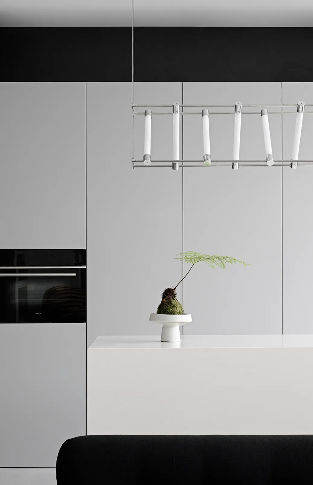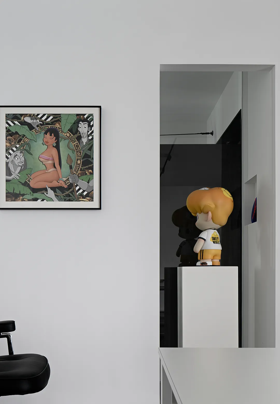 让身体有一种“逃离办公室”的错觉。内外双玄关的设计,解决了原始建筑写字楼的限制,也让空间动线更多样性。塑造从明转暗,再由暗转明的空间脉络,于自然过渡的动线之内阐释简约空间的多样性、层次性与可能性,也让每一个来工作室的人都有一段不一样的印象。