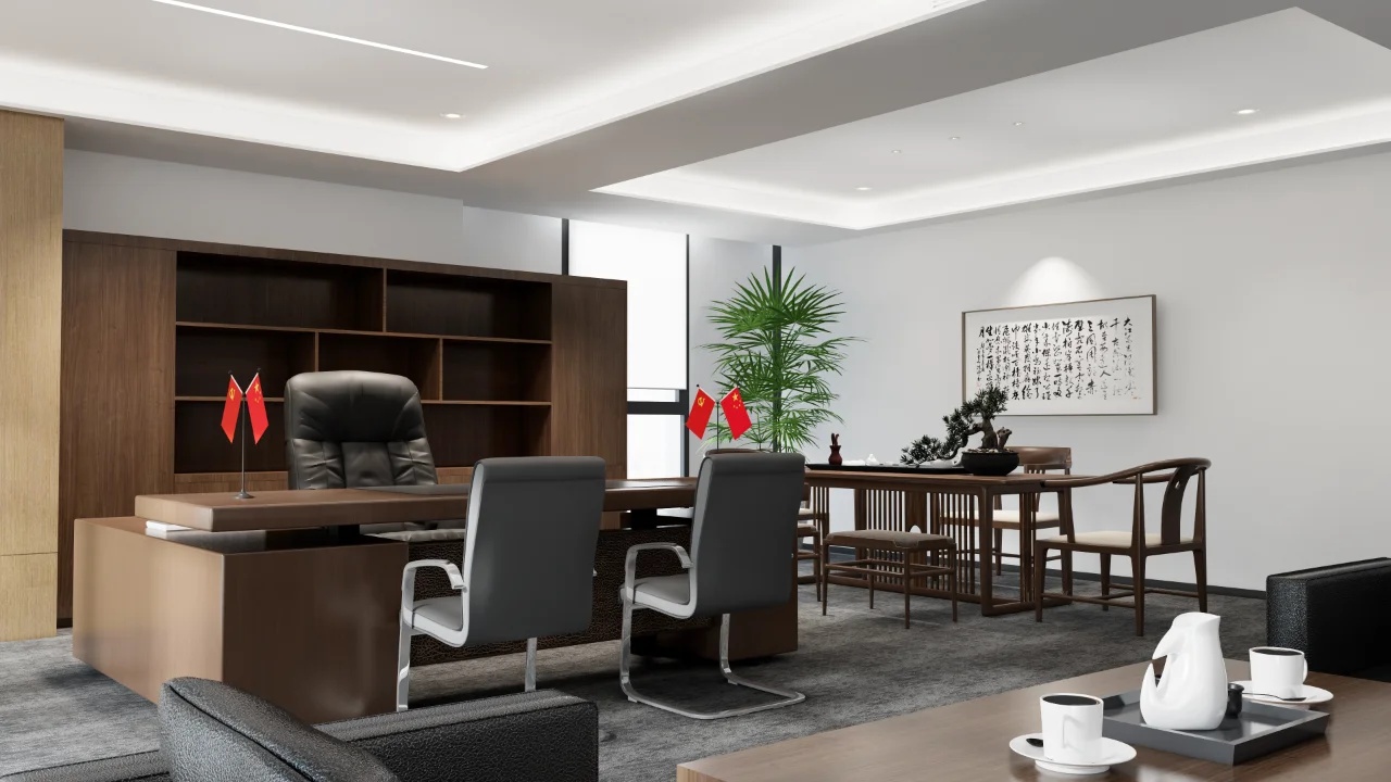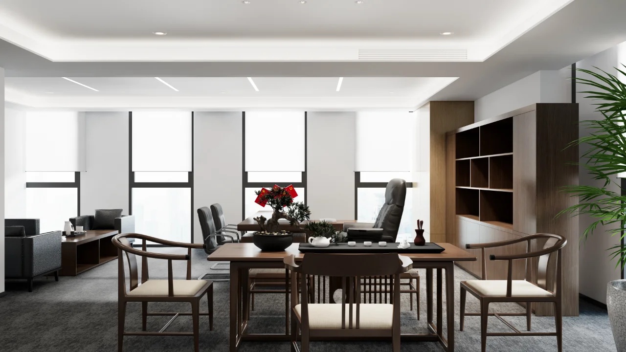 镂空屏风的另一侧是办公区域,两个区域由屏风进行分隔,镂空设计巧妙地划分了两个不同功能的空间,又不影响两个空间的关联,营造出隔而未断的效果