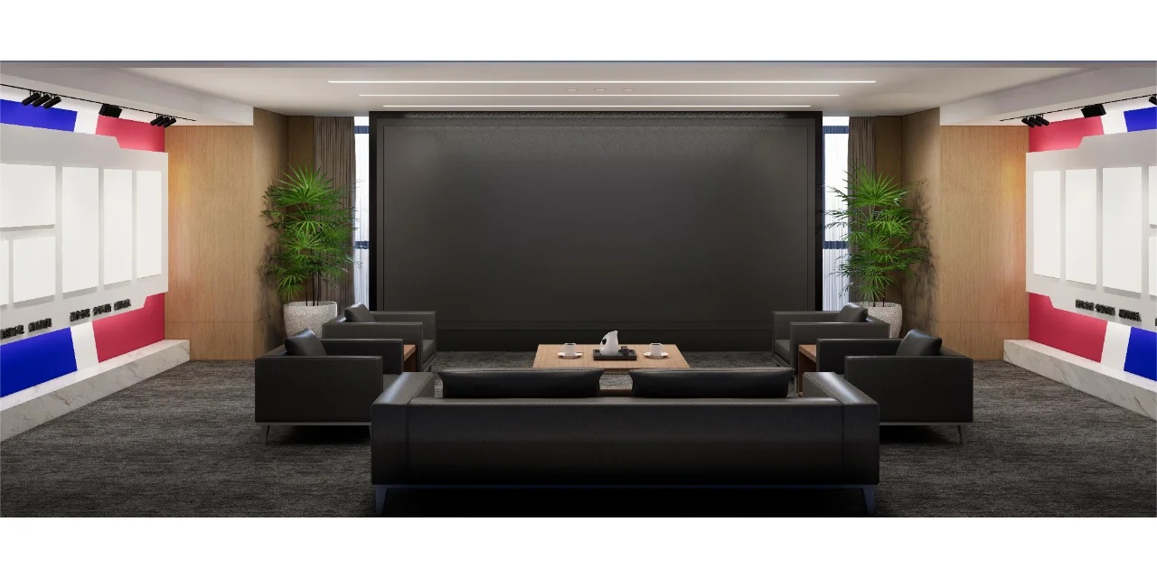 会议室通过雾化玻璃与接待区进行分割,即可满足平时空间通透感又能在会议需要时将空间封闭,会议室比较常使用在庭院的处理上,设计师将会议室窗户与庭院做对景,作为会议室空间及户外庭院空间主景