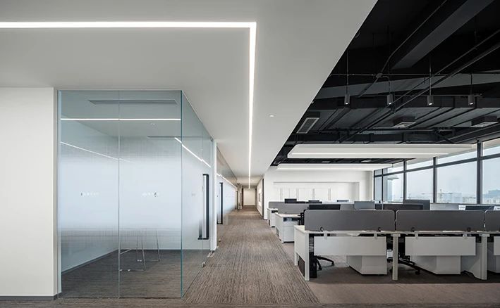 玻璃作为空间的另一个界定分割材质,在灯光的渲染下,不断映射灯带所形成的线条,无限循环,折射出丰富的空间层次。在总裁办公室与员工办公区之间形成的长方形灯带框与通透的超白玻璃充分融合,承载了使用功能的同时,也模糊了空间界限,还原了原建筑外立面绝佳的城市天际线风景。管理者与员工共同工作,合作交流更加方便。