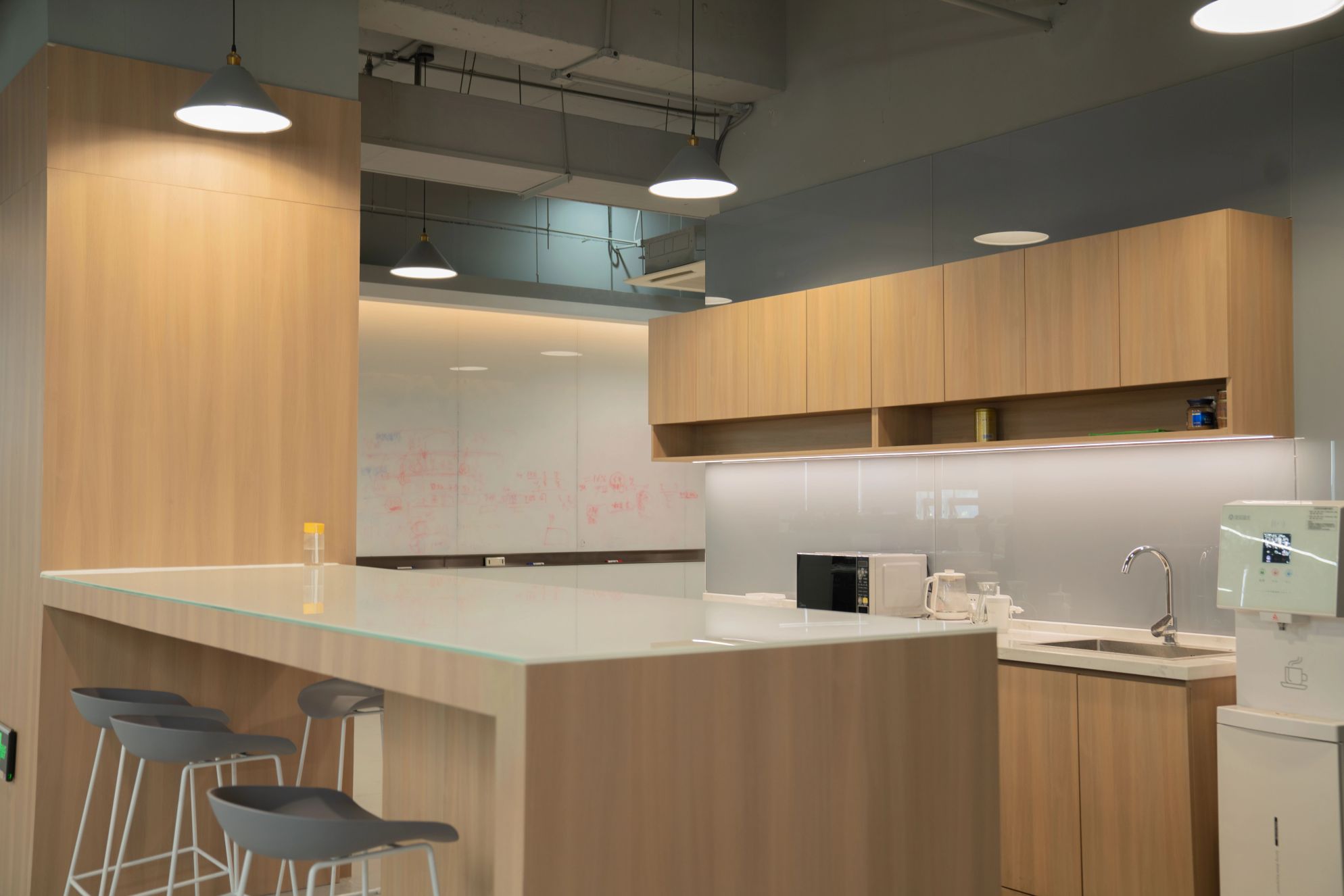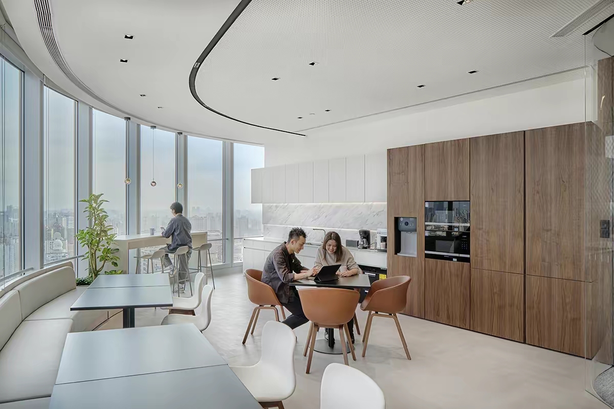 穿梭到办公区,拥有绝佳视野和光线的咖啡协作区,轻松氛围为繁忙的工作营造一份心安暖意。咖啡协作区与小型会议室还有电话间成为办公区域的“锚点”,让整个办公区更具有流动性和连贯性。木饰面肌理的变化,其与石材的交接处理,绿植的种类与摆放,装饰灯具等细节,都为整个空间从始至终营造出一种细腻而不失优雅的感觉。无论是客户还是员工,都会漾起心安如归的美好。