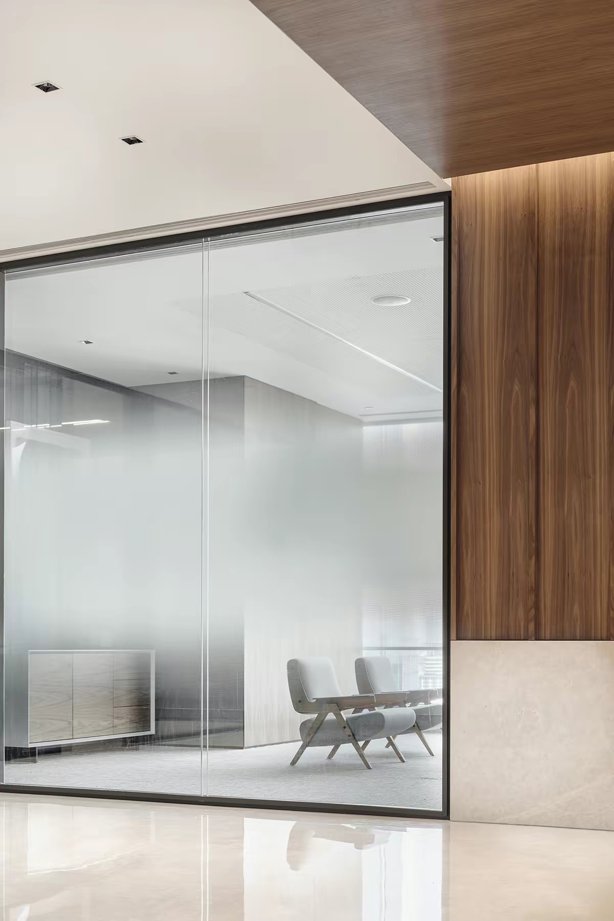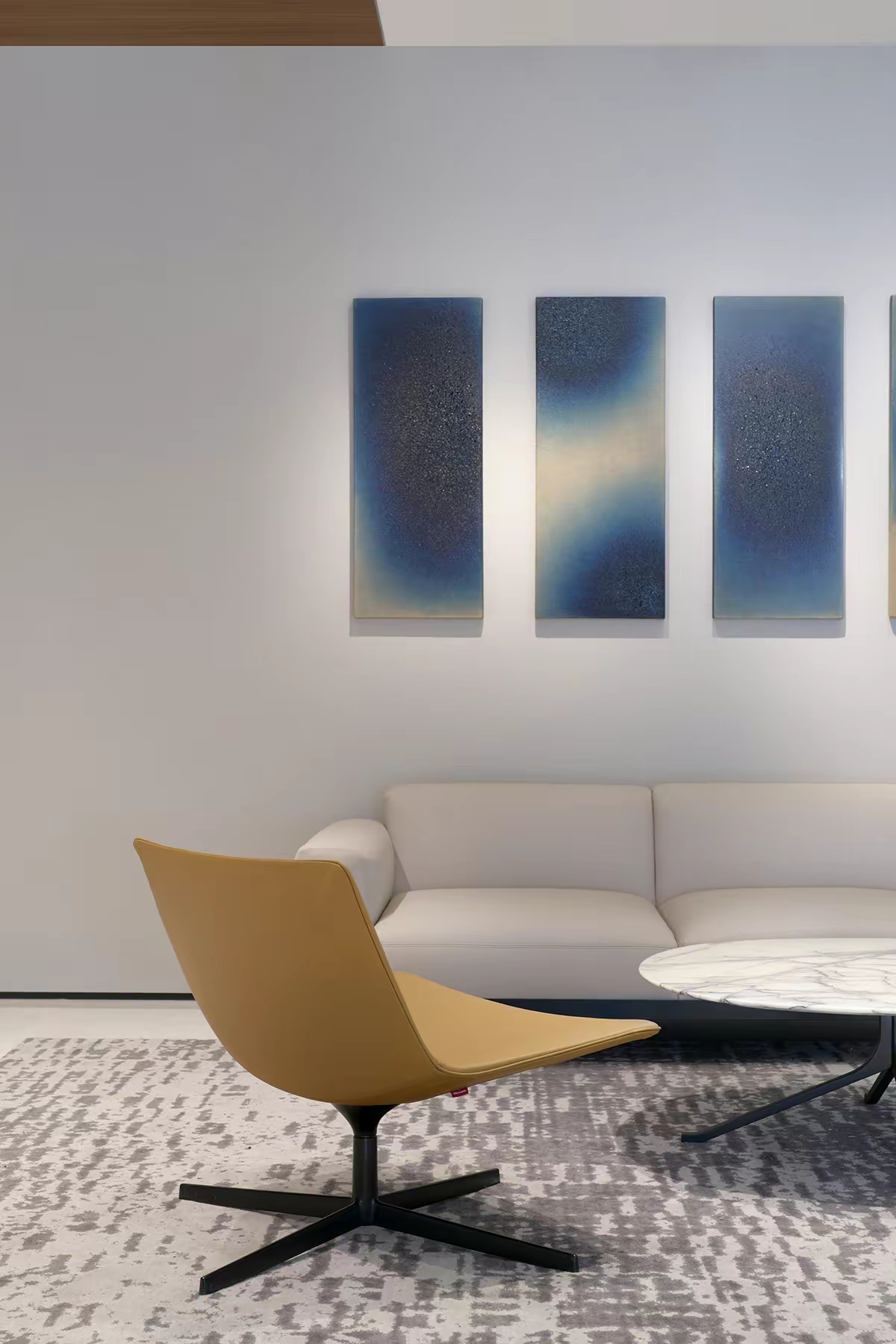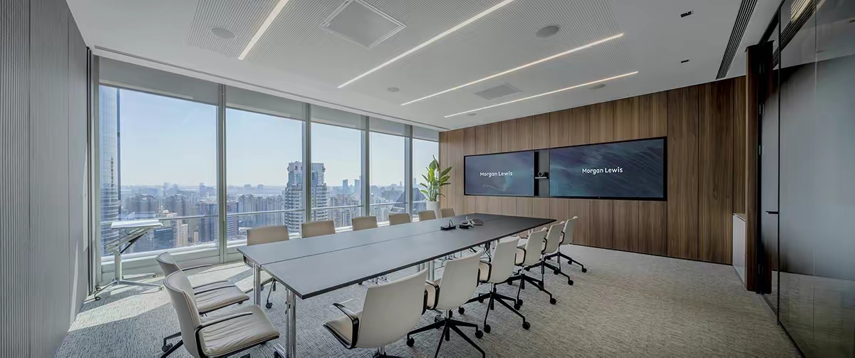 接待区以深胡桃木色为基调,带给人身居自然的感受。两段式的空间解构,配以恰到好处的艺术品点缀,给空间带来了丰富而饱满的层次。让整个空间自然,温和,且专业,自信。移动隔断把空间划分成私密的接待空间和大型会议室。隔断打开后,便可以迅速转化为大型的活动空间。 会议室淡淡灰紫色的软包墙面,不仅仅是对Morgan Lewis企业颜色的回应,其与胡桃木色的搭配,沉稳中透露着现代和充满活力的态度。