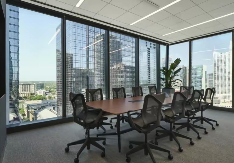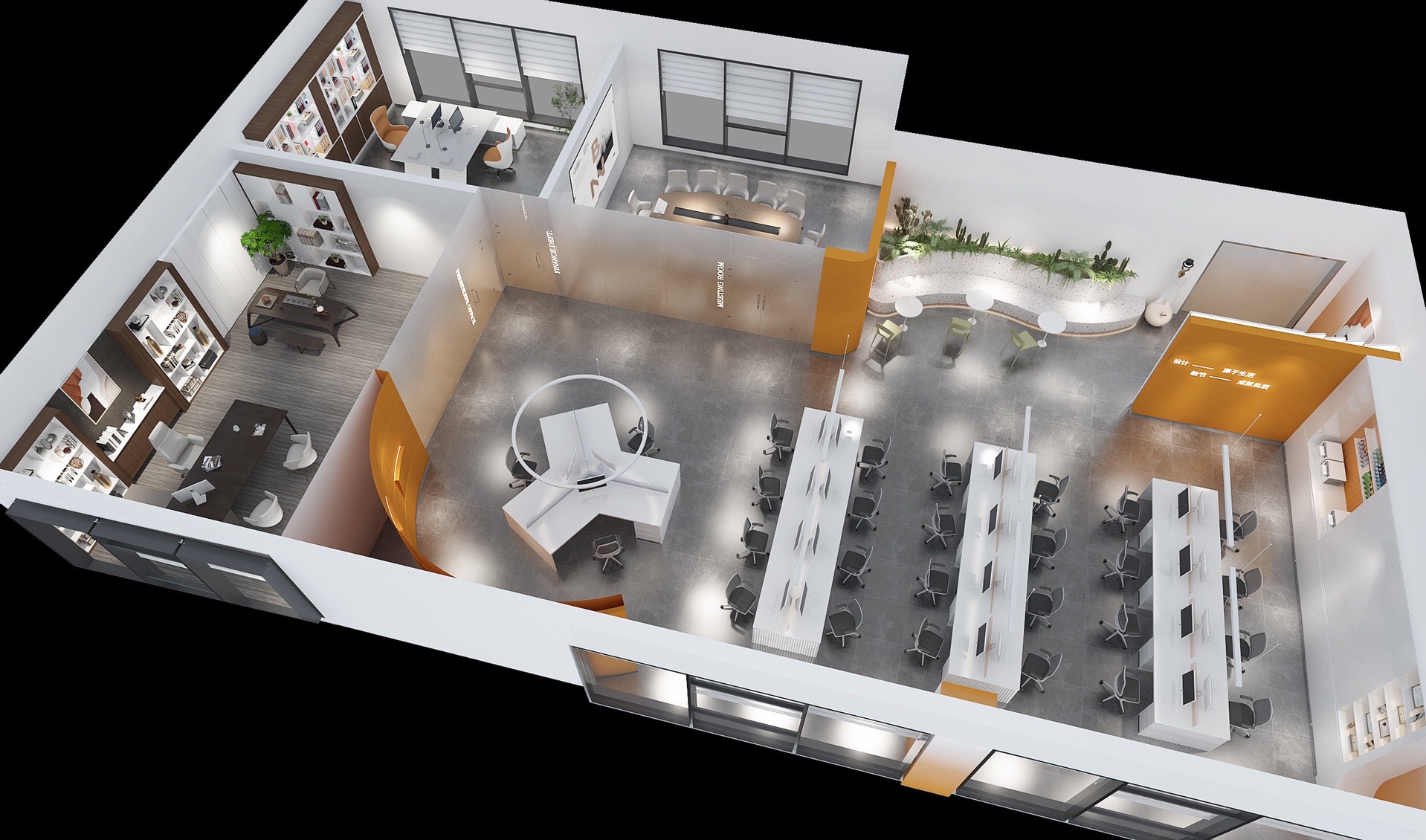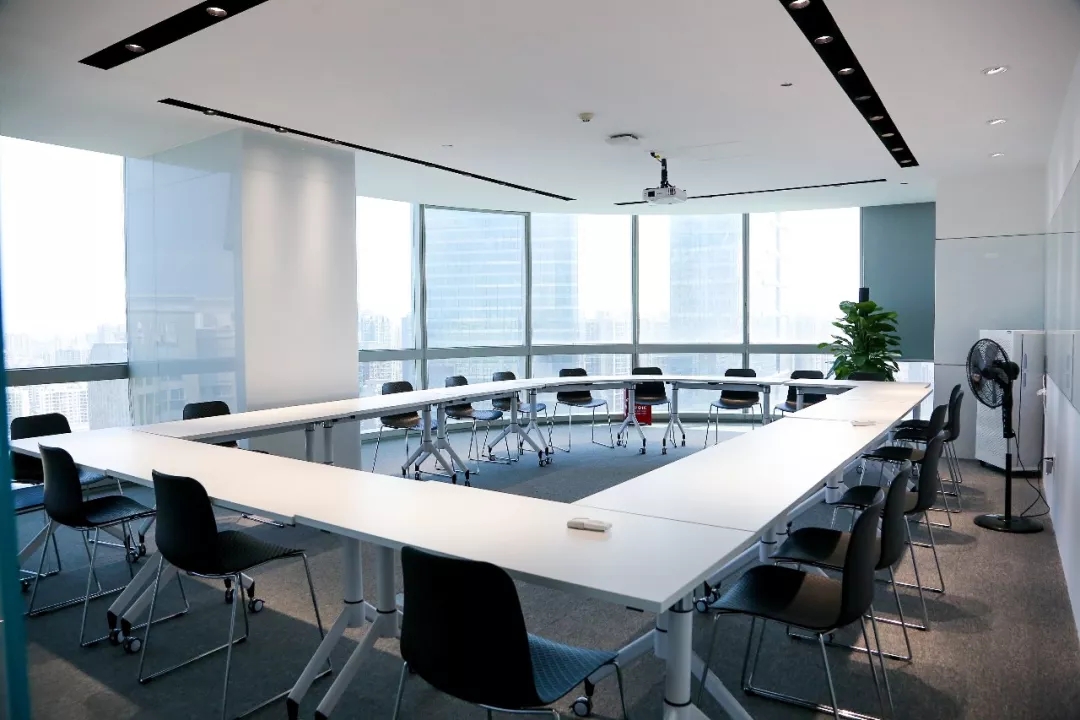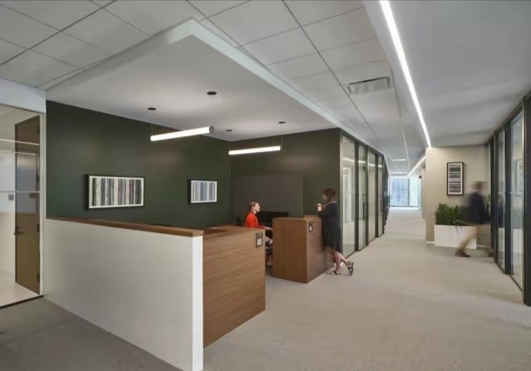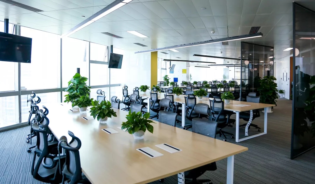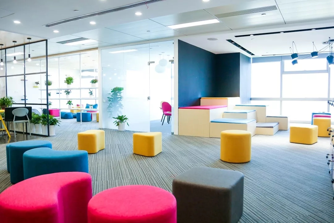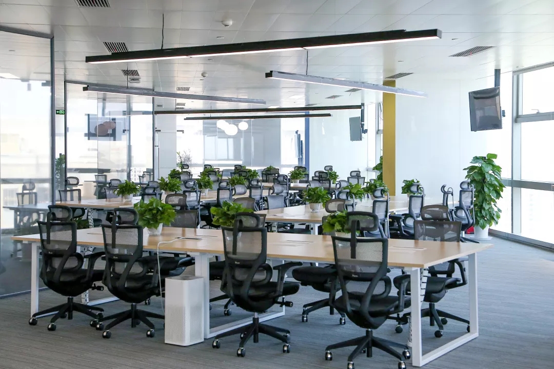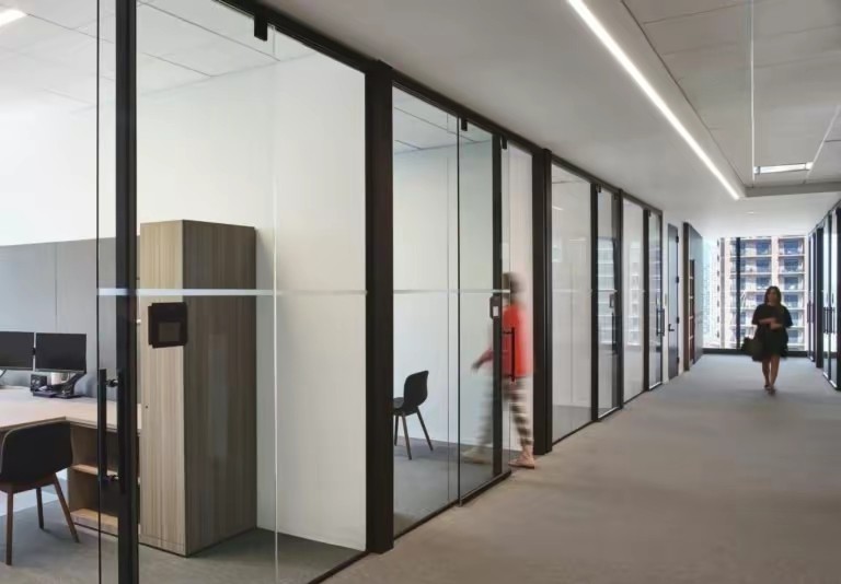 深色落地玻璃隔断从空间上分割了公共过道和工作区,同时可以作为员工小组讨论的写字板。