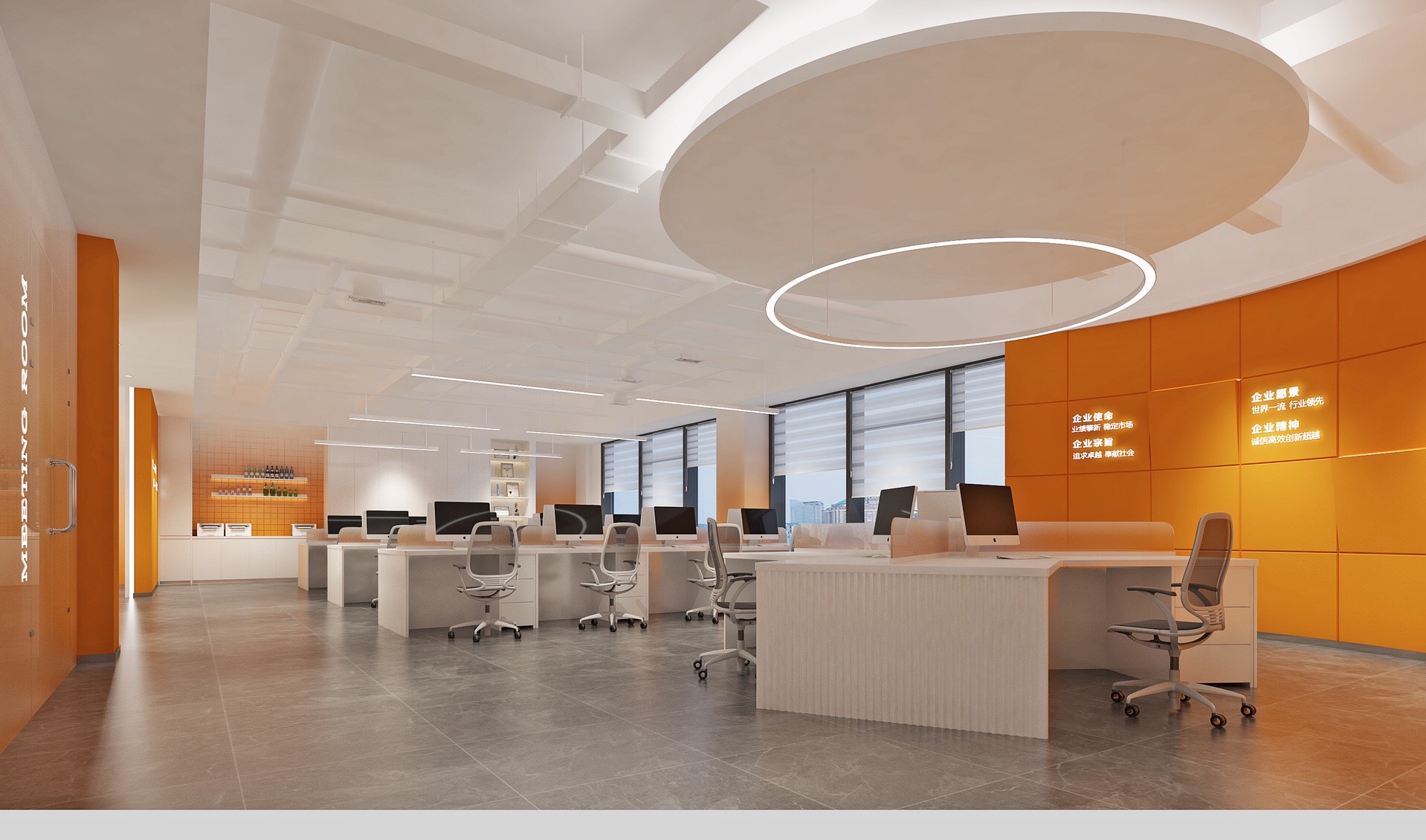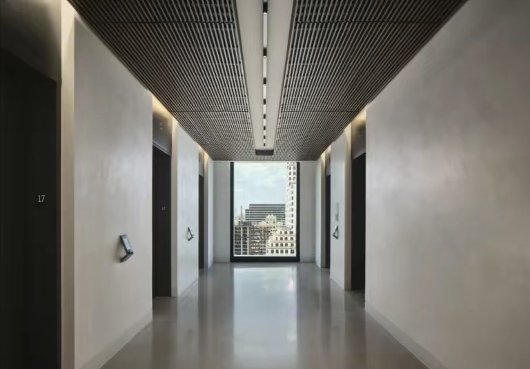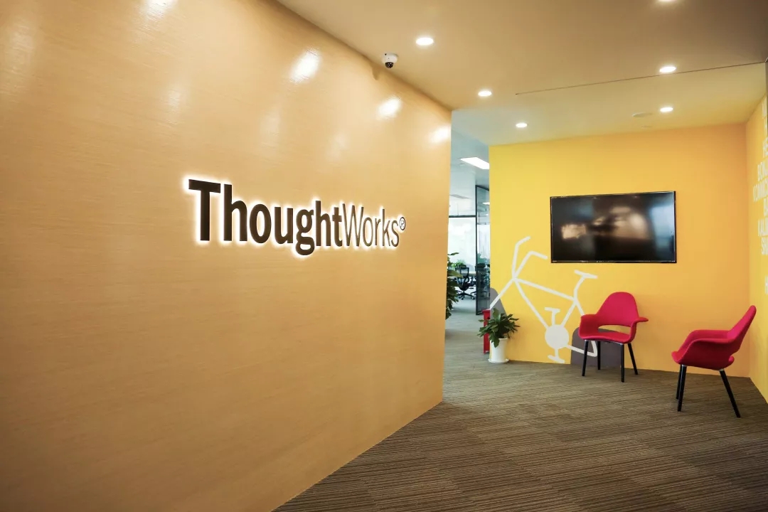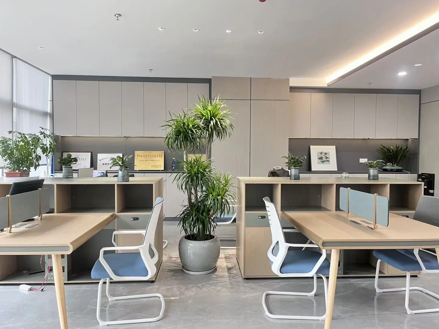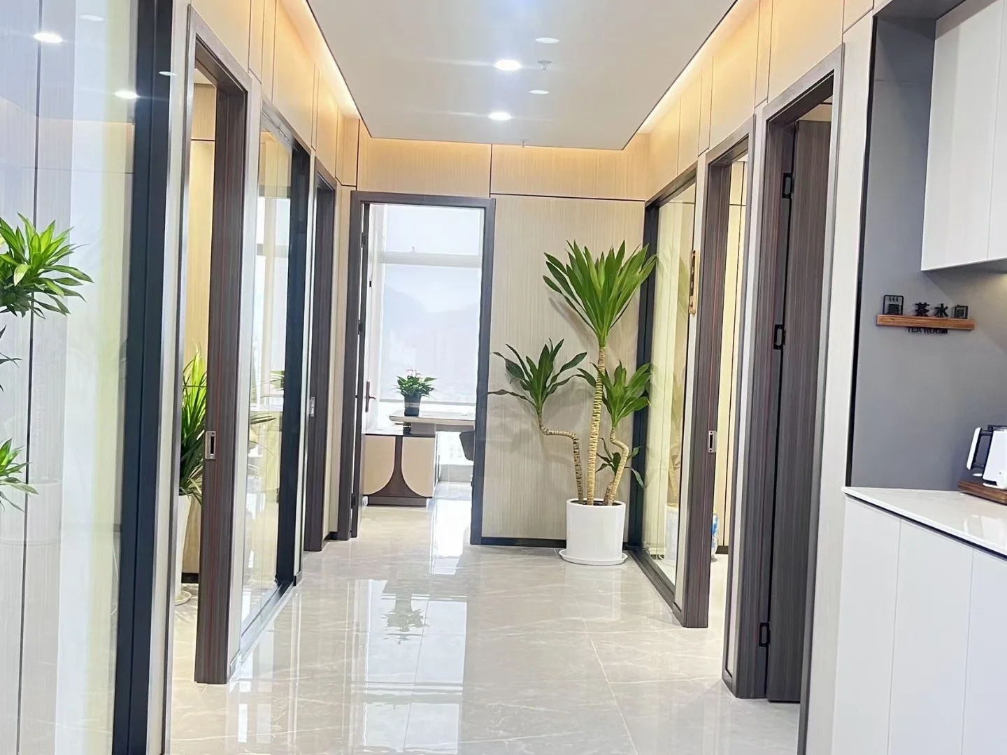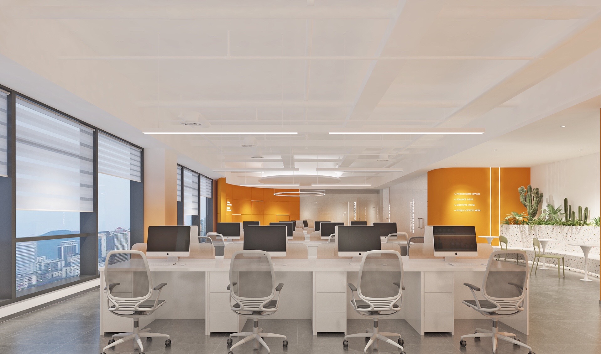 深色落地玻璃隔断从空间上分割了公共过道和工作区,同时可以作为员工小组讨论的写字板。