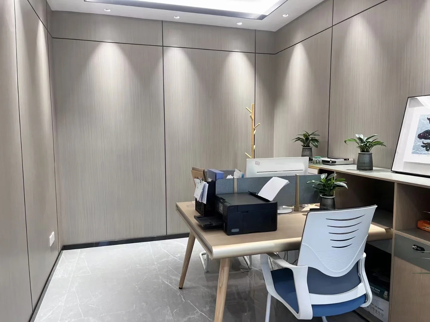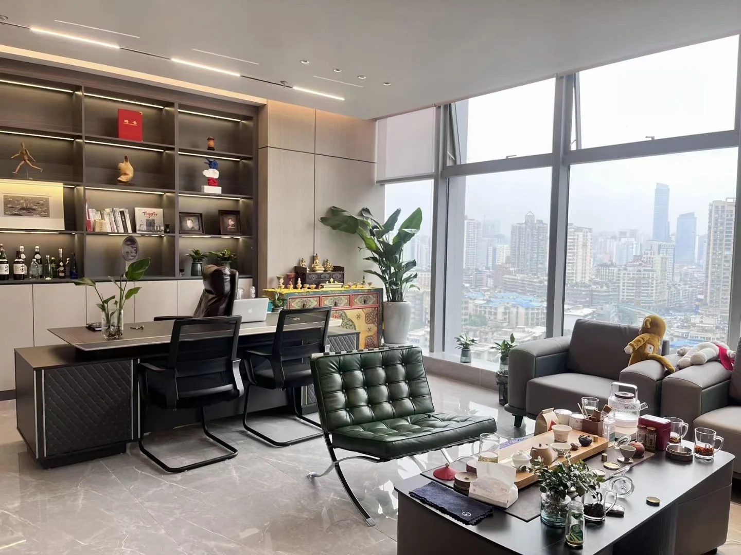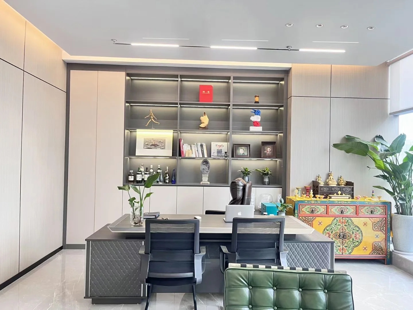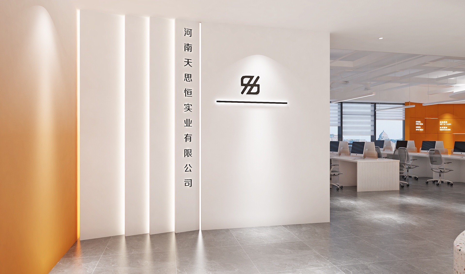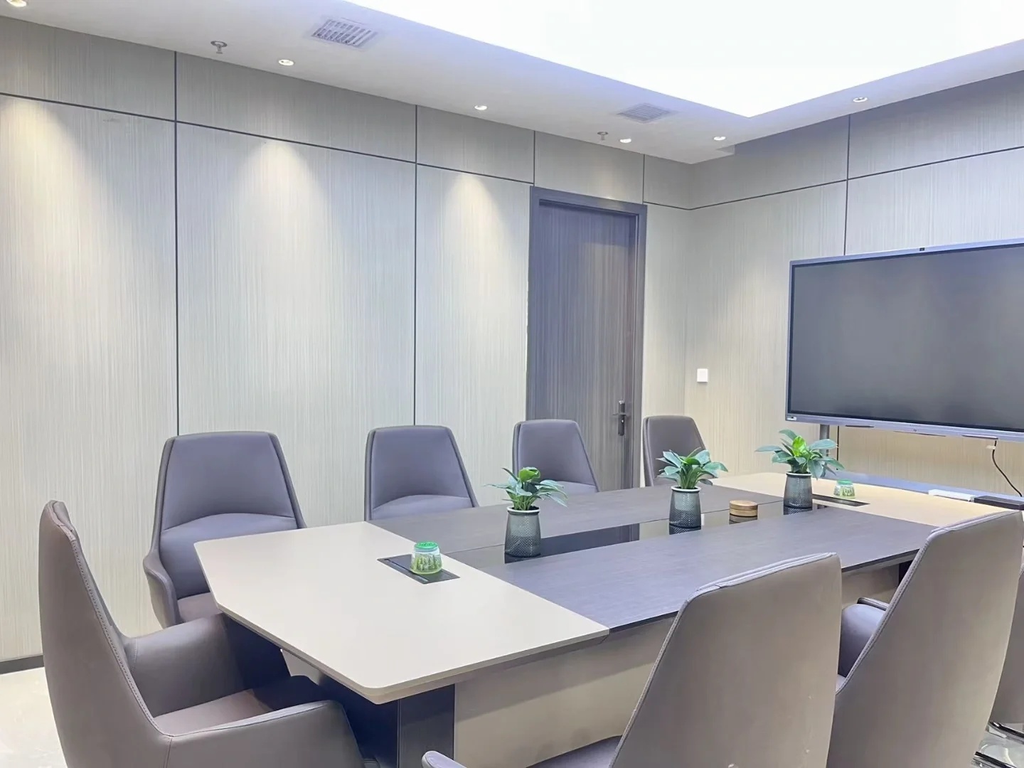 深色落地玻璃隔断从空间上分割了公共过道和工作区,同时可以作为员工小组讨论的写字板。