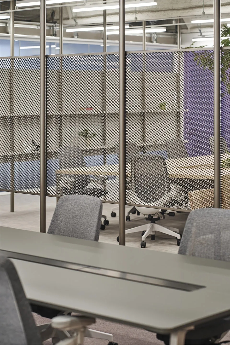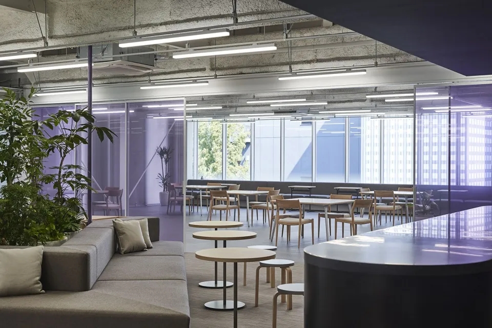 空间布局的颜色选择了公司标志性的紫色、原木色和黑色作为参照点,其余部分则尽量使用了中性调的浅灰色。不同高度的座椅也让员工们能够使用不同的方式进行办公。